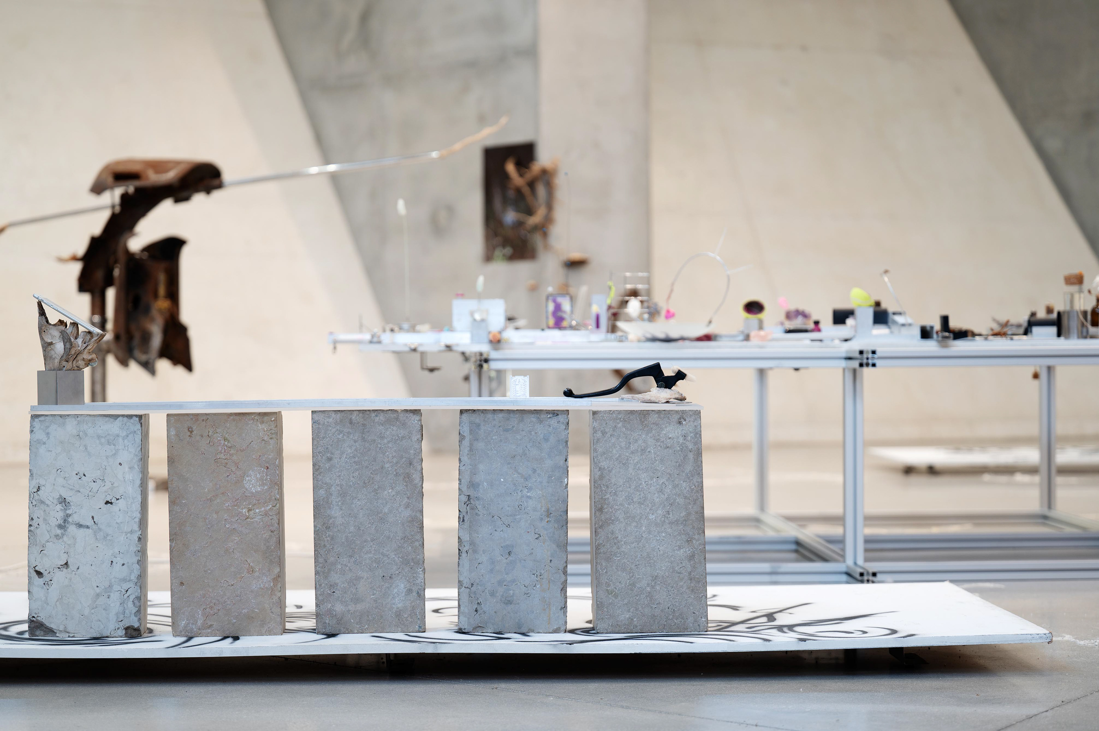 installation, assemblages sculpturaux, dimensions variables, fragments glanés, tirages photographiques, dessins, matériel électronique de récupération, mobilier emprunté, gravier de chantier, peinture aérosol