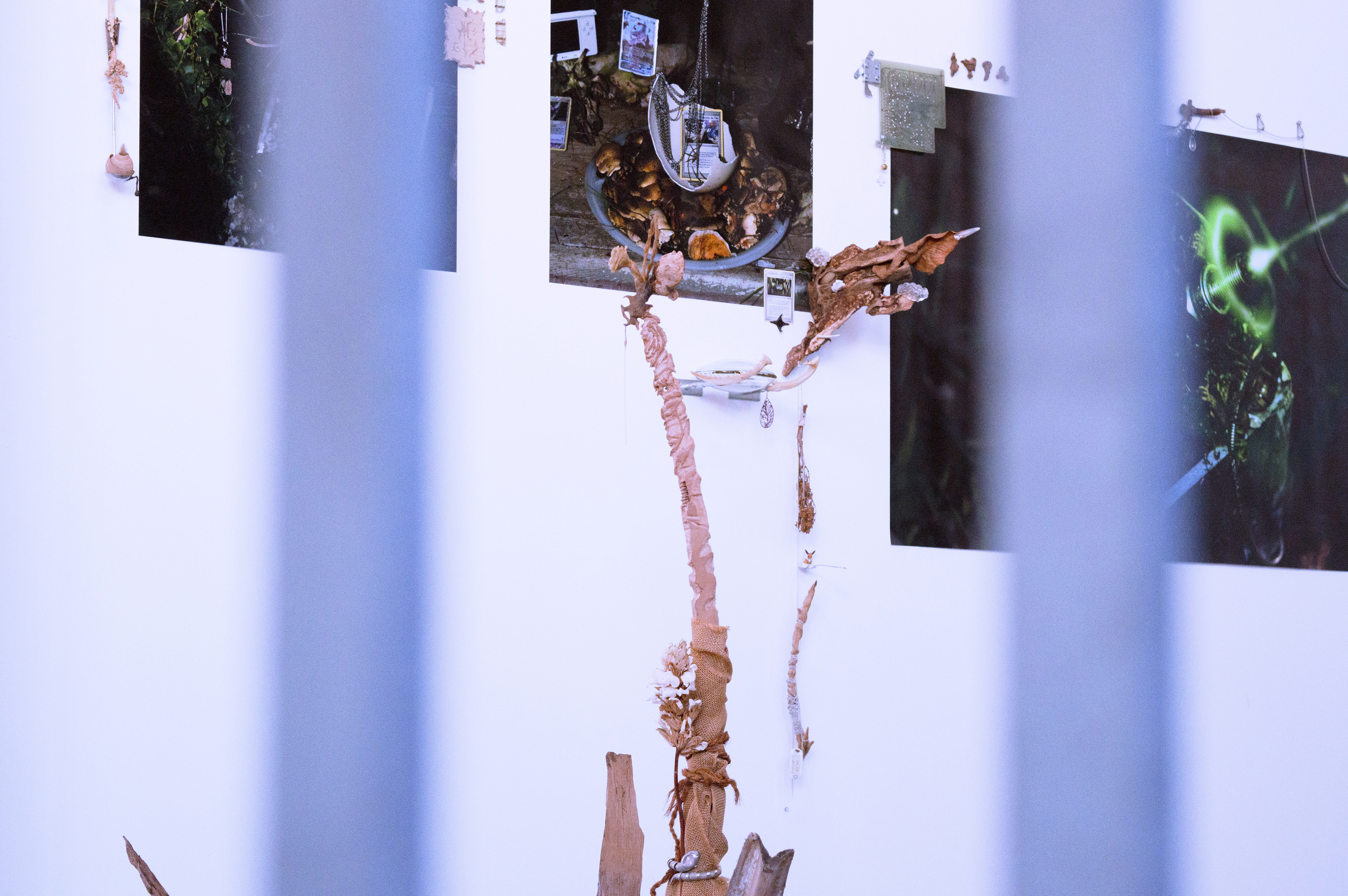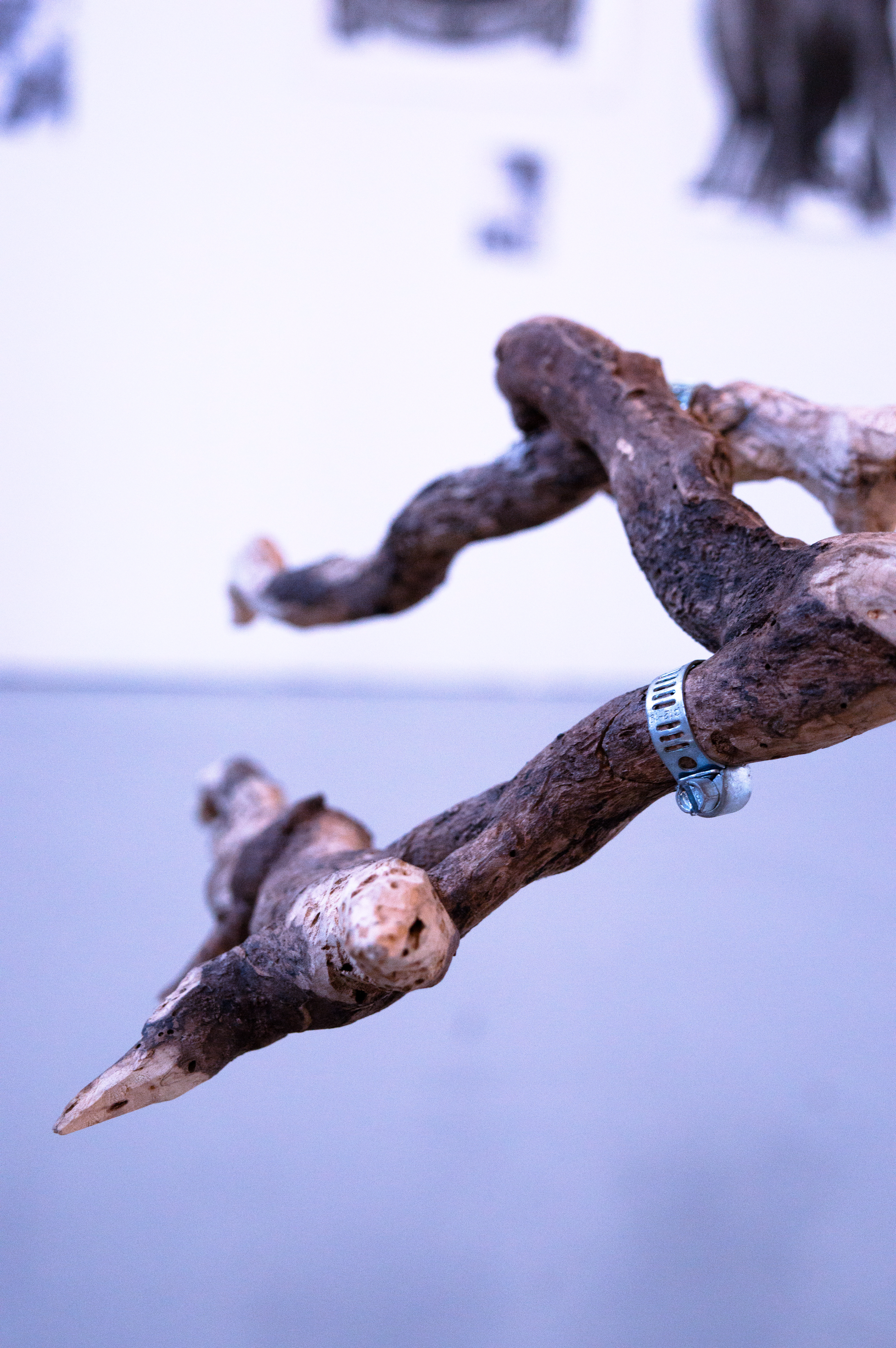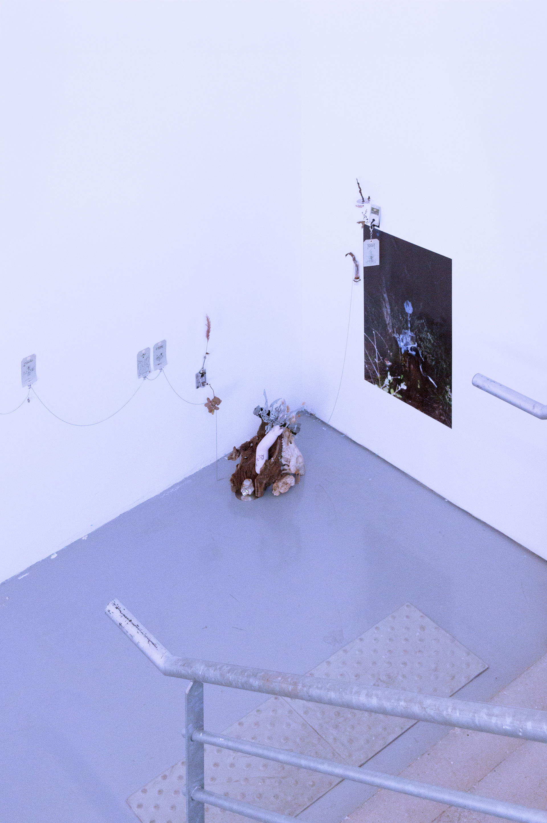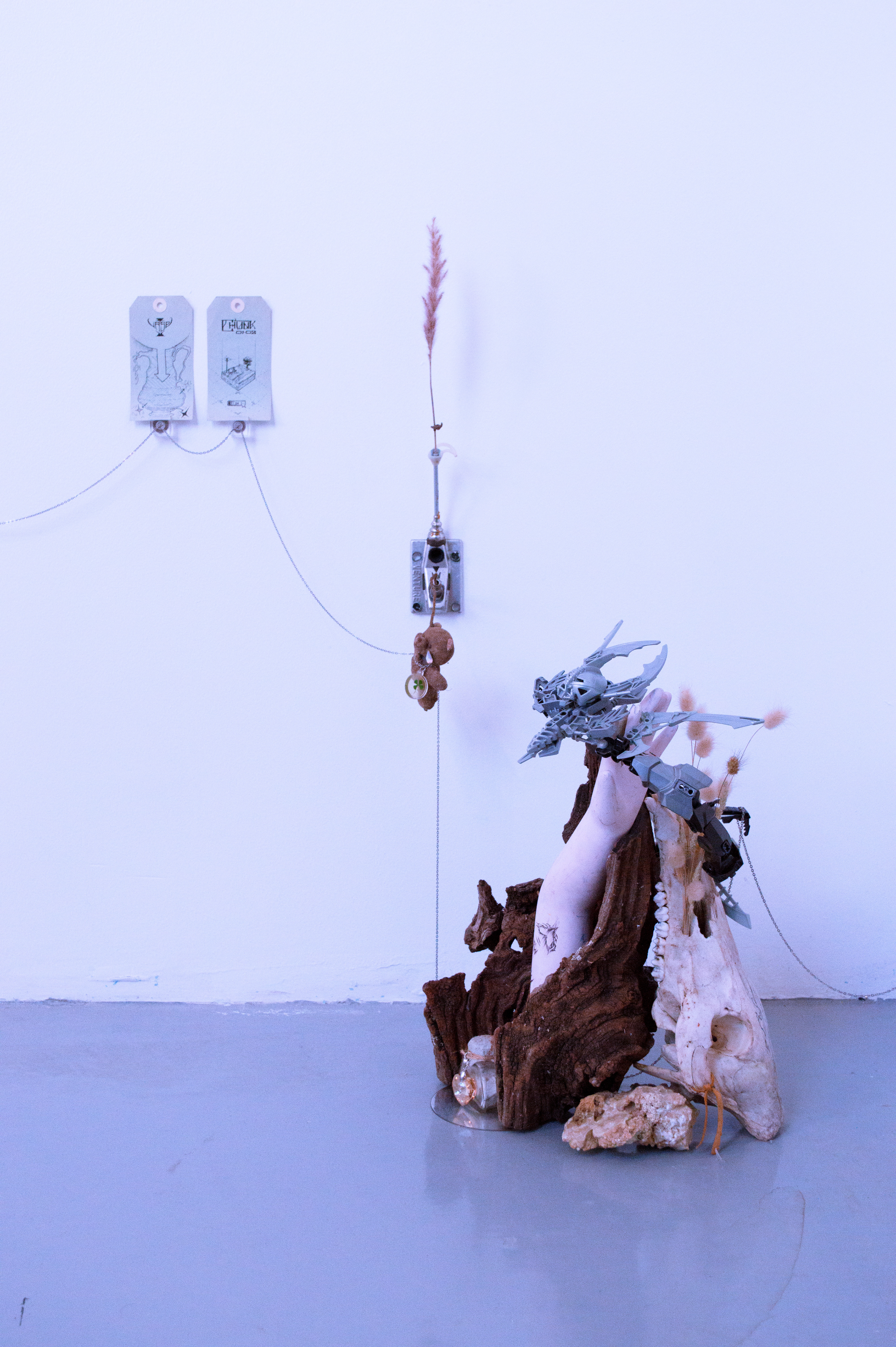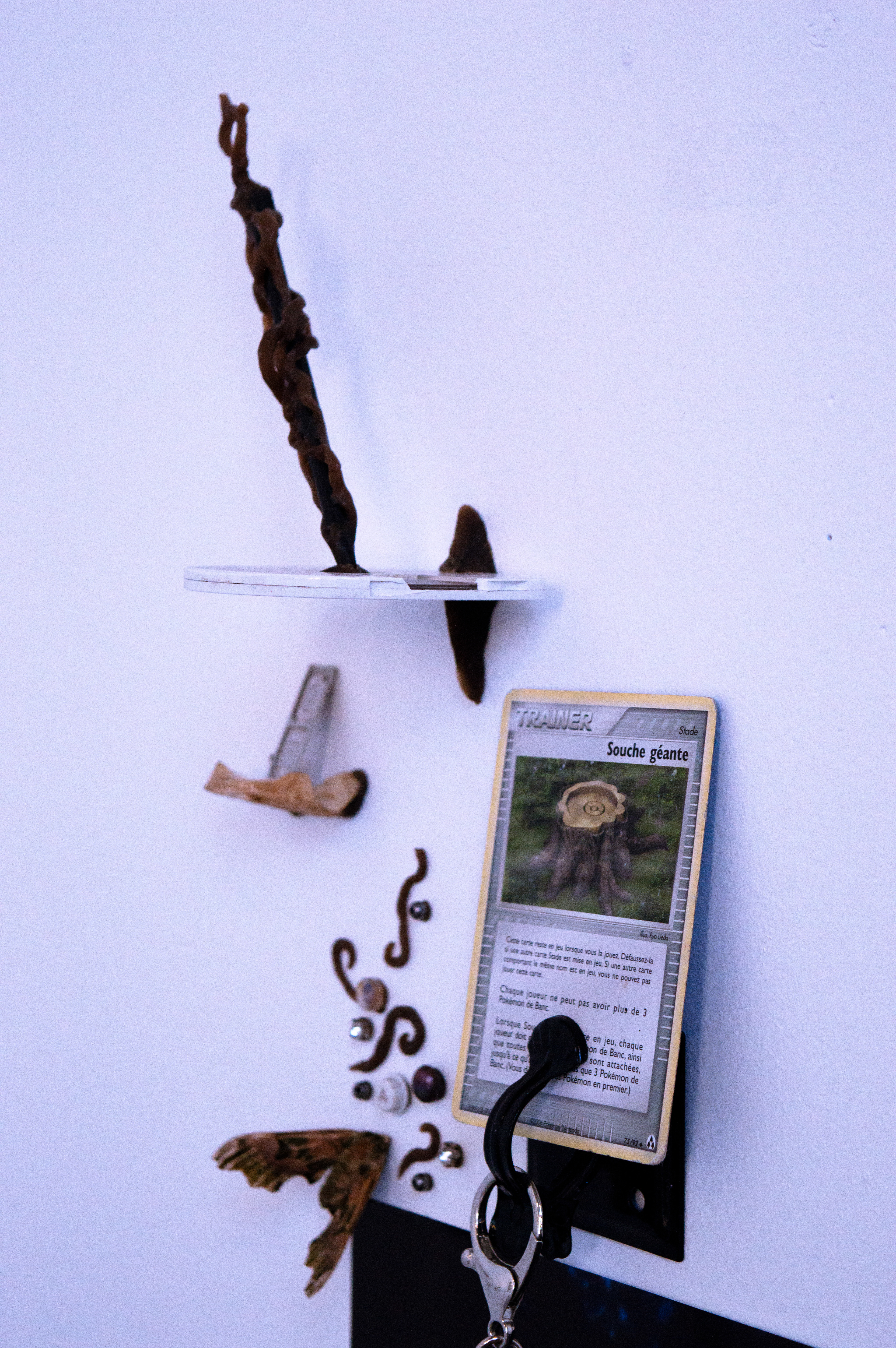 L’installation constitue une adaptation de mon projet de diplôme Bebas Maon après sa sélection par le jury et les curateur.ices de la manifestation Art Émergence. L’accrochage consiste en une multitude de compositions d’objets glanés ou issus de dons qui jaillissent des tirages extraits d’une série de 25 photographies. À leurs côtés, les sculptures de la série Fables se déploient dans l’espace transitoire qui mène du rez-de-chaussé à la mezzanine de la Chaufferie de la Fondation Fiminco. Le choix des photographies sélectionnées s’est fait d’un commun accord avec les curateur.ices Salomé Fau, Temitayo Olalekan et Alexis Hardy. Celles-ci ont ainsi déterminé la nature des fragments qui se retrouveraient dans l’installation. De cette façon, j’ai pu composer dans l’espace sur plusieurs jours et faire dialoguer les matériaux et leurs caractéristiques pour réactiver les contextes révolus des installations visibles dans les photographies. Ainsi une nouvelle lecture s’opère au travers de gestes adaptatifs, de recherches relationnelles dans les fragments, mais aussi des rencontres matériologiques propres à l’espace et son ambiance.