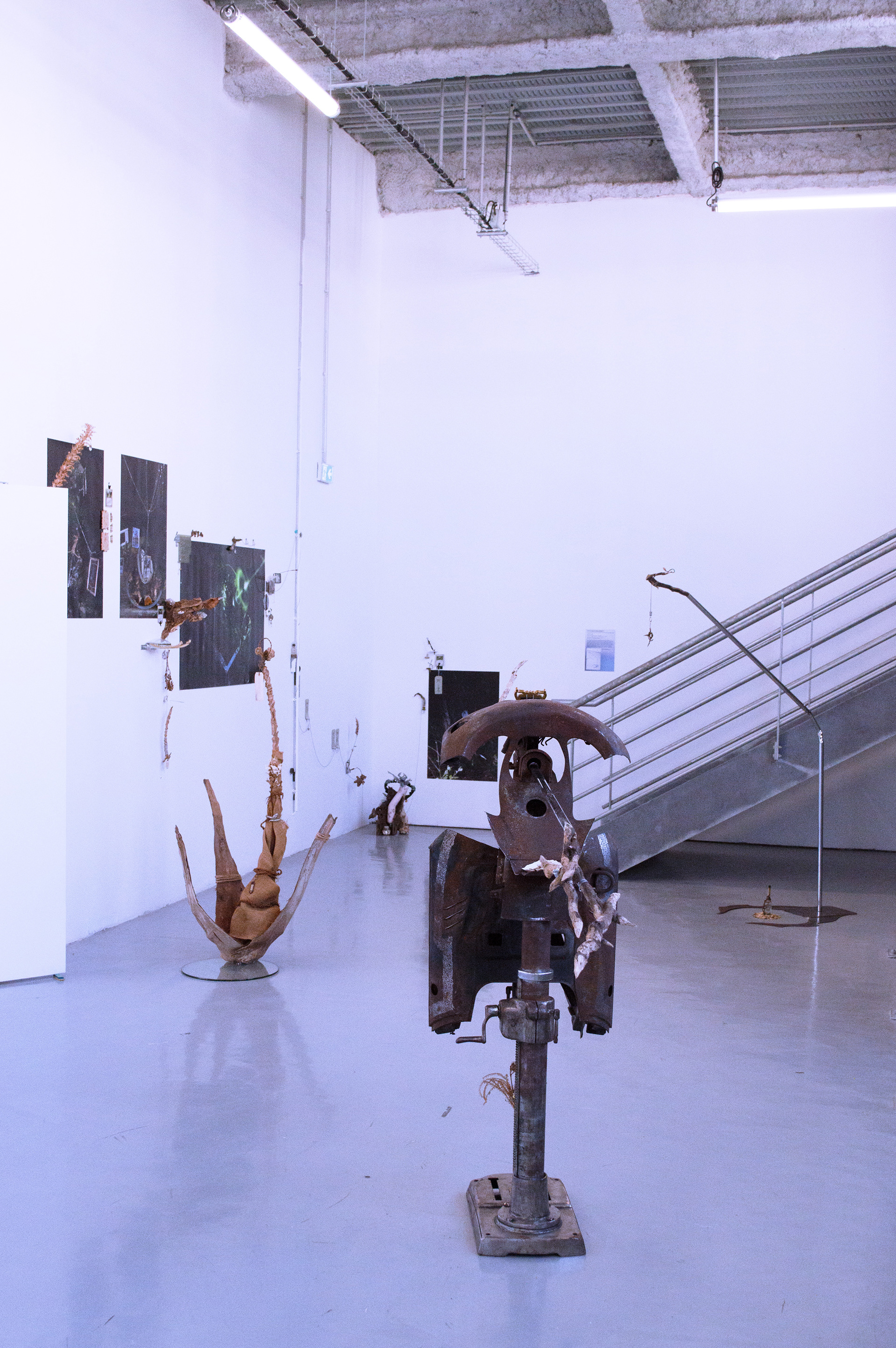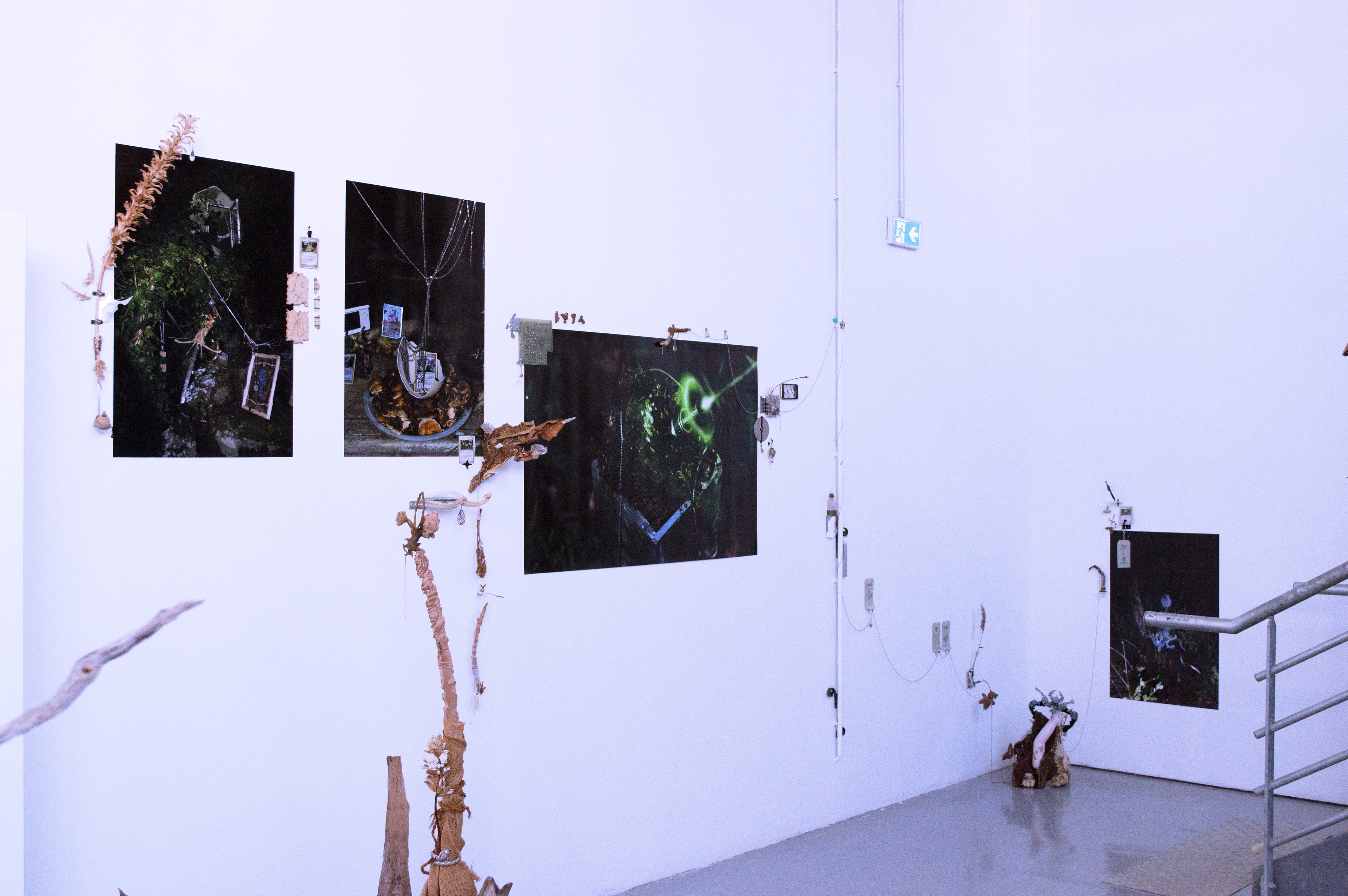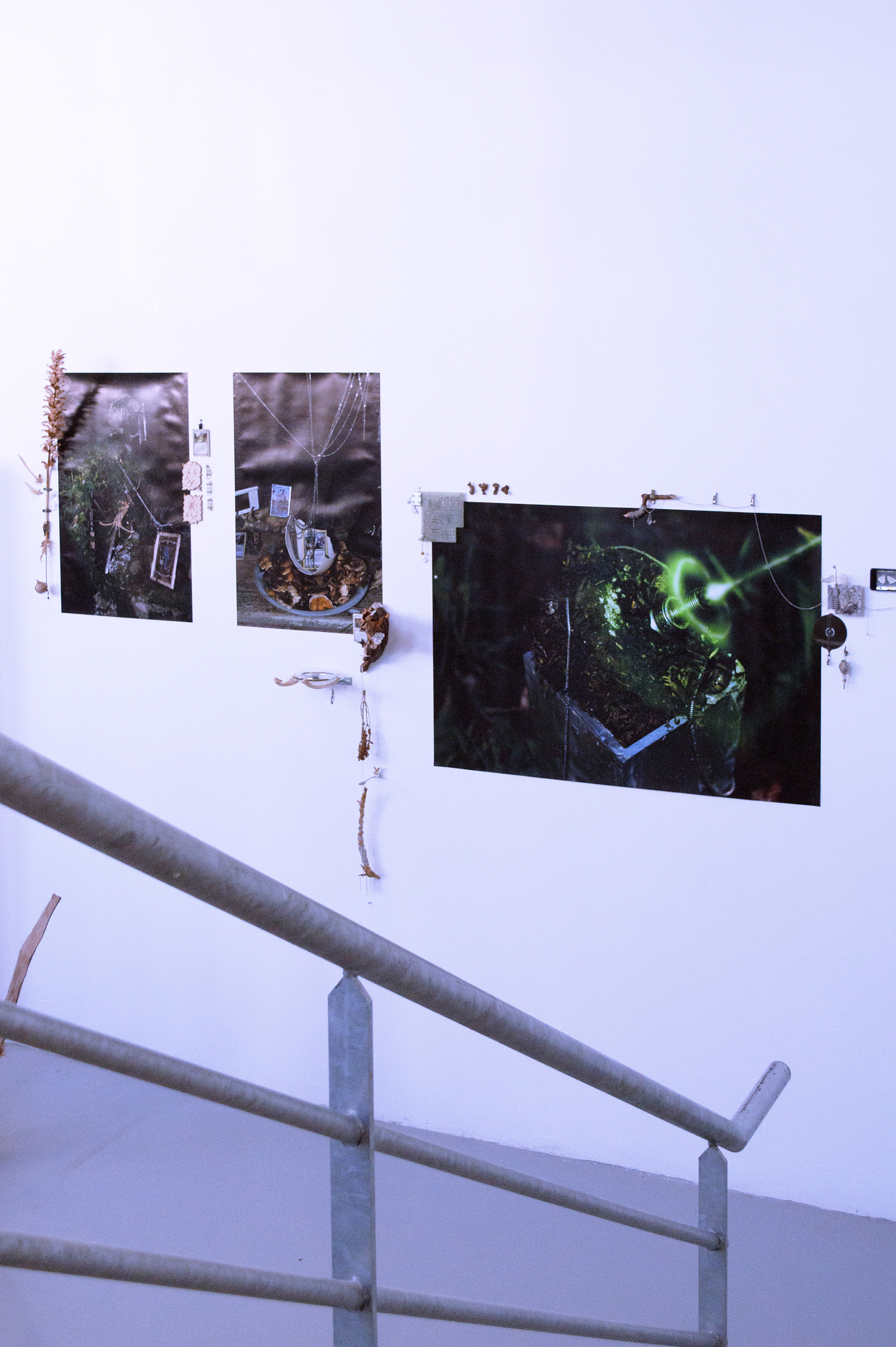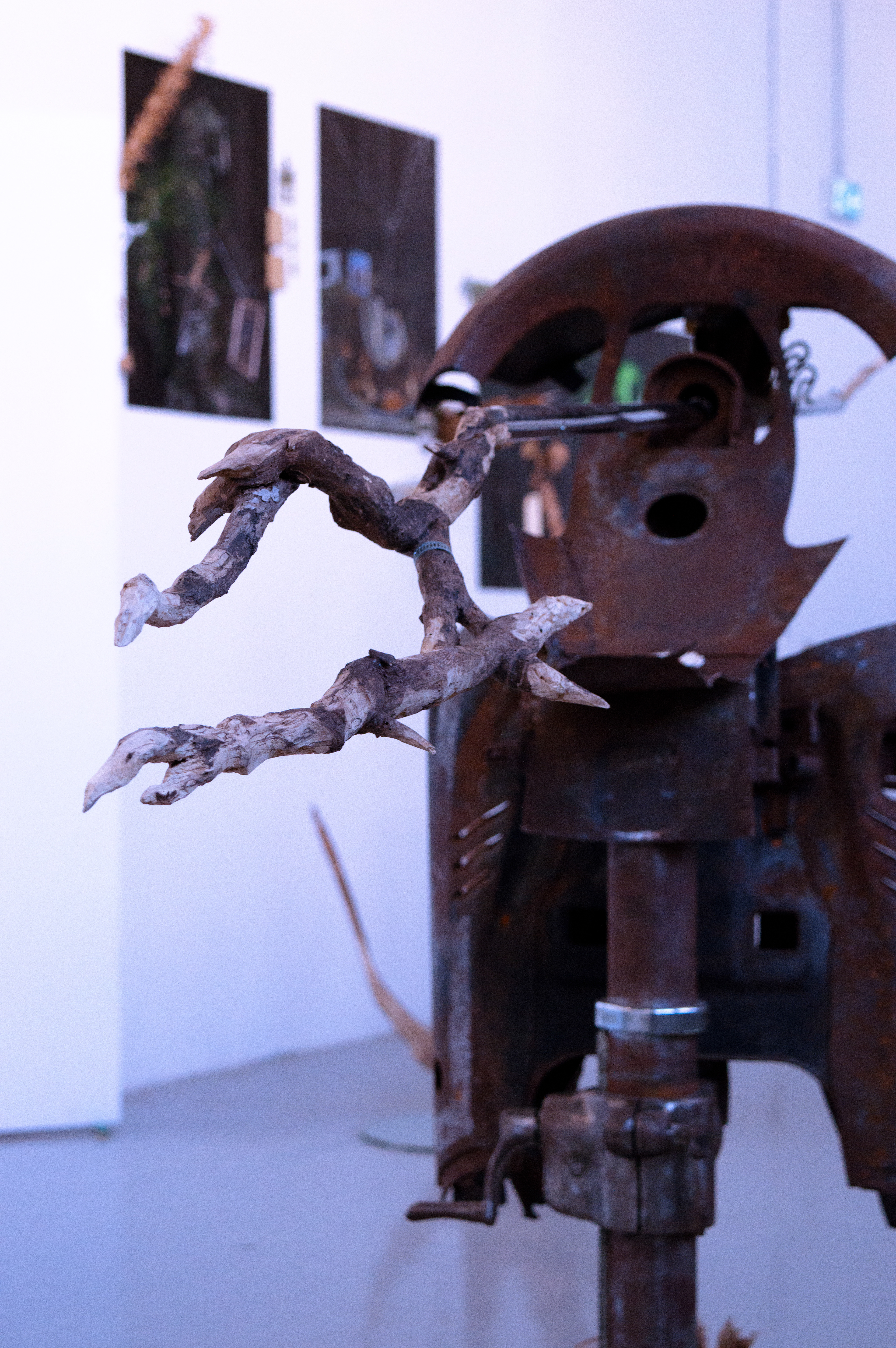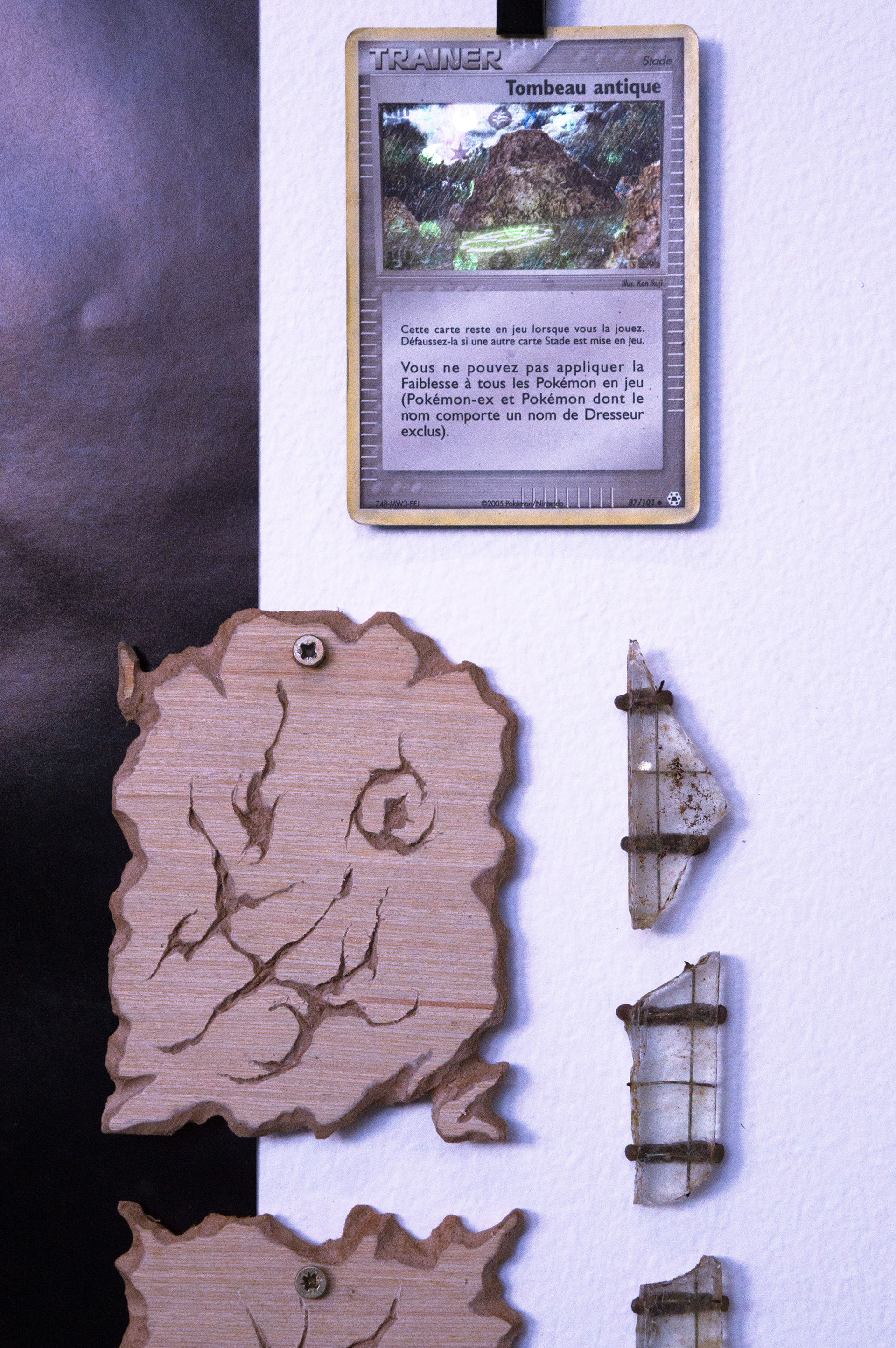 L’installation constitue une adaptation de mon projet de diplôme Bebas Maon après sa sélection par le jury et les curateur.ices de la manifestation Art Émergence. L’accrochage consiste en une multitude de compositions d’objets glanés ou issus de dons qui jaillissent des tirages extraits d’une série de 25 photographies. À leurs côtés, les sculptures de la série Fables se déploient dans l’espace transitoire qui mène du rez-de-chaussé à la mezzanine de la Chaufferie de la Fondation Fiminco. Le choix des photographies sélectionnées s’est fait d’un commun accord avec les curateur.ices Salomé Fau, Temitayo Olalekan et Alexis Hardy. Celles-ci ont ainsi déterminé la nature des fragments qui se retrouveraient dans l’installation. De cette façon, j’ai pu composer dans l’espace sur plusieurs jours et faire dialoguer les matériaux et leurs caractéristiques pour réactiver les contextes révolus des installations visibles dans les photographies. Ainsi une nouvelle lecture s’opère au travers de gestes adaptatifs, de recherches relationnelles dans les fragments, mais aussi des rencontres matériologiques propres à l’espace et son ambiance.
