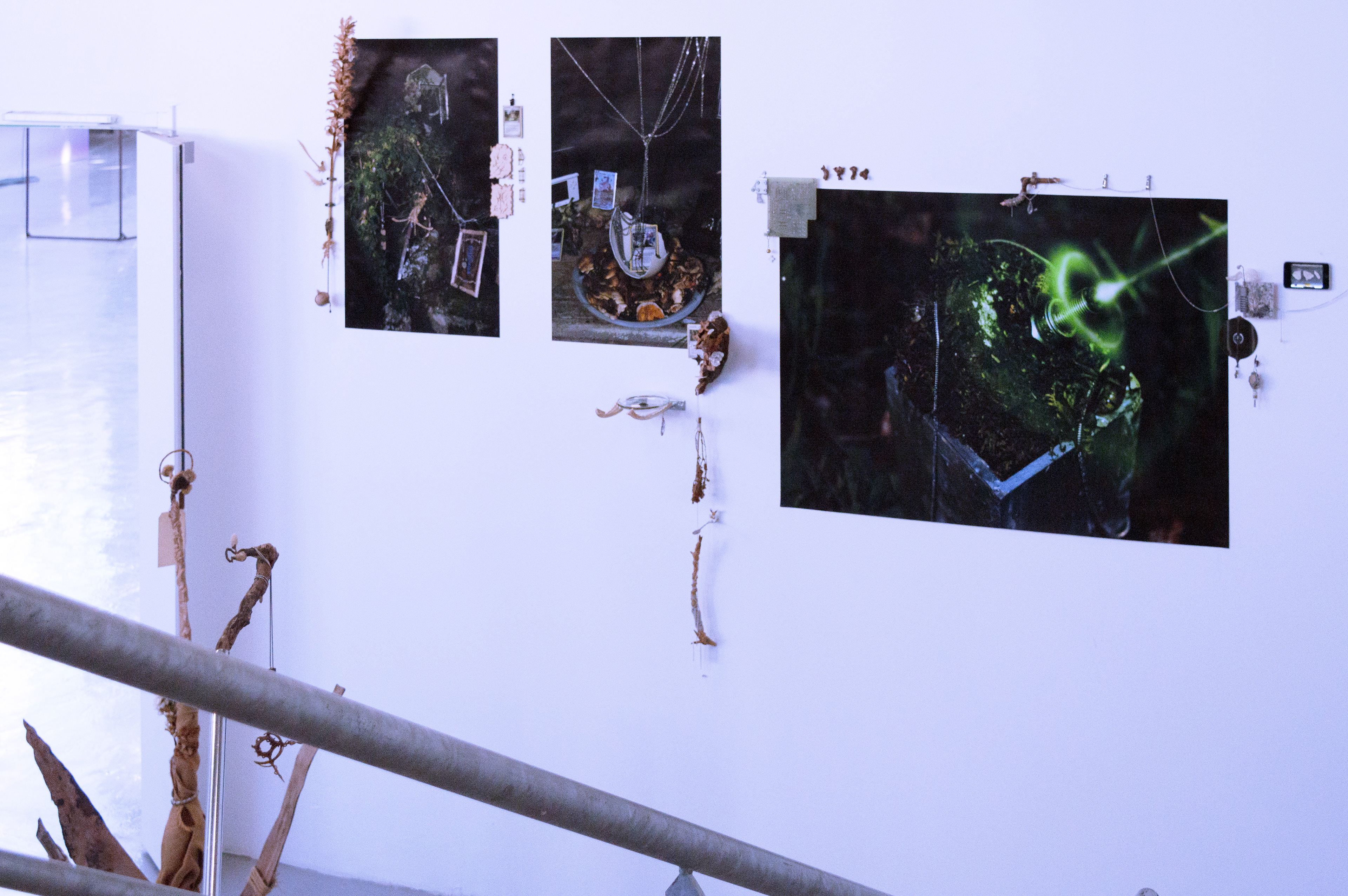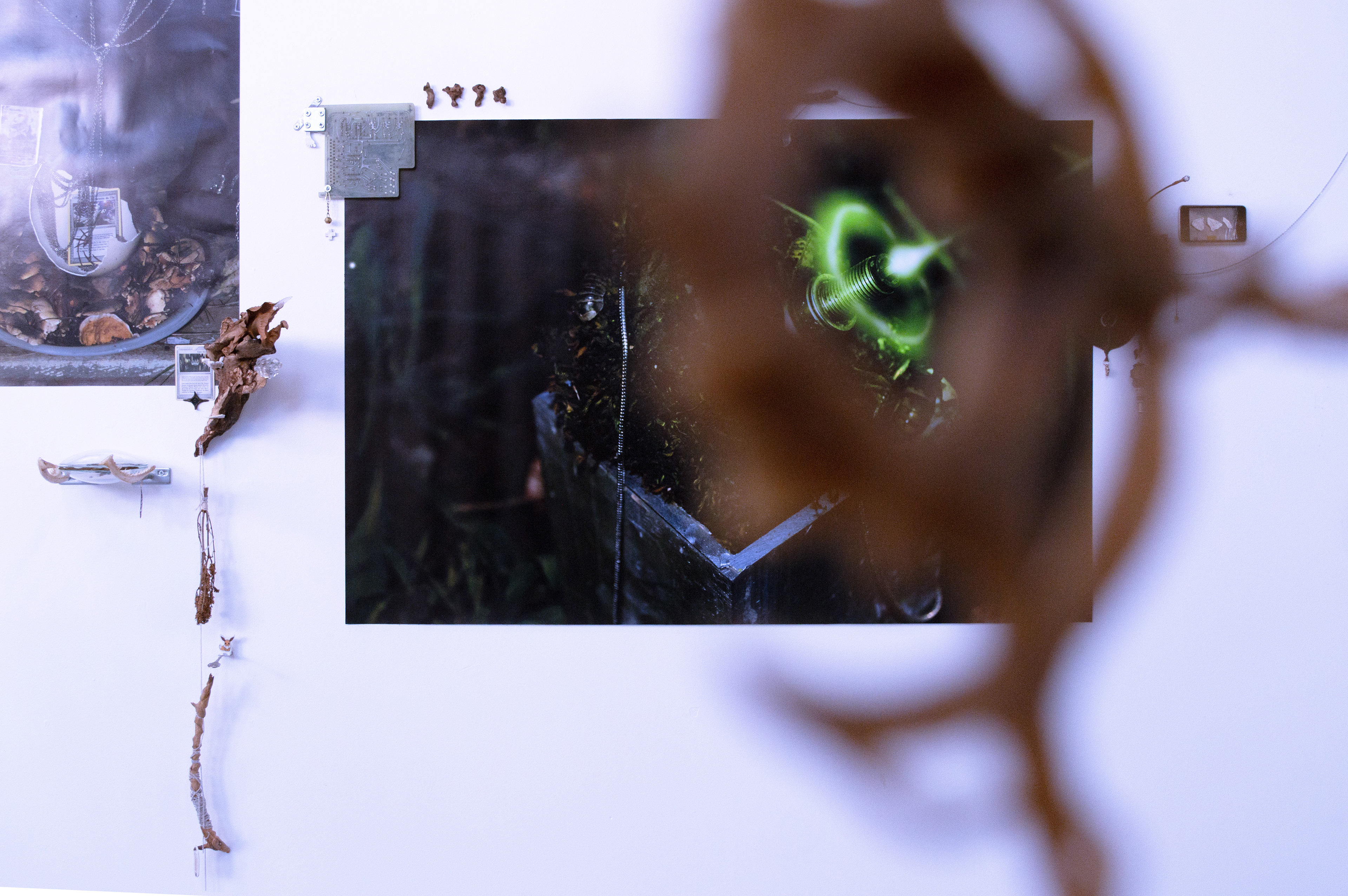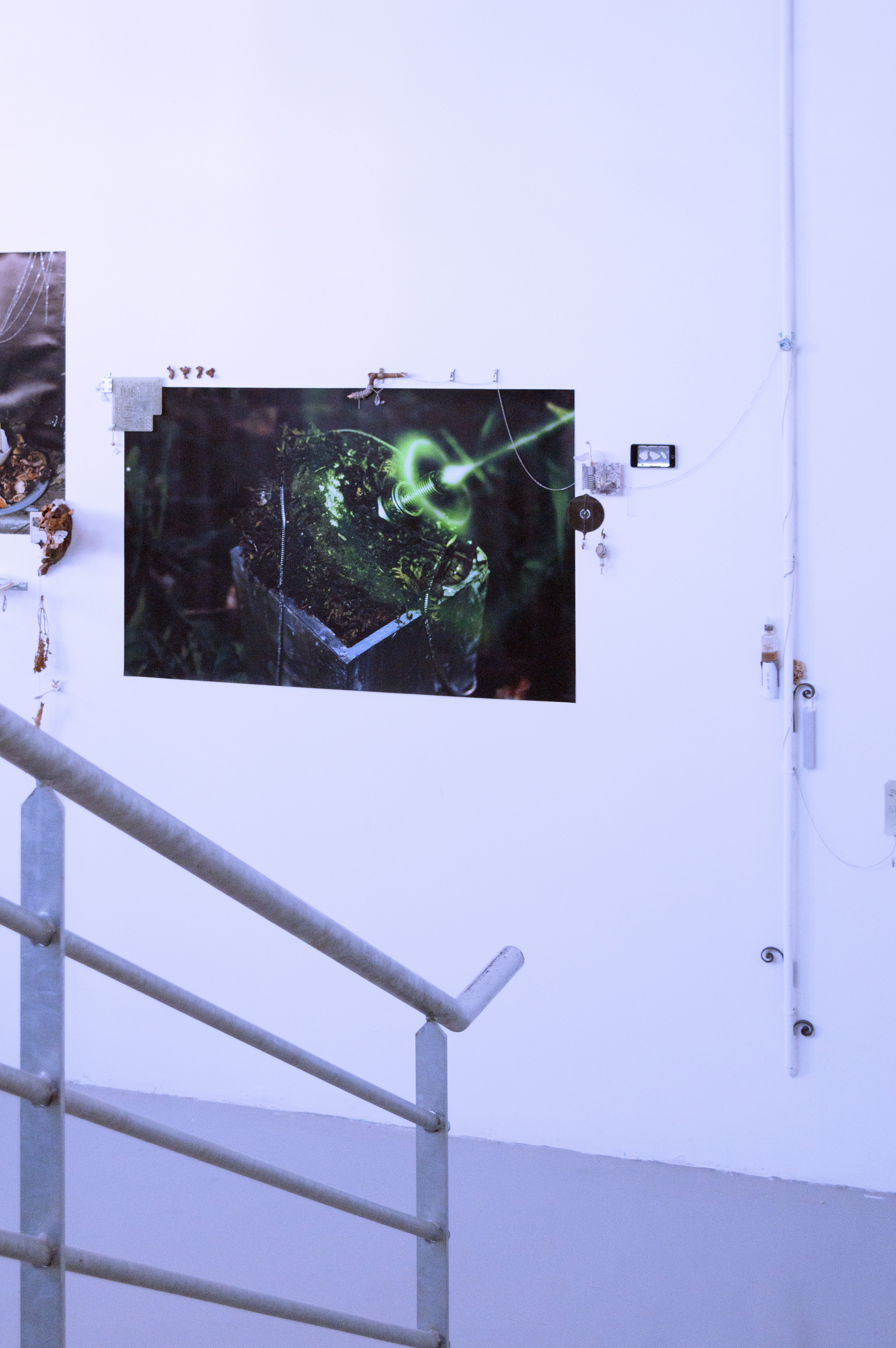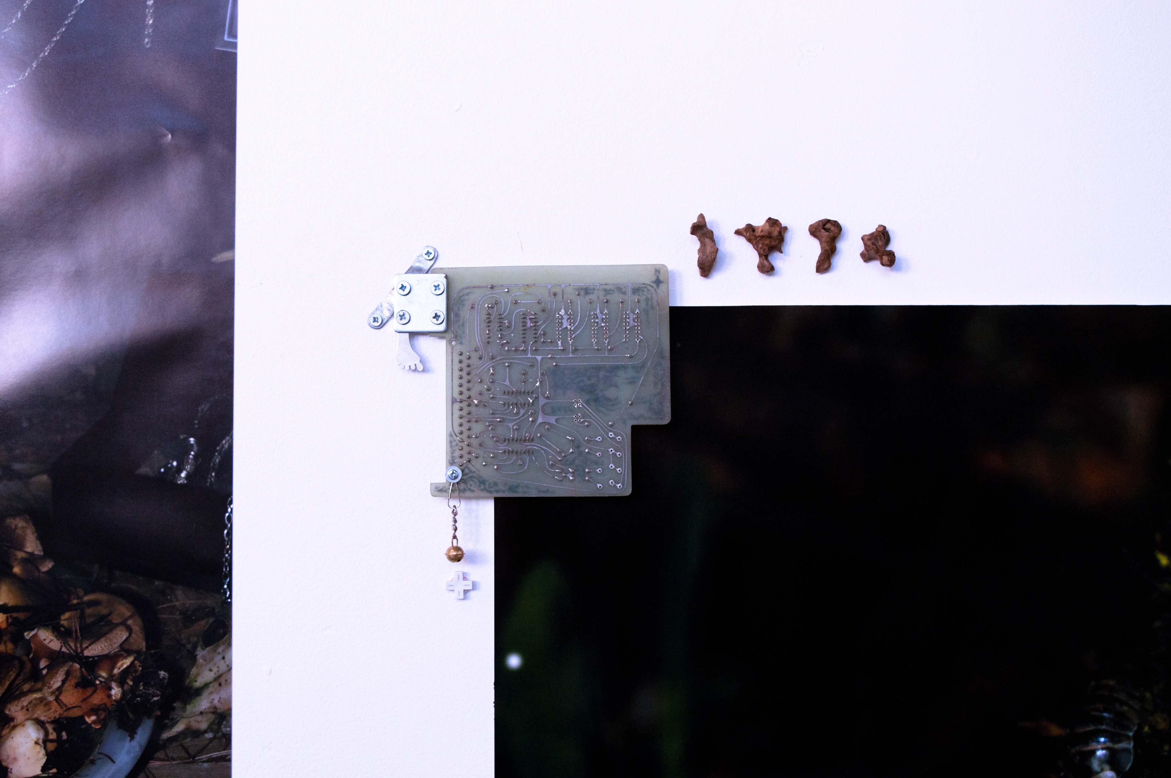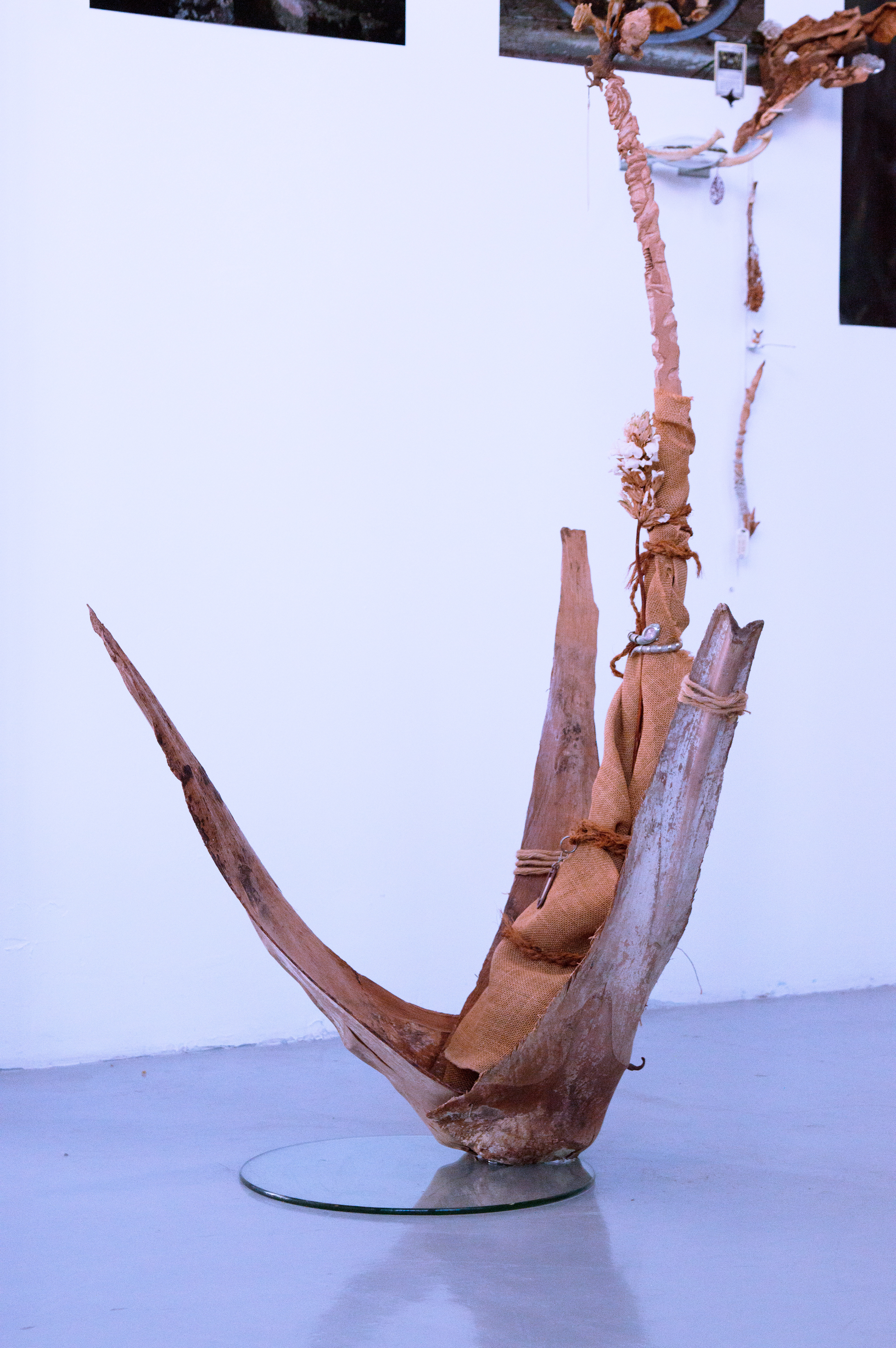 L’installation constitue une adaptation de mon projet de diplôme Bebas Maon après sa sélection par le jury et les curateur.ices de la manifestation Art Émergence. L’accrochage consiste en une multitude de compositions d’objets glanés ou issus de dons qui jaillissent des tirages extraits d’une série de 25 photographies. À leurs côtés, les sculptures de la série Fables se déploient dans l’espace transitoire qui mène du rez-de-chaussé à la mezzanine de la Chaufferie de la Fondation Fiminco. Le choix des photographies sélectionnées s’est fait d’un commun accord avec les curateur.ices Salomé Fau, Temitayo Olalekan et Alexis Hardy. Celles-ci ont ainsi déterminé la nature des fragments qui se retrouveraient dans l’installation. De cette façon, j’ai pu composer dans l’espace sur plusieurs jours et faire dialoguer les matériaux et leurs caractéristiques pour réactiver les contextes révolus des installations visibles dans les photographies. Ainsi une nouvelle lecture s’opère au travers de gestes adaptatifs, de recherches relationnelles dans les fragments, mais aussi des rencontres matériologiques propres à l’espace et son ambiance.