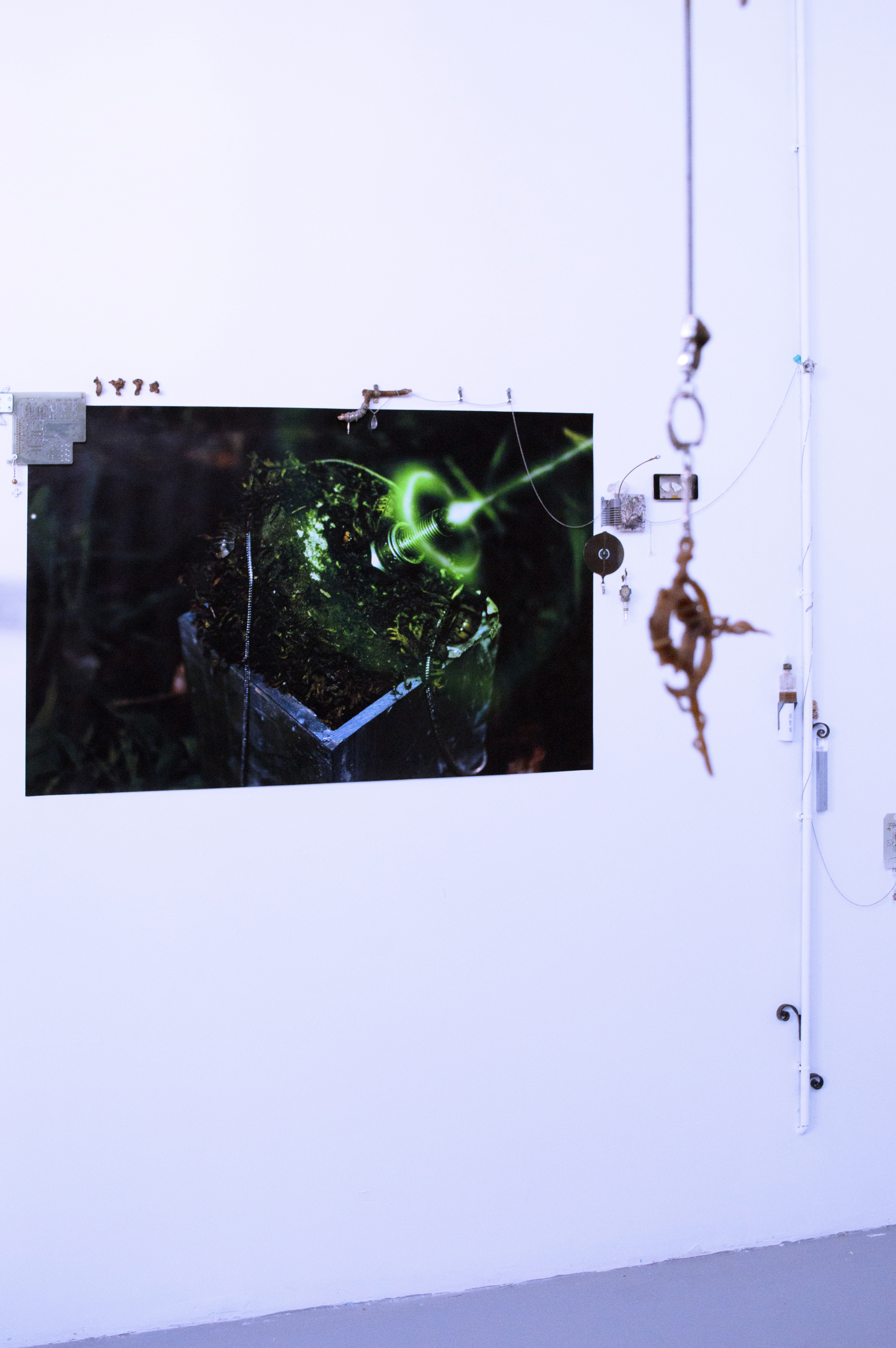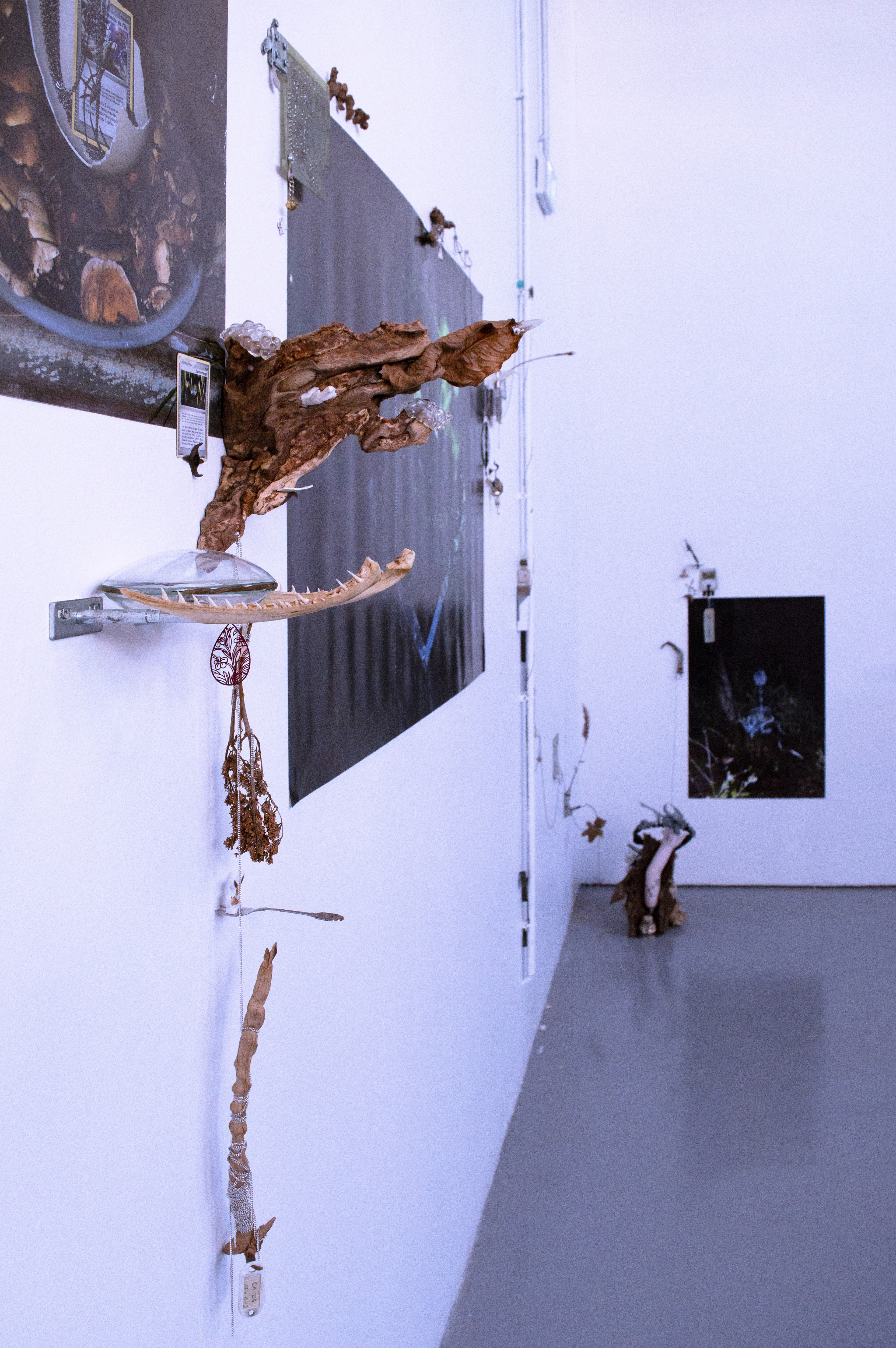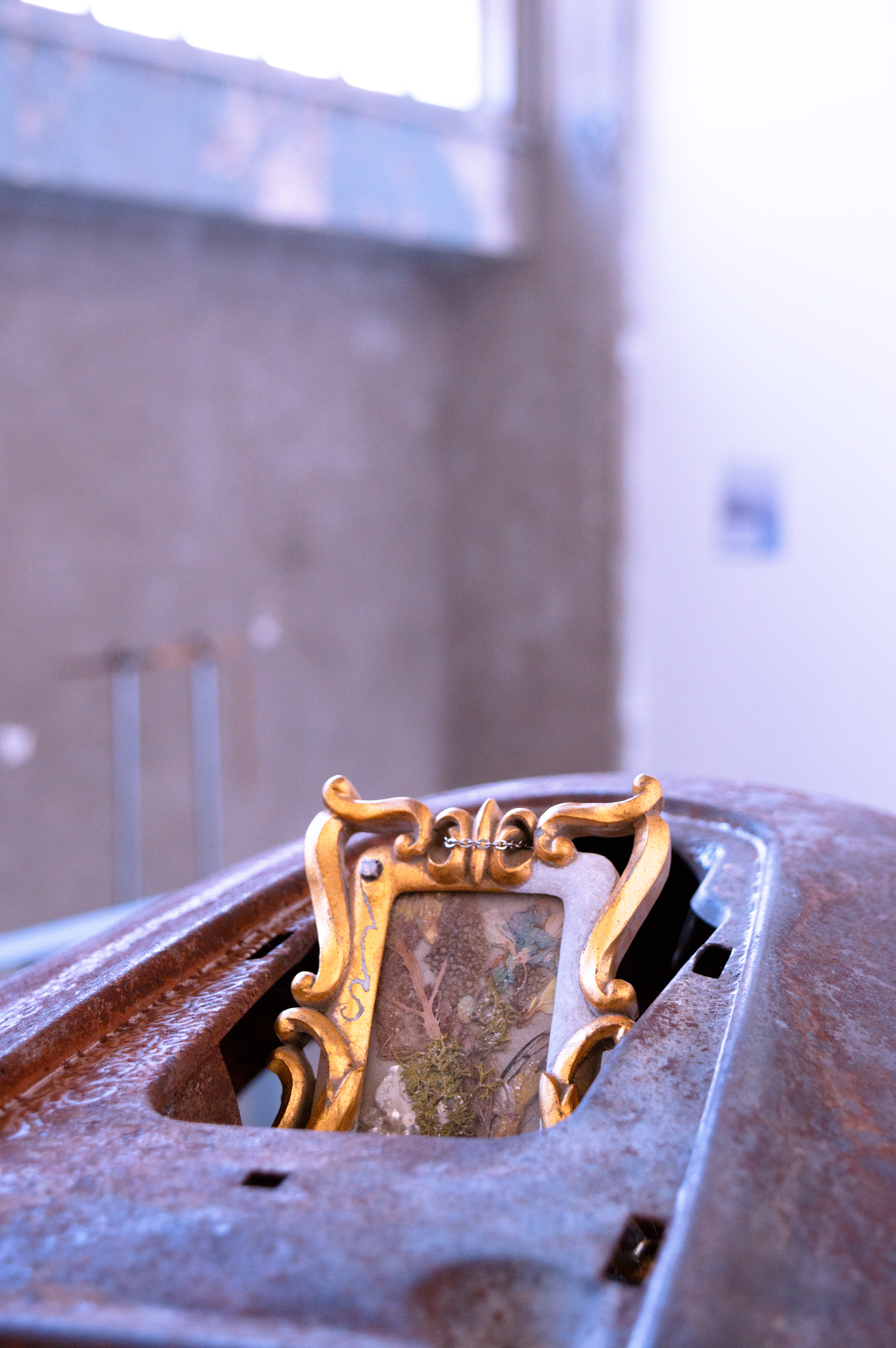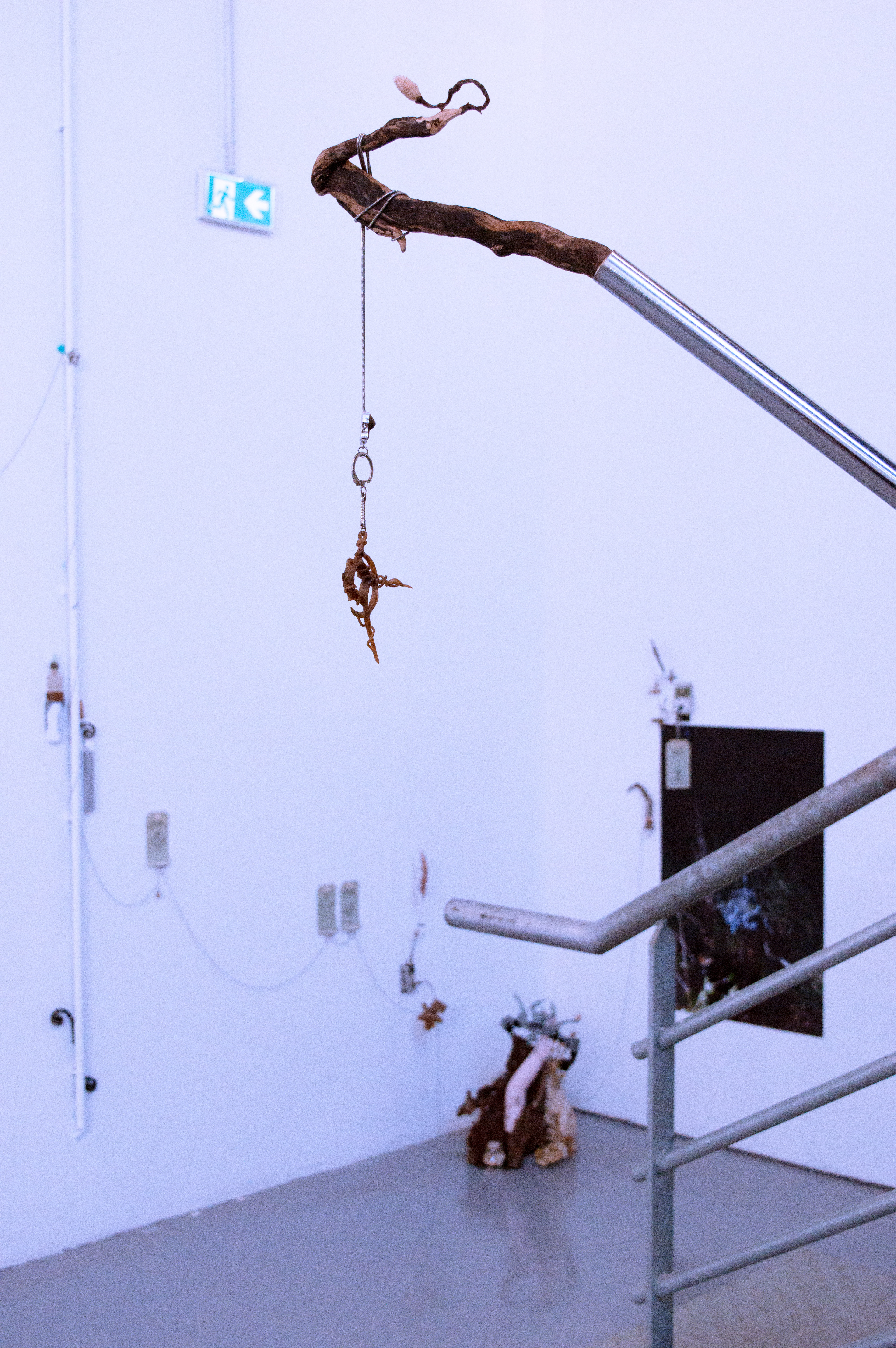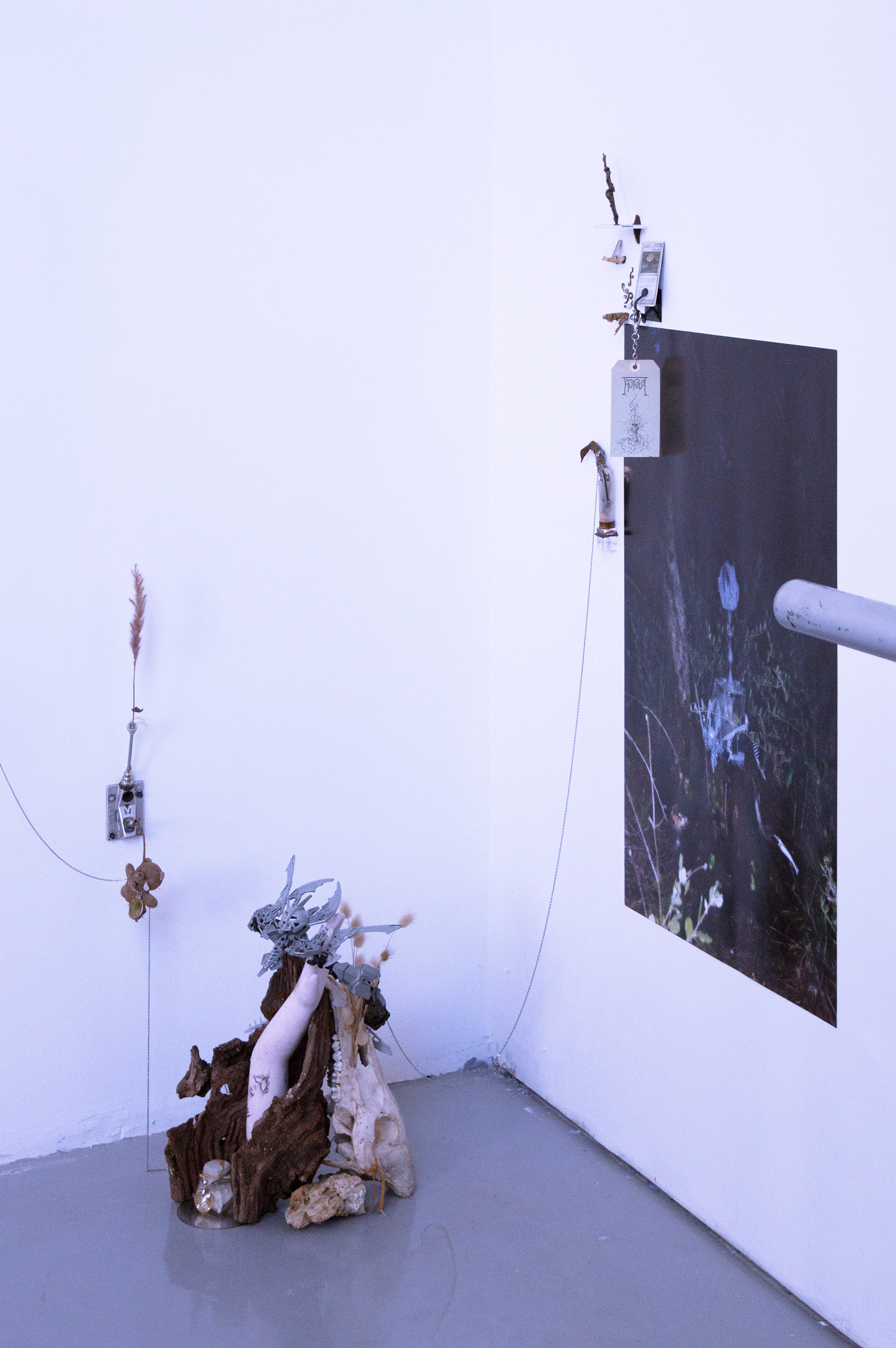 L’installation constitue une adaptation de mon projet de diplôme Bebas Maon après sa sélection par le jury et les curateur.ices de la manifestation Art Émergence. L’accrochage consiste en une multitude de compositions d’objets glanés ou issus de dons qui jaillissent des tirages extraits d’une série de 25 photographies. À leurs côtés, les sculptures de la série Fables se déploient dans l’espace transitoire qui mène du rez-de-chaussé à la mezzanine de la Chaufferie de la Fondation Fiminco. Le choix des photographies sélectionnées s’est fait d’un commun accord avec les curateur.ices Salomé Fau, Temitayo Olalekan et Alexis Hardy. Celles-ci ont ainsi déterminé la nature des fragments qui se retrouveraient dans l’installation. De cette façon, j’ai pu composer dans l’espace sur plusieurs jours et faire dialoguer les matériaux et leurs caractéristiques pour réactiver les contextes révolus des installations visibles dans les photographies. Ainsi une nouvelle lecture s’opère au travers de gestes adaptatifs, de recherches relationnelles dans les fragments, mais aussi des rencontres matériologiques propres à l’espace et son ambiance.