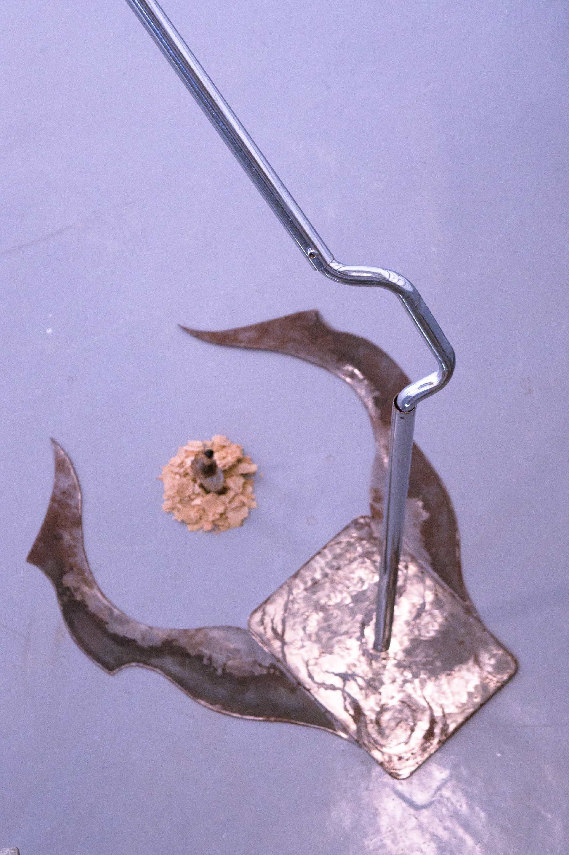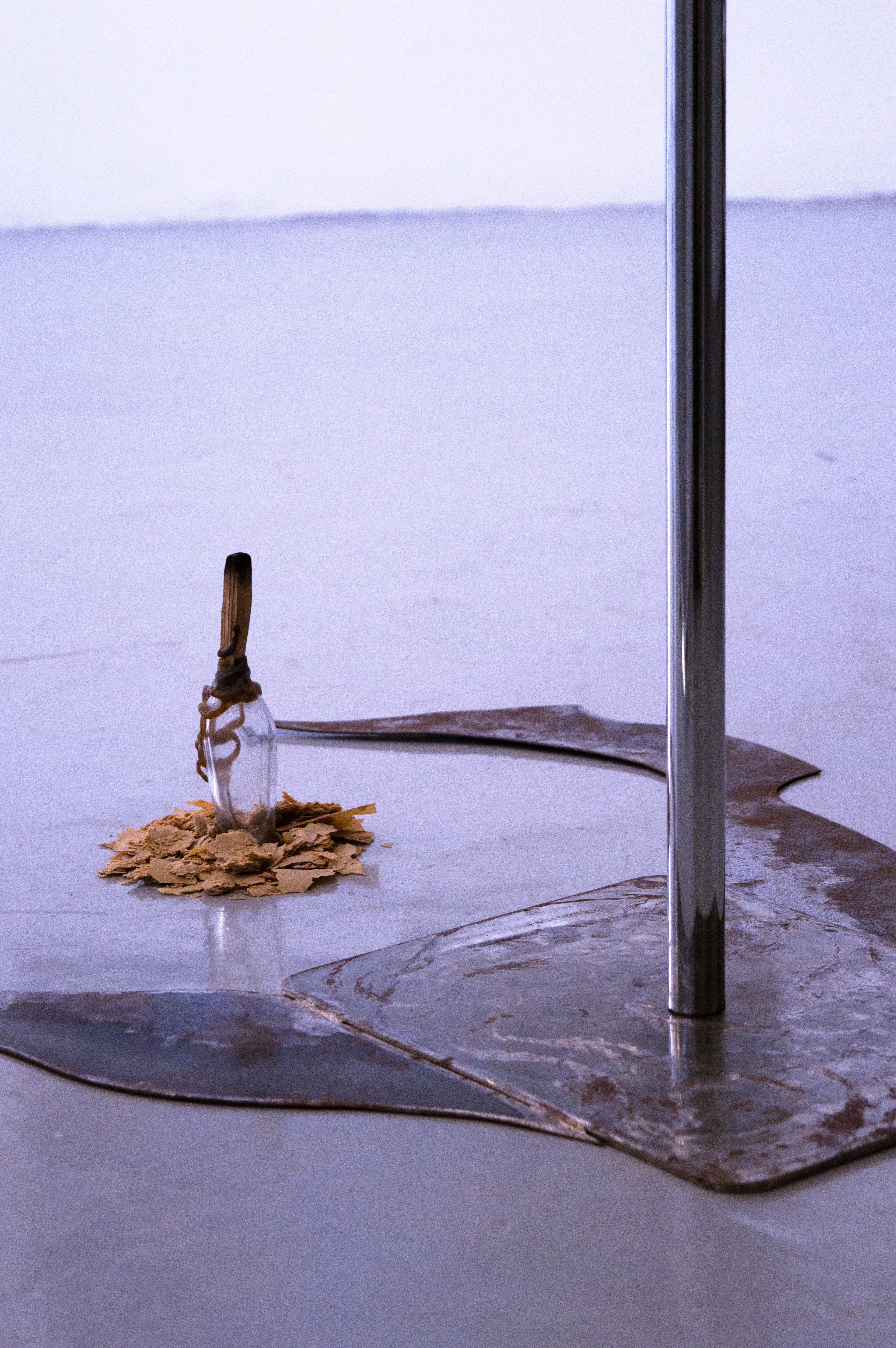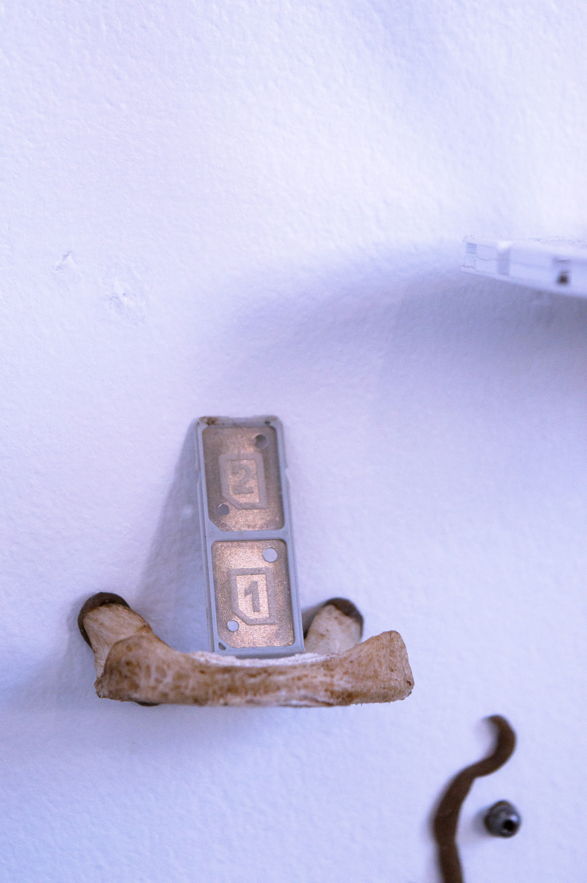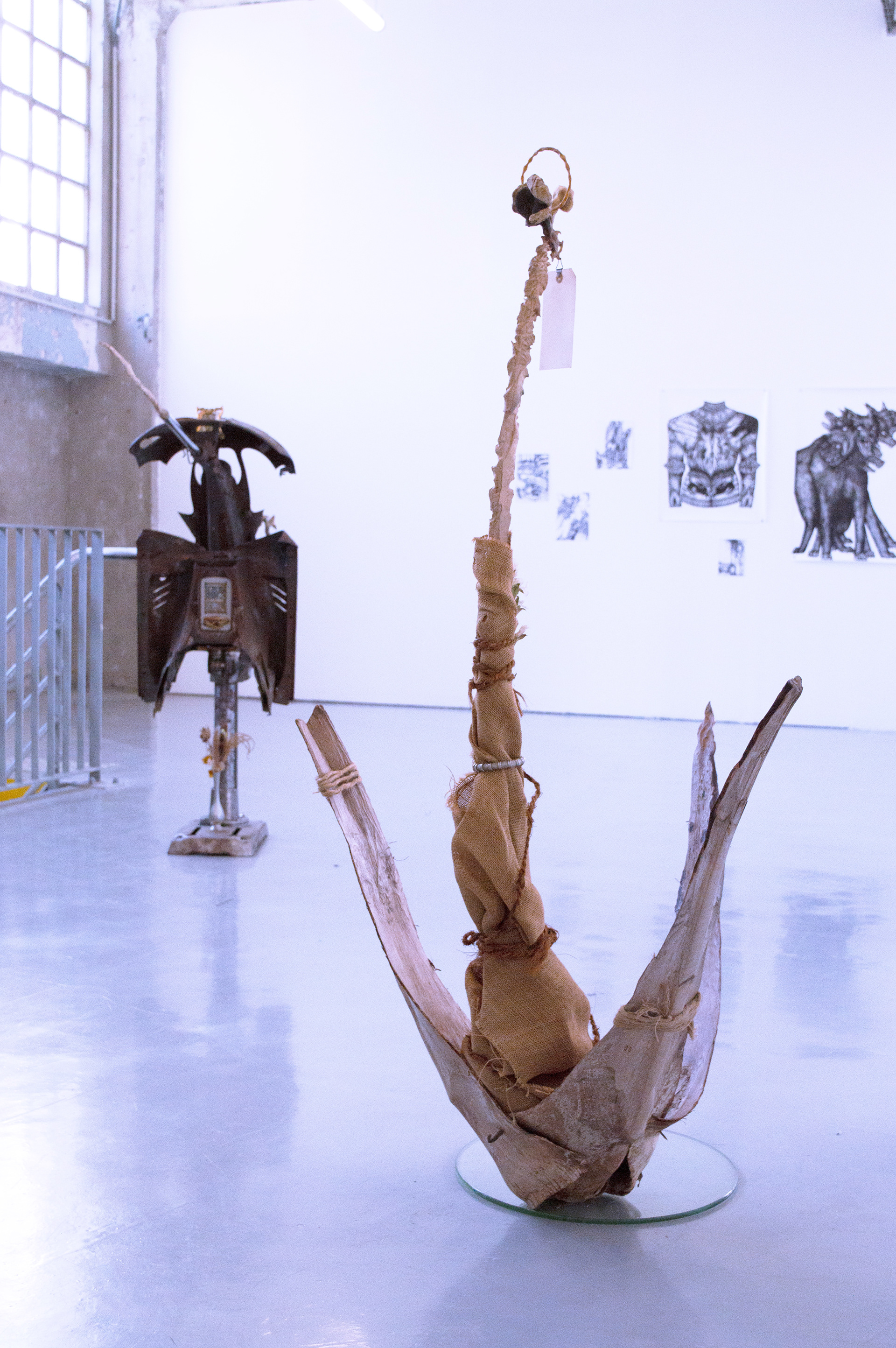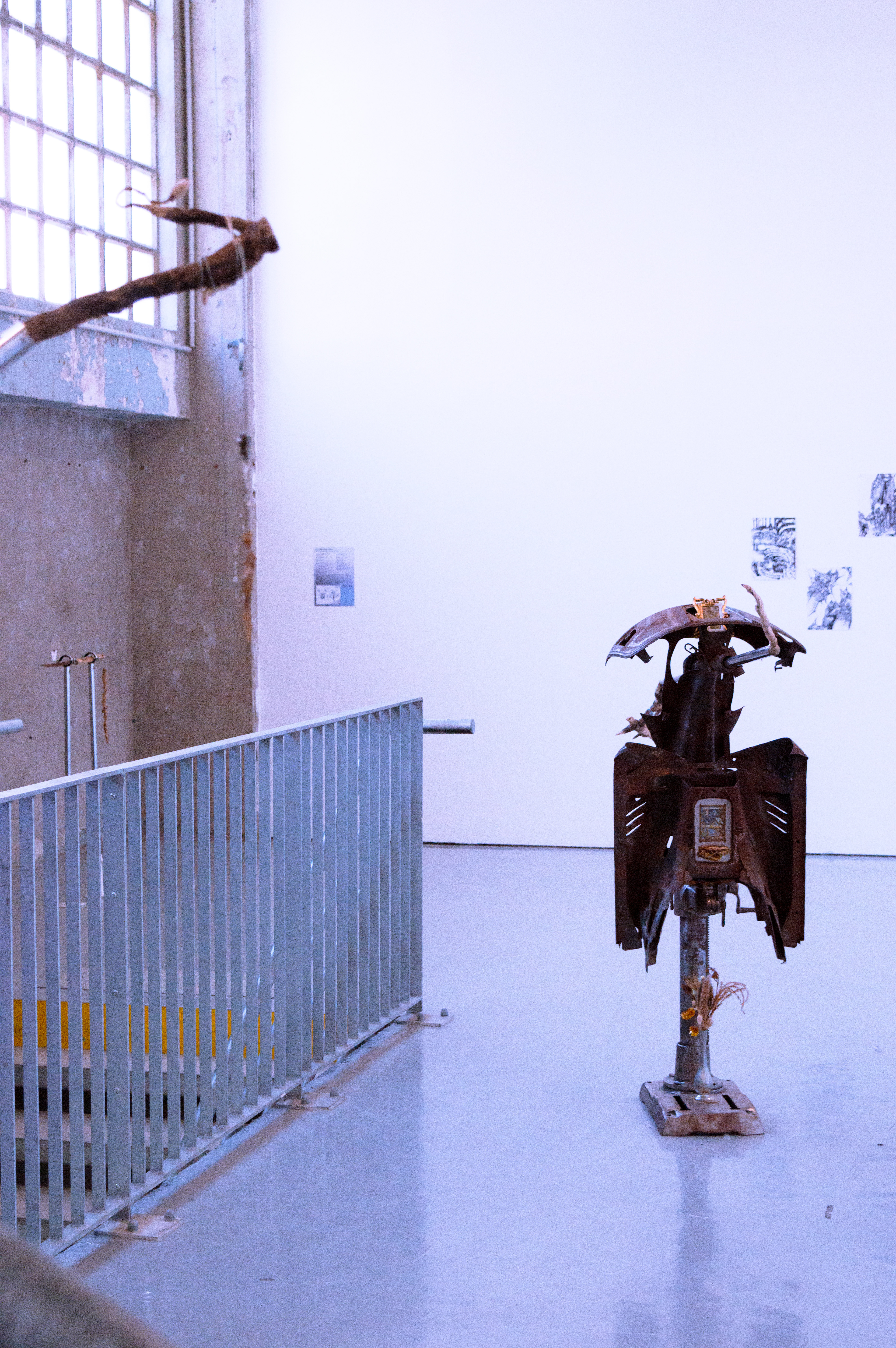 L’installation constitue une adaptation de mon projet de diplôme Bebas Maon après sa sélection par le jury et les curateur.ices de la manifestation Art Émergence. L’accrochage consiste en une multitude de compositions d’objets glanés ou issus de dons qui jaillissent des tirages extraits d’une série de 25 photographies. À leurs côtés, les sculptures de la série Fables se déploient dans l’espace transitoire qui mène du rez-de-chaussé à la mezzanine de la Chaufferie de la Fondation Fiminco. Le choix des photographies sélectionnées s’est fait d’un commun accord avec les curateur.ices Salomé Fau, Temitayo Olalekan et Alexis Hardy. Celles-ci ont ainsi déterminé la nature des fragments qui se retrouveraient dans l’installation. De cette façon, j’ai pu composer dans l’espace sur plusieurs jours et faire dialoguer les matériaux et leurs caractéristiques pour réactiver les contextes révolus des installations visibles dans les photographies. Ainsi une nouvelle lecture s’opère au travers de gestes adaptatifs, de recherches relationnelles dans les fragments, mais aussi des rencontres matériologiques propres à l’espace et son ambiance.