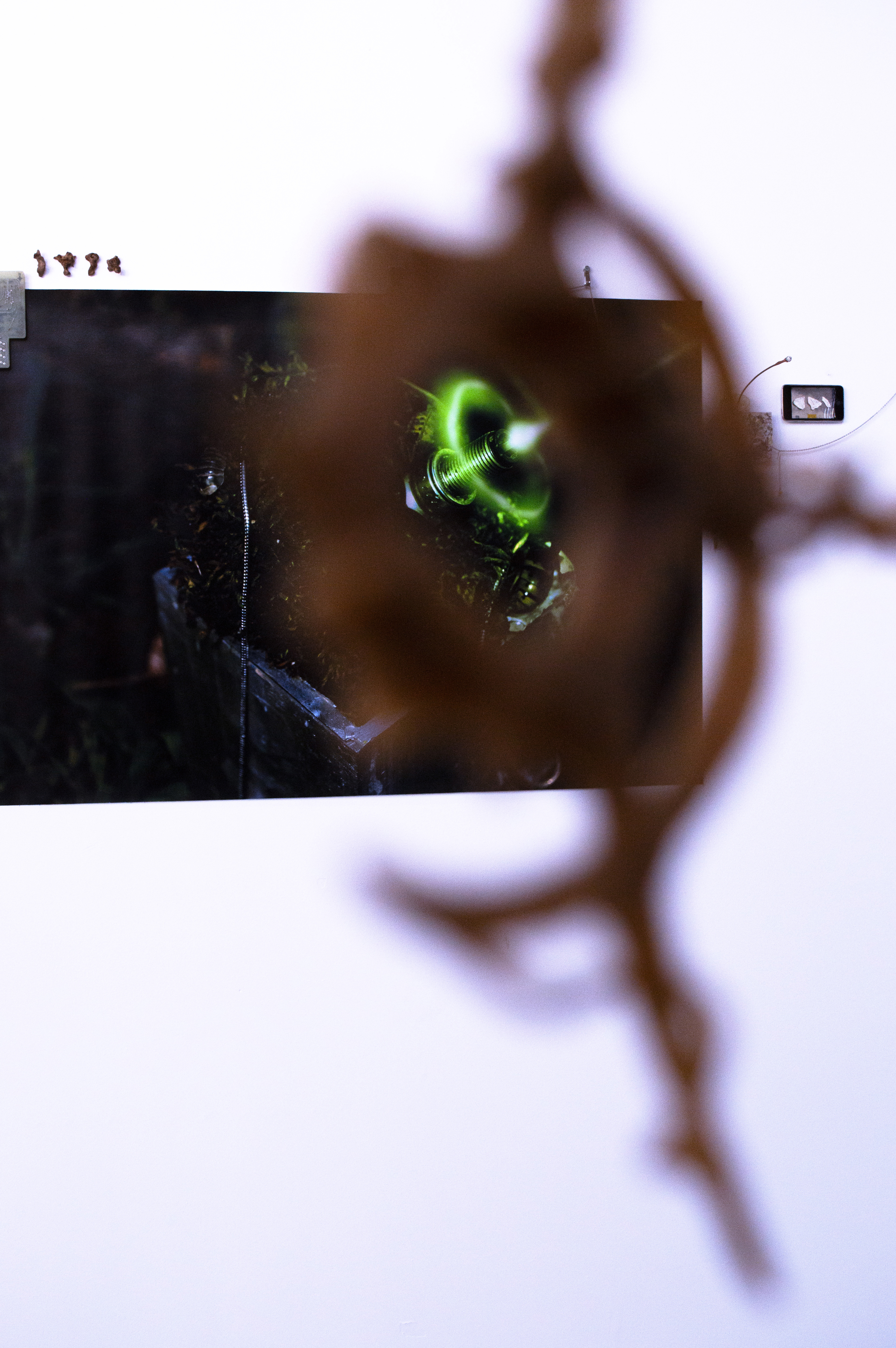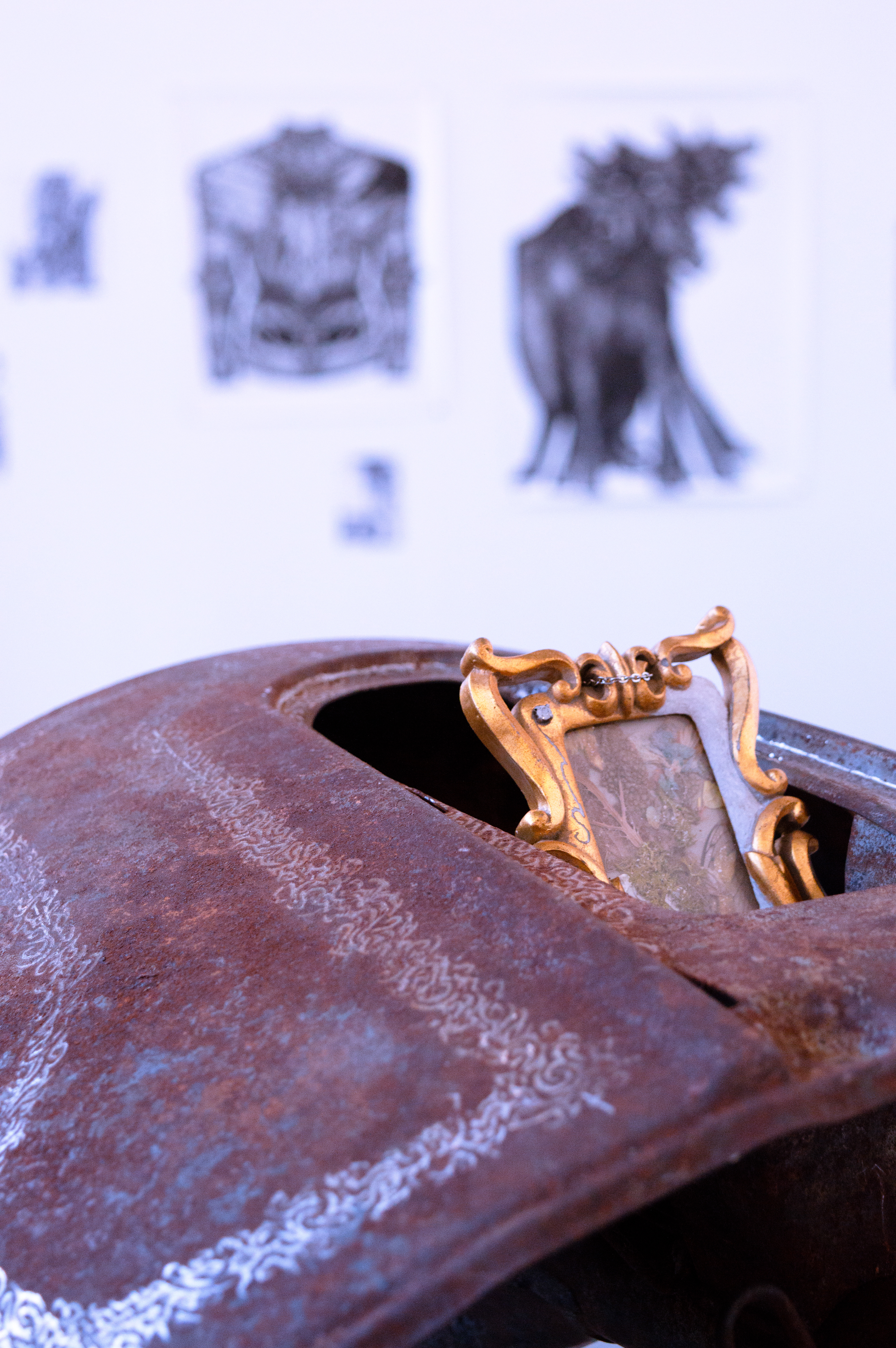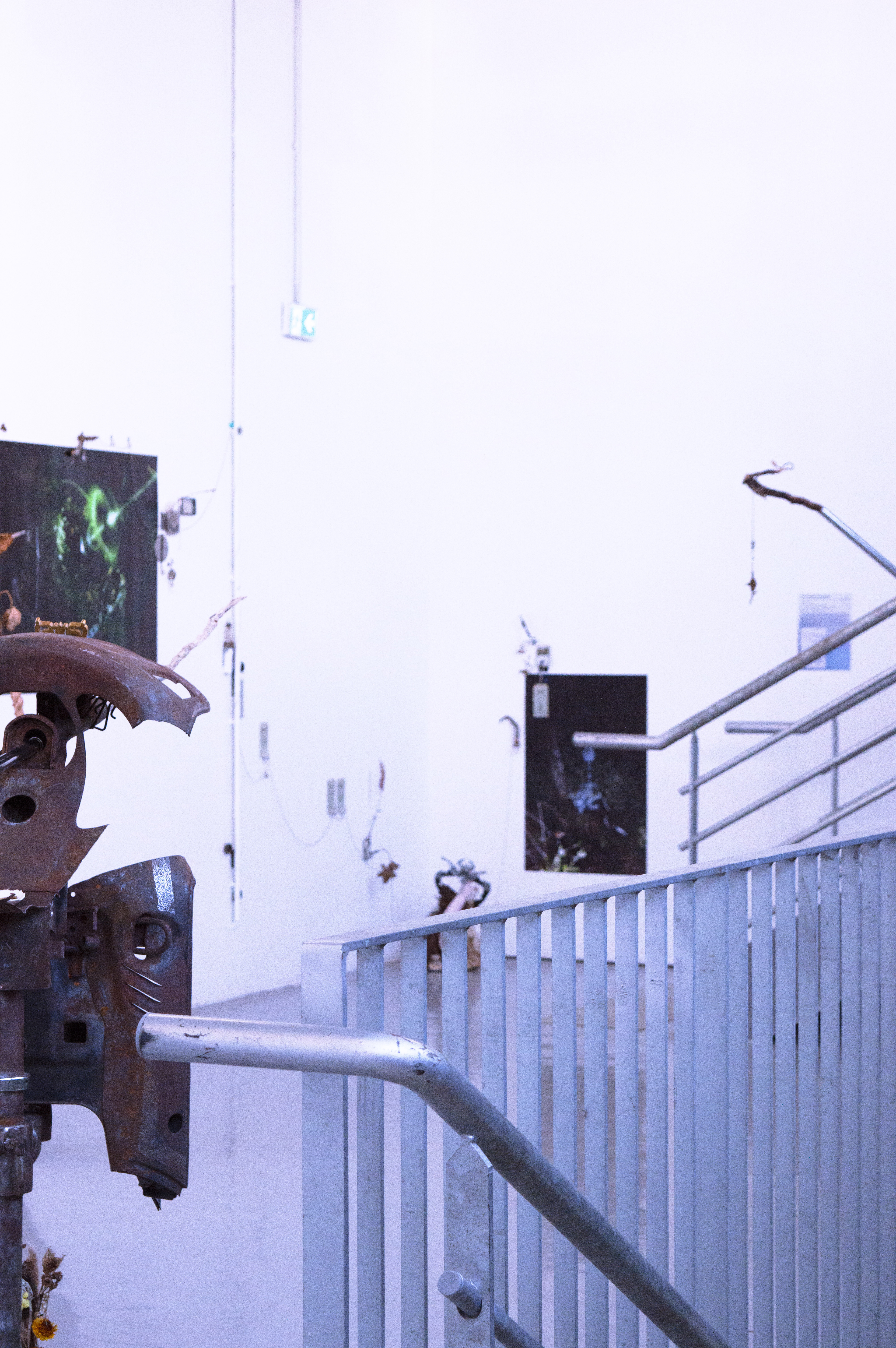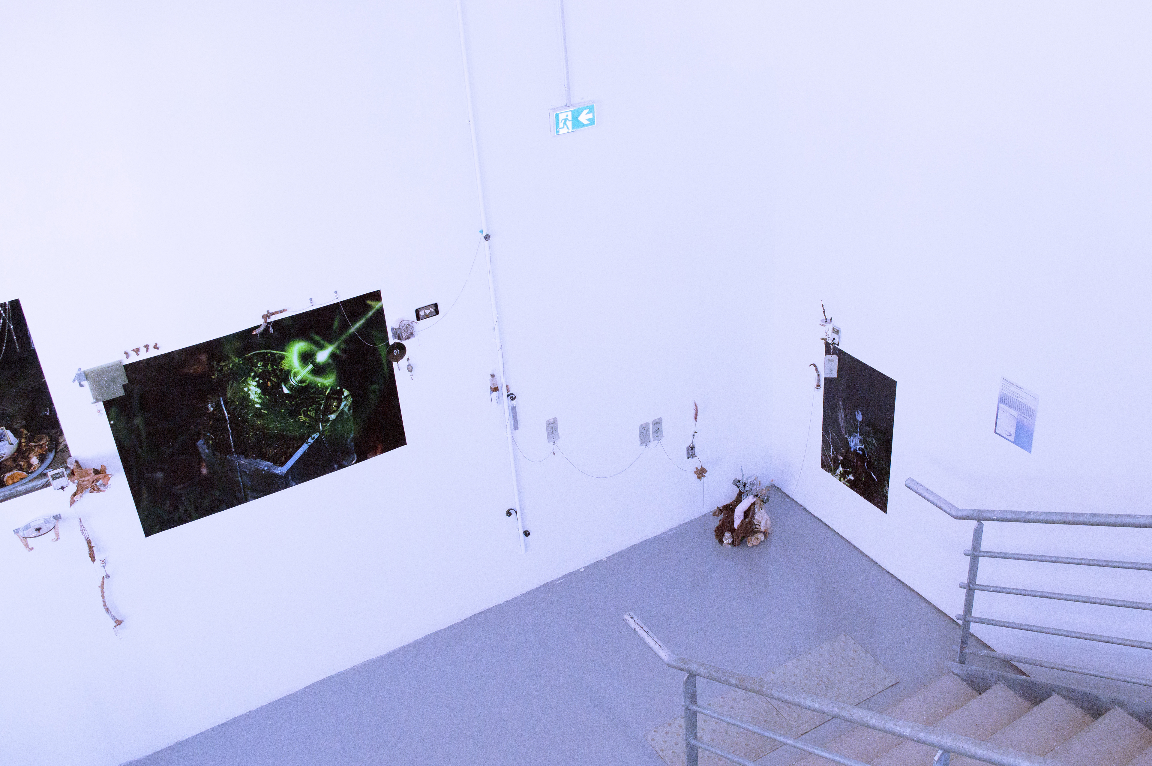 L’installation constitue une adaptation de mon projet de diplôme Bebas Maon après sa sélection par le jury et les curateur.ices de la manifestation Art Émergence. L’accrochage consiste en une multitude de compositions d’objets glanés ou issus de dons qui jaillissent des tirages extraits d’une série de 25 photographies. À leurs côtés, les sculptures de la série Fables se déploient dans l’espace transitoire qui mène du rez-de-chaussé à la mezzanine de la Chaufferie de la Fondation Fiminco. Le choix des photographies sélectionnées s’est fait d’un commun accord avec les curateur.ices Salomé Fau, Temitayo Olalekan et Alexis Hardy. Celles-ci ont ainsi déterminé la nature des fragments qui se retrouveraient dans l’installation. De cette façon, j’ai pu composer dans l’espace sur plusieurs jours et faire dialoguer les matériaux et leurs caractéristiques pour réactiver les contextes révolus des installations visibles dans les photographies. Ainsi une nouvelle lecture s’opère au travers de gestes adaptatifs, de recherches relationnelles dans les fragments, mais aussi des rencontres matériologiques propres à l’espace et son ambiance.