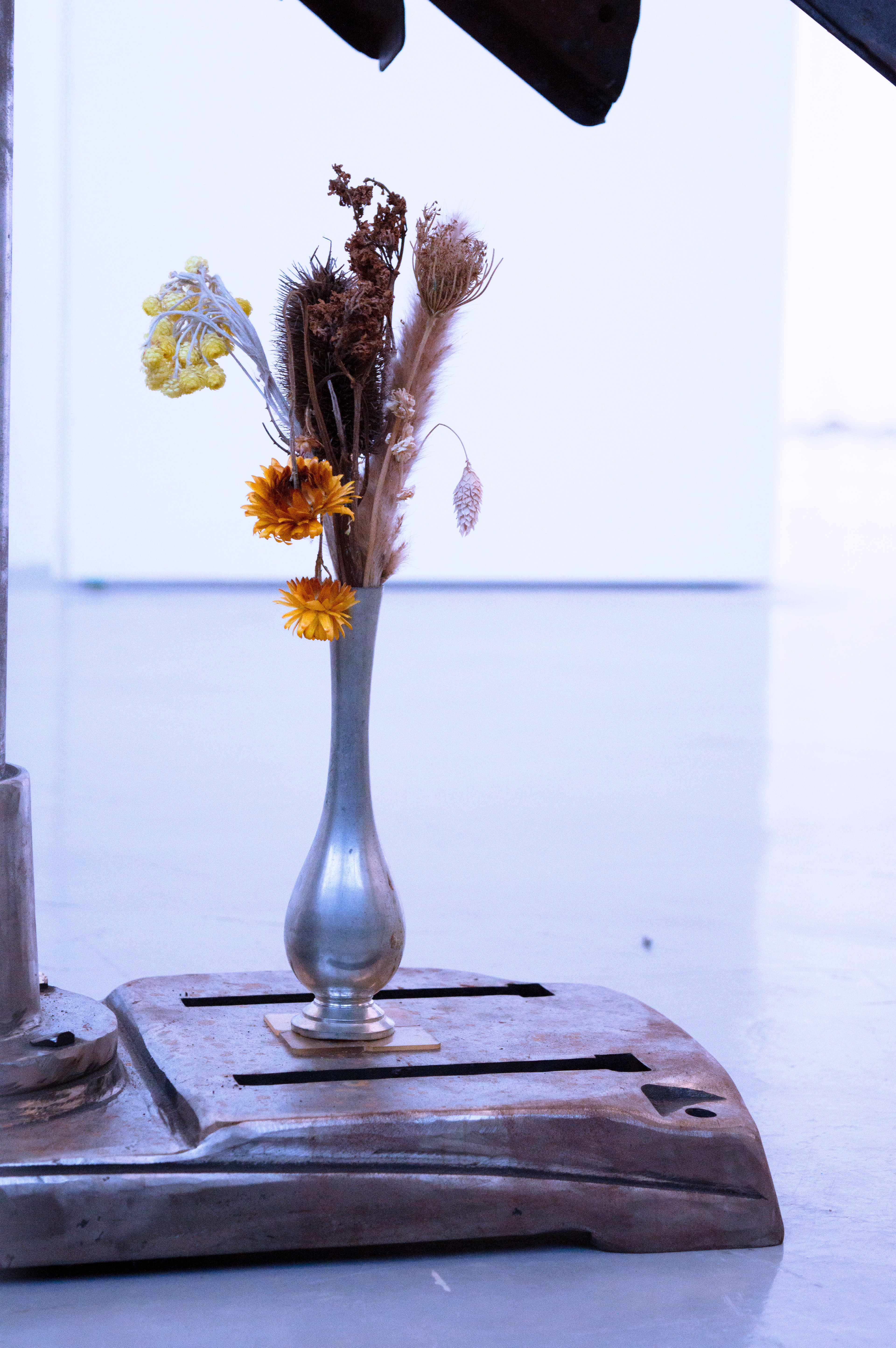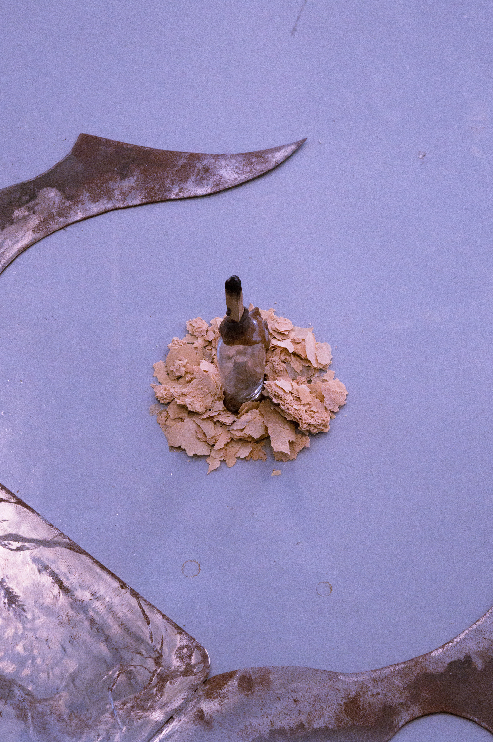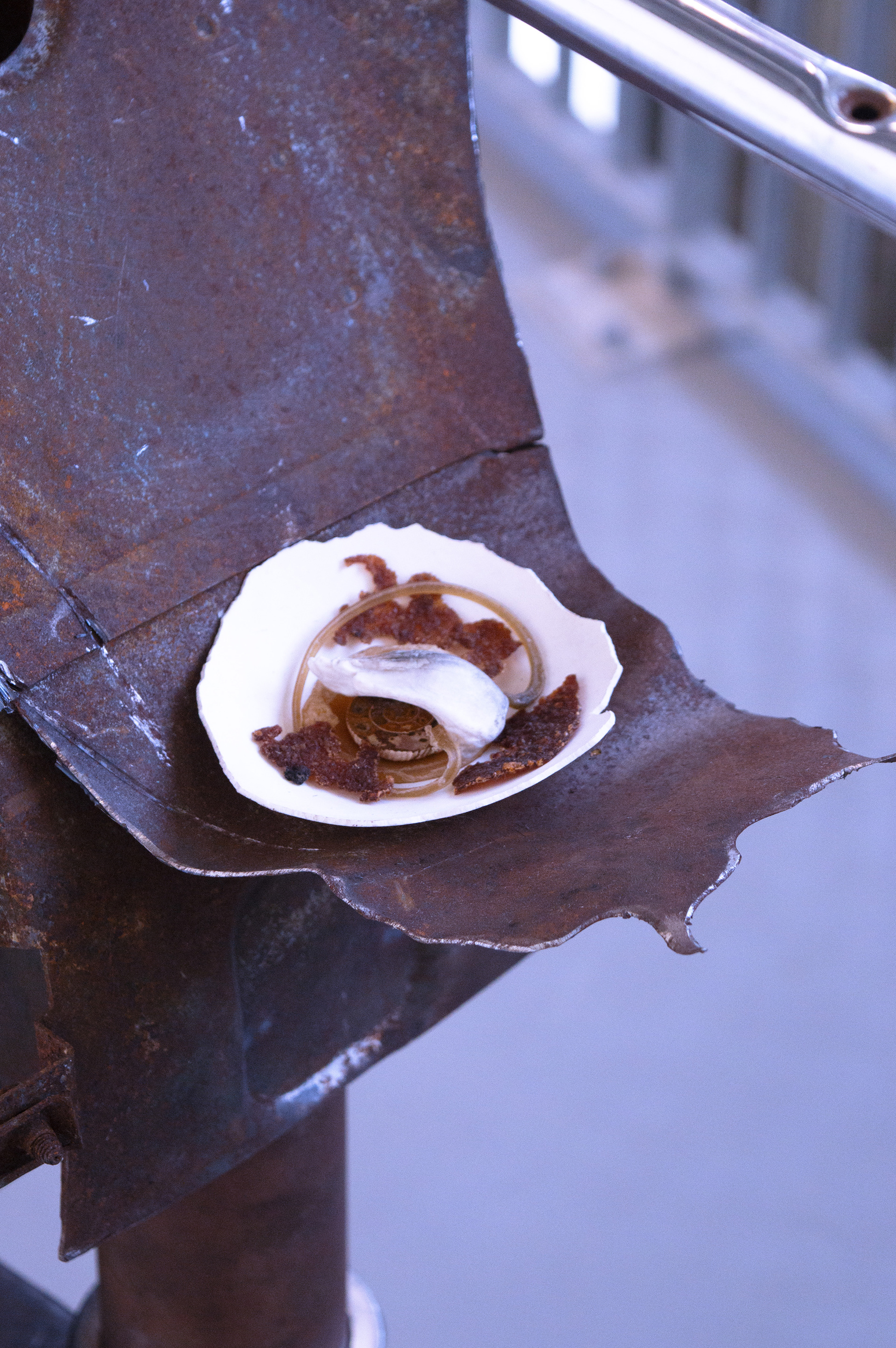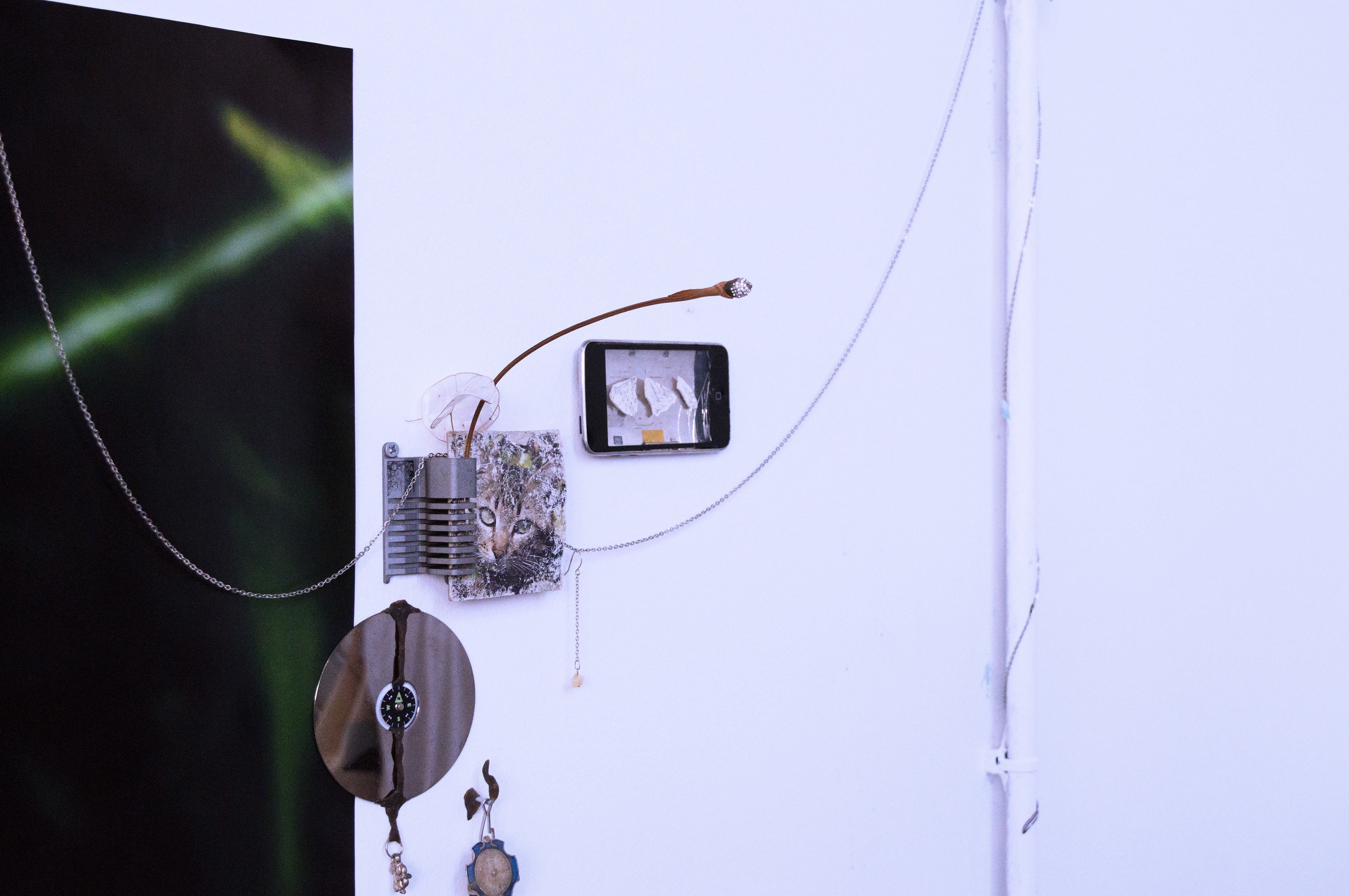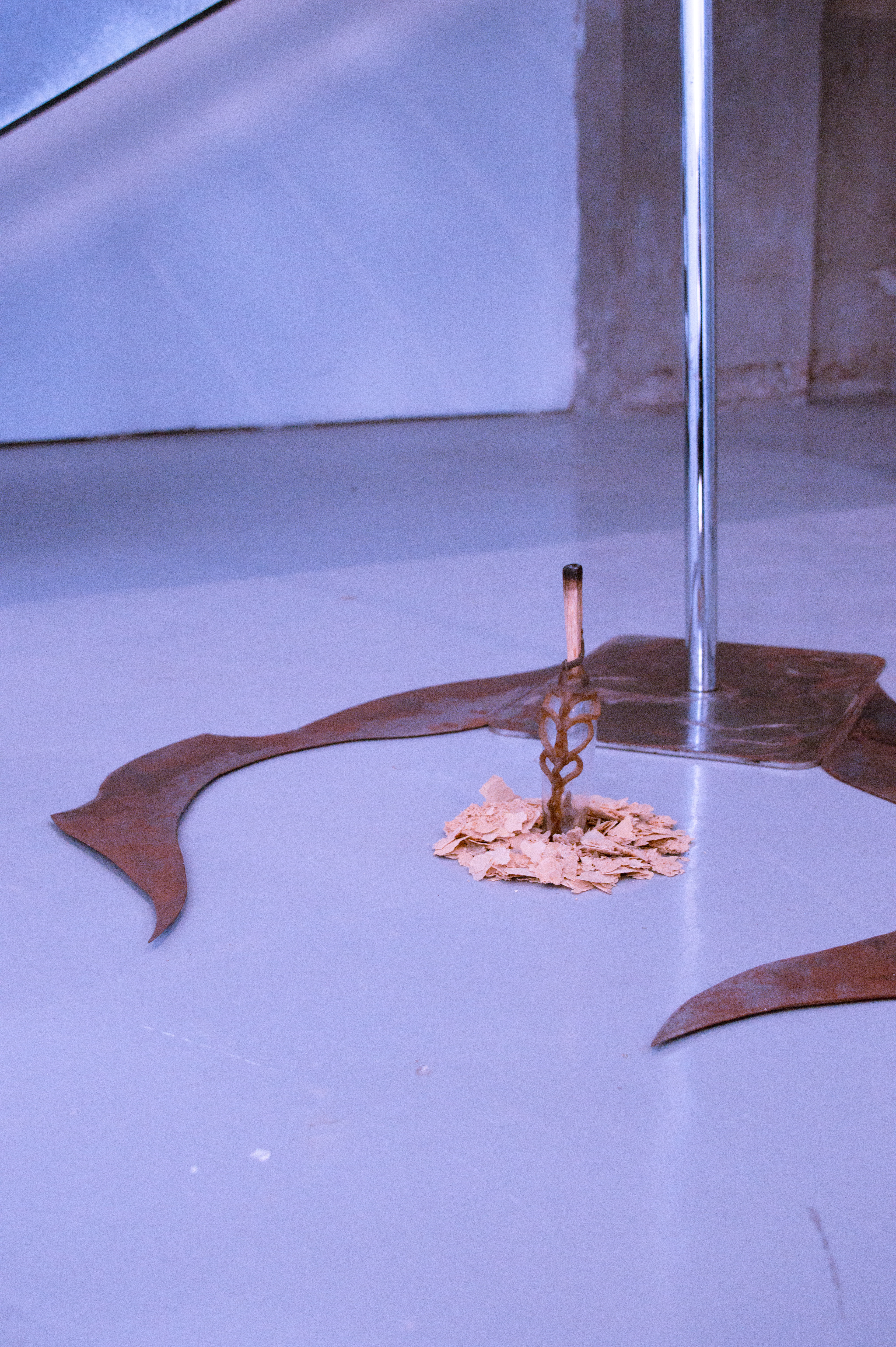 L’installation constitue une adaptation de mon projet de diplôme Bebas Maon après sa sélection par le jury et les curateur.ices de la manifestation Art Émergence. L’accrochage consiste en une multitude de compositions d’objets glanés ou issus de dons qui jaillissent des tirages extraits d’une série de 25 photographies. À leurs côtés, les sculptures de la série Fables se déploient dans l’espace transitoire qui mène du rez-de-chaussé à la mezzanine de la Chaufferie de la Fondation Fiminco. Le choix des photographies sélectionnées s’est fait d’un commun accord avec les curateur.ices Salomé Fau, Temitayo Olalekan et Alexis Hardy. Celles-ci ont ainsi déterminé la nature des fragments qui se retrouveraient dans l’installation. De cette façon, j’ai pu composer dans l’espace sur plusieurs jours et faire dialoguer les matériaux et leurs caractéristiques pour réactiver les contextes révolus des installations visibles dans les photographies. Ainsi une nouvelle lecture s’opère au travers de gestes adaptatifs, de recherches relationnelles dans les fragments, mais aussi des rencontres matériologiques propres à l’espace et son ambiance.