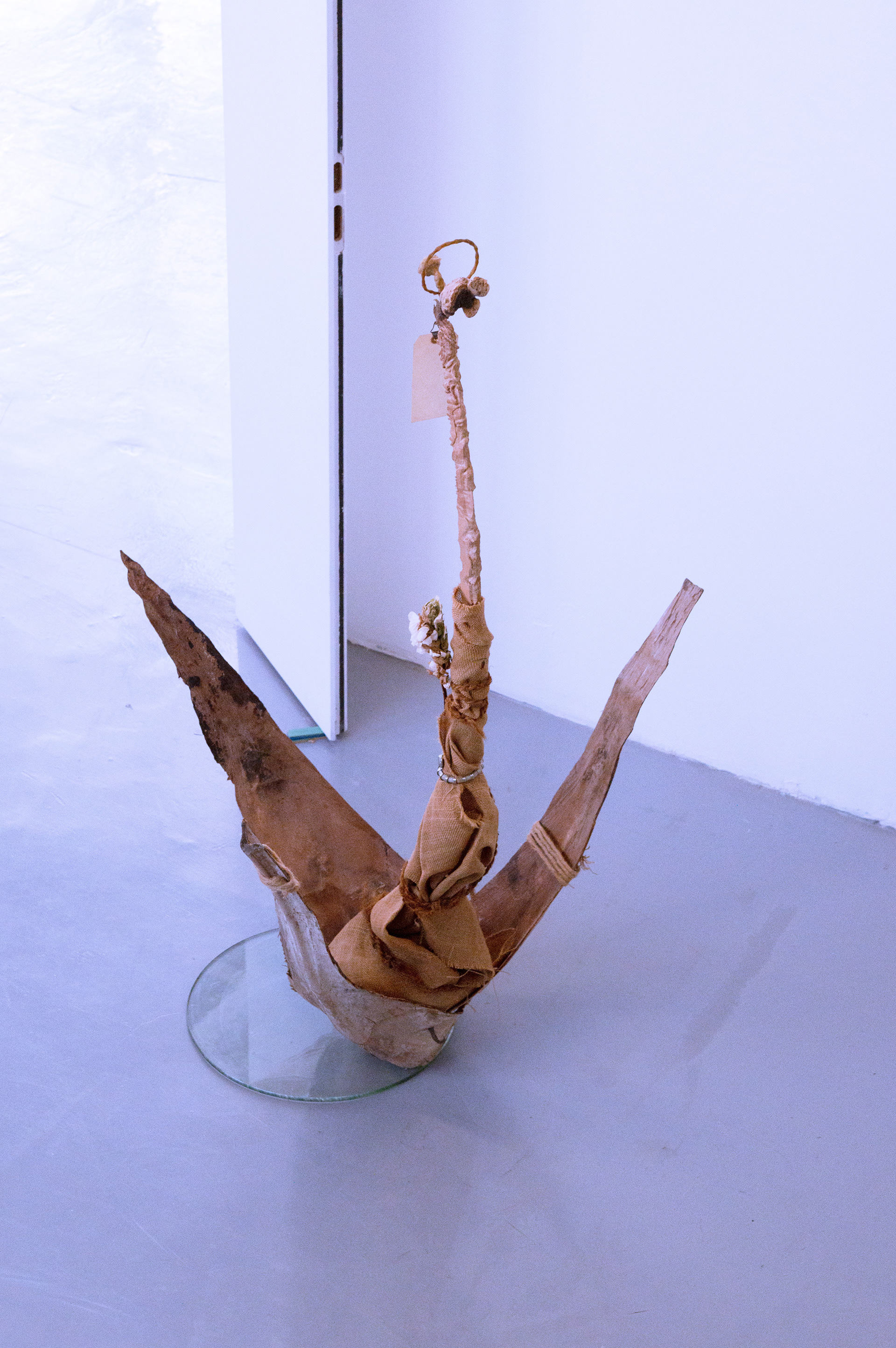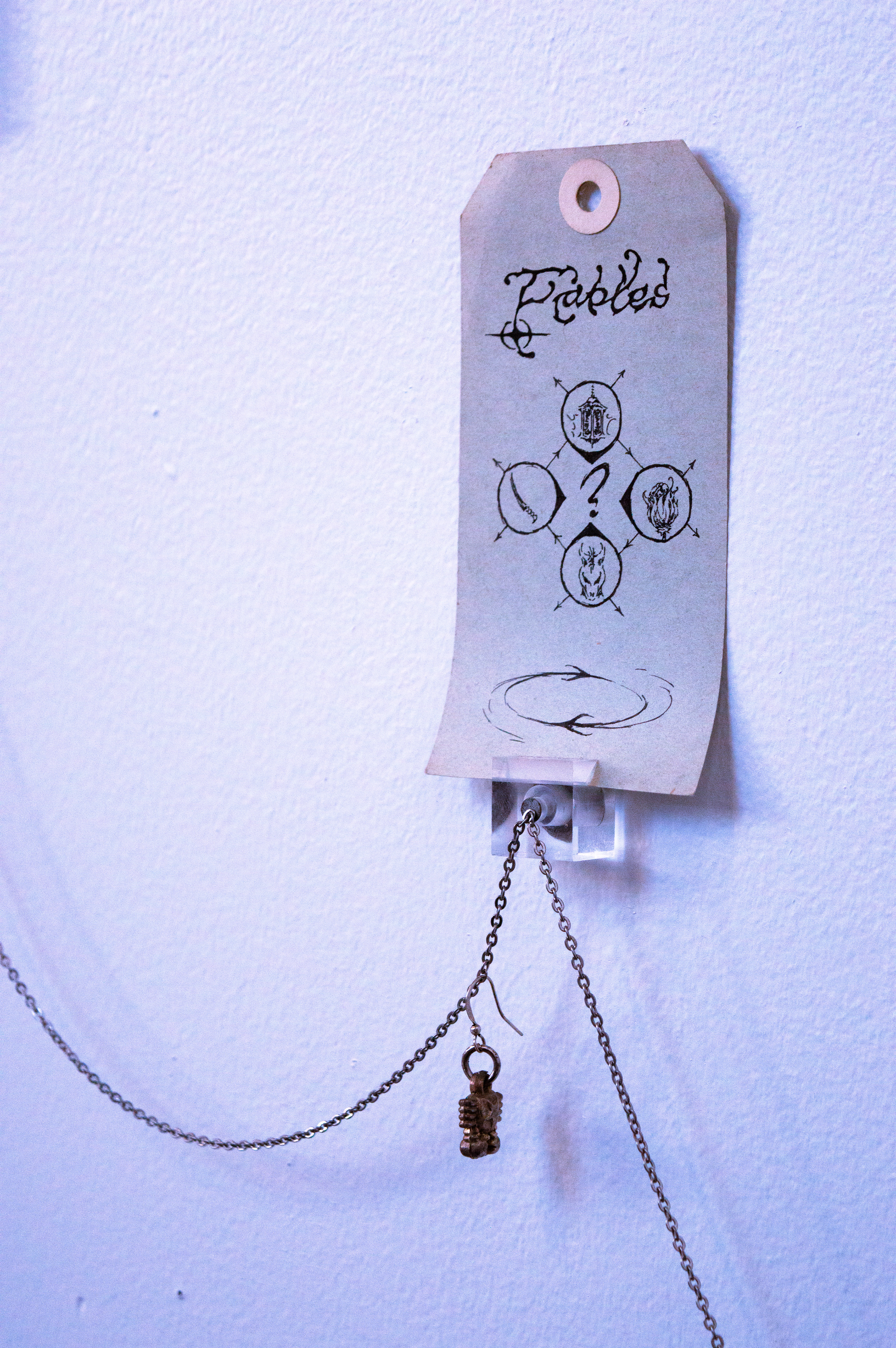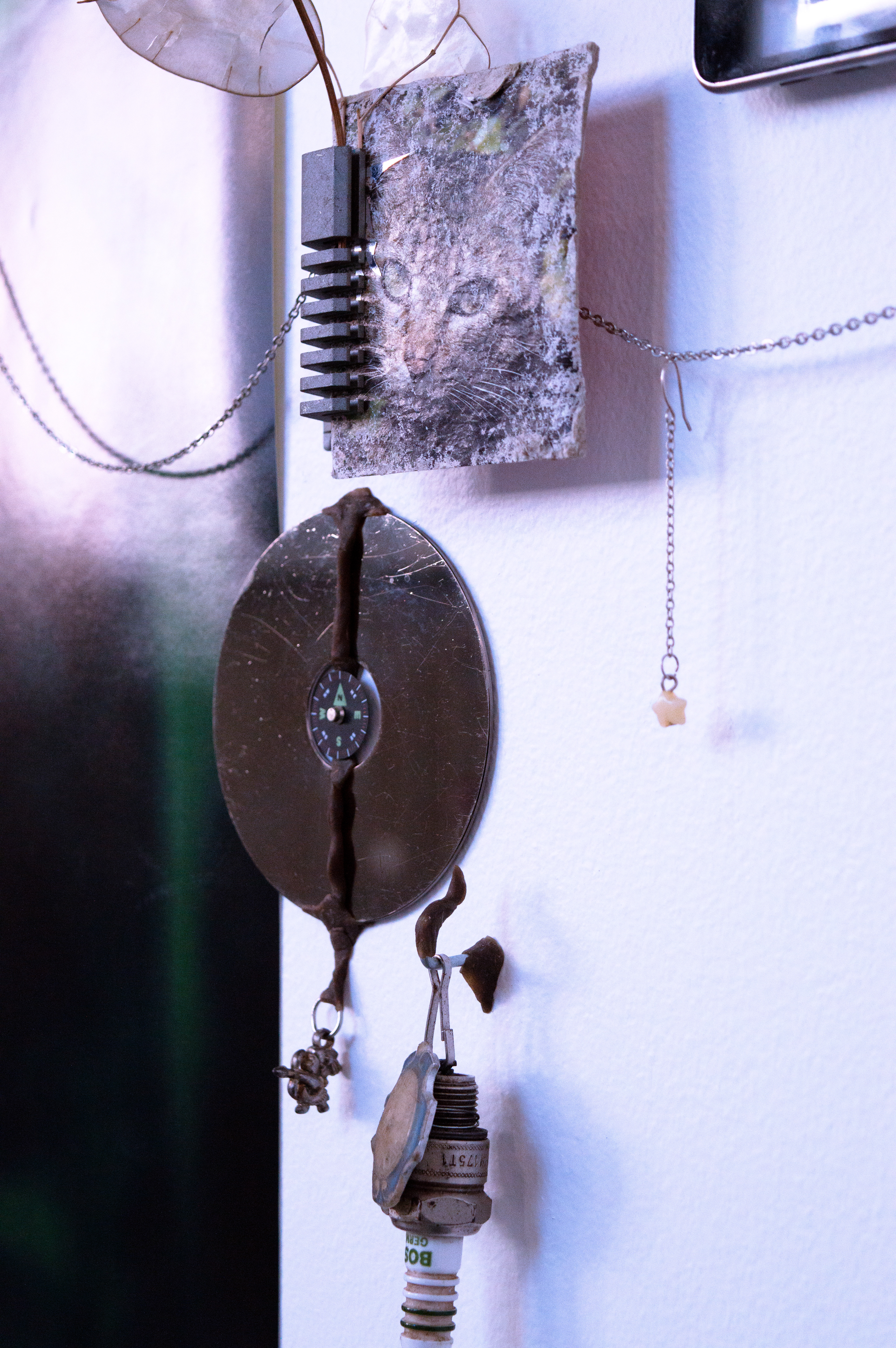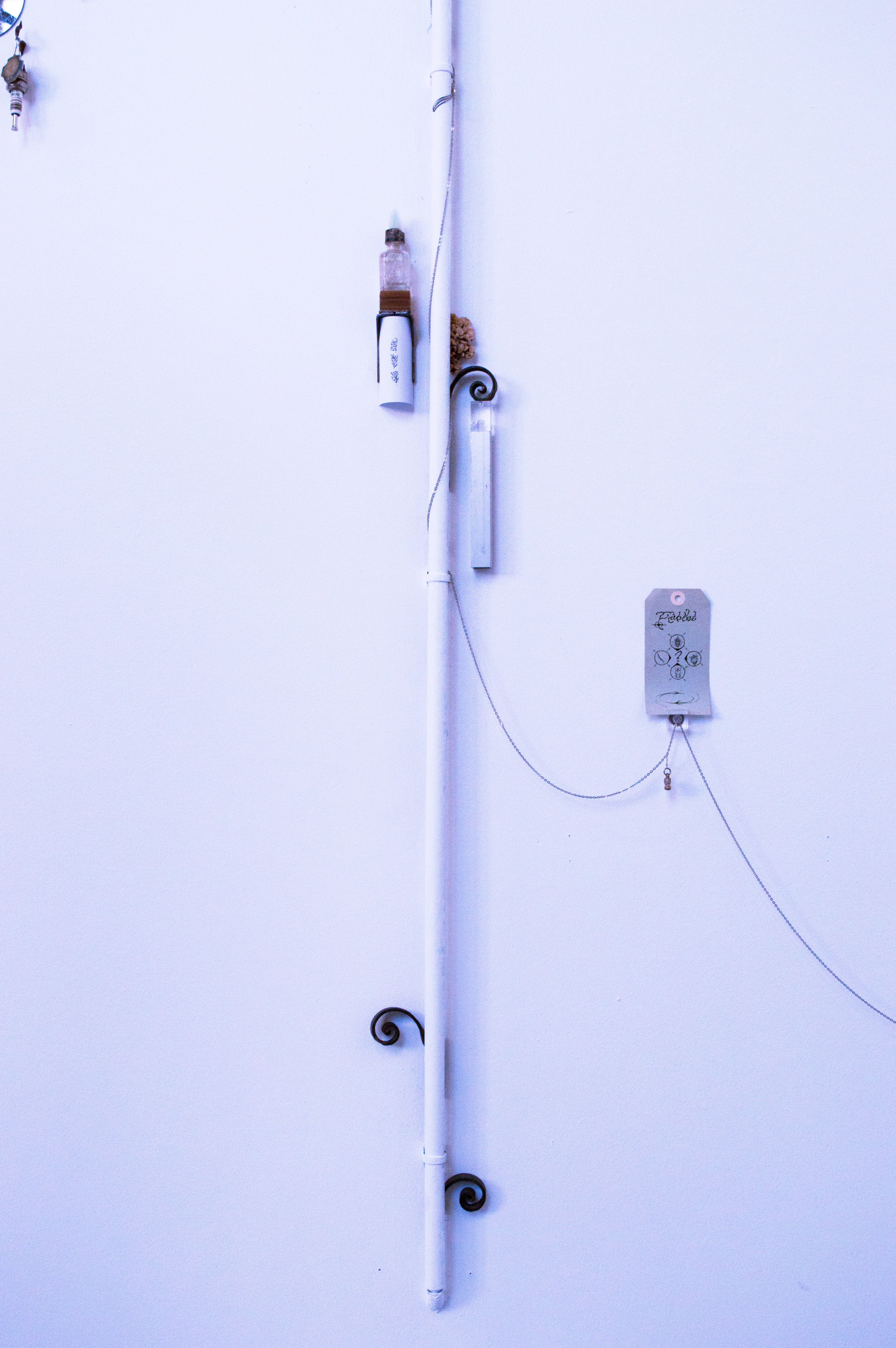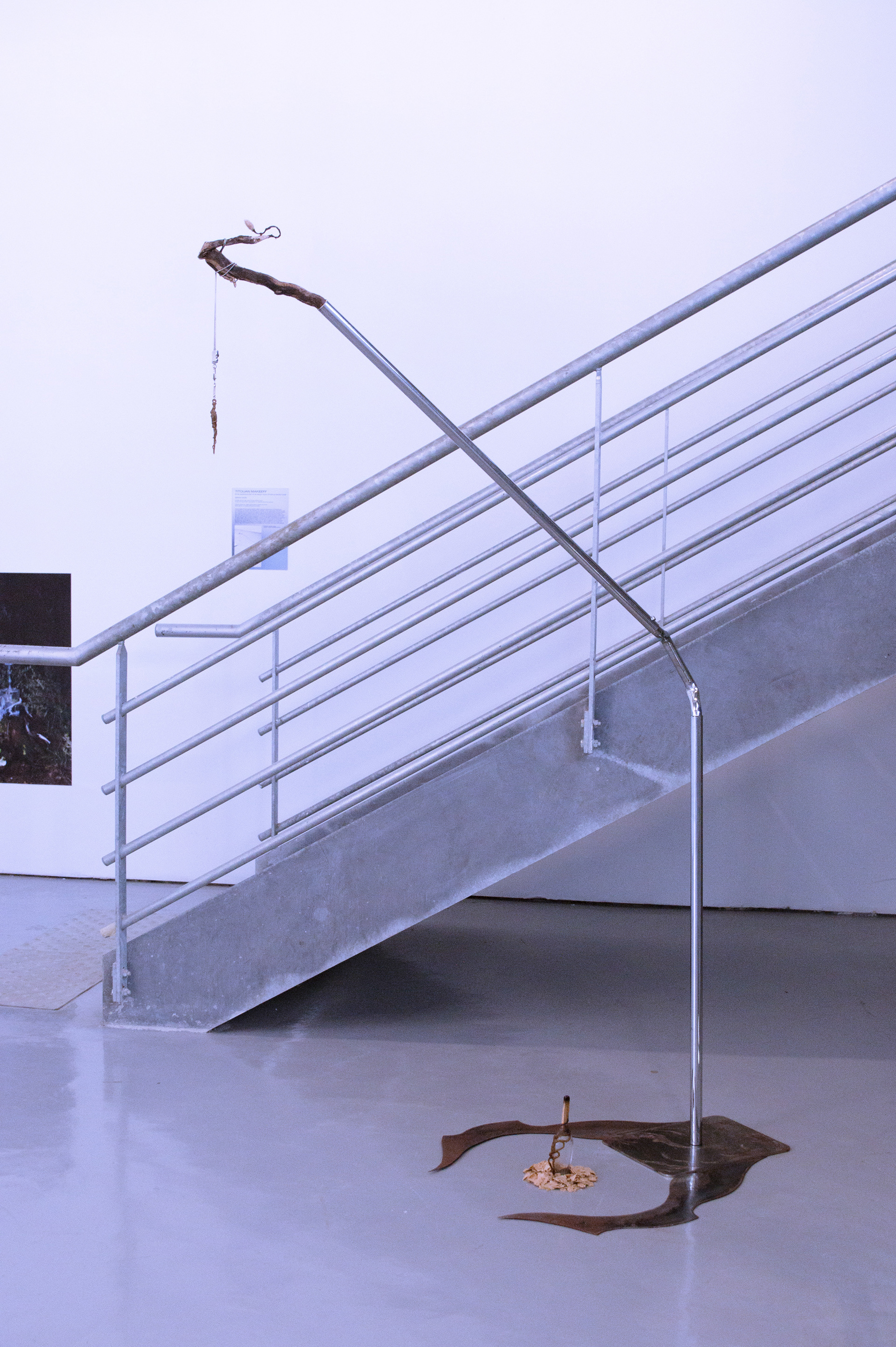 L’installation constitue une adaptation de mon projet de diplôme Bebas Maon après sa sélection par le jury et les curateur.ices de la manifestation Art Émergence. L’accrochage consiste en une multitude de compositions d’objets glanés ou issus de dons qui jaillissent des tirages extraits d’une série de 25 photographies. À leurs côtés, les sculptures de la série Fables se déploient dans l’espace transitoire qui mène du rez-de-chaussé à la mezzanine de la Chaufferie de la Fondation Fiminco. Le choix des photographies sélectionnées s’est fait d’un commun accord avec les curateur.ices Salomé Fau, Temitayo Olalekan et Alexis Hardy. Celles-ci ont ainsi déterminé la nature des fragments qui se retrouveraient dans l’installation. De cette façon, j’ai pu composer dans l’espace sur plusieurs jours et faire dialoguer les matériaux et leurs caractéristiques pour réactiver les contextes révolus des installations visibles dans les photographies. Ainsi une nouvelle lecture s’opère au travers de gestes adaptatifs, de recherches relationnelles dans les fragments, mais aussi des rencontres matériologiques propres à l’espace et son ambiance.