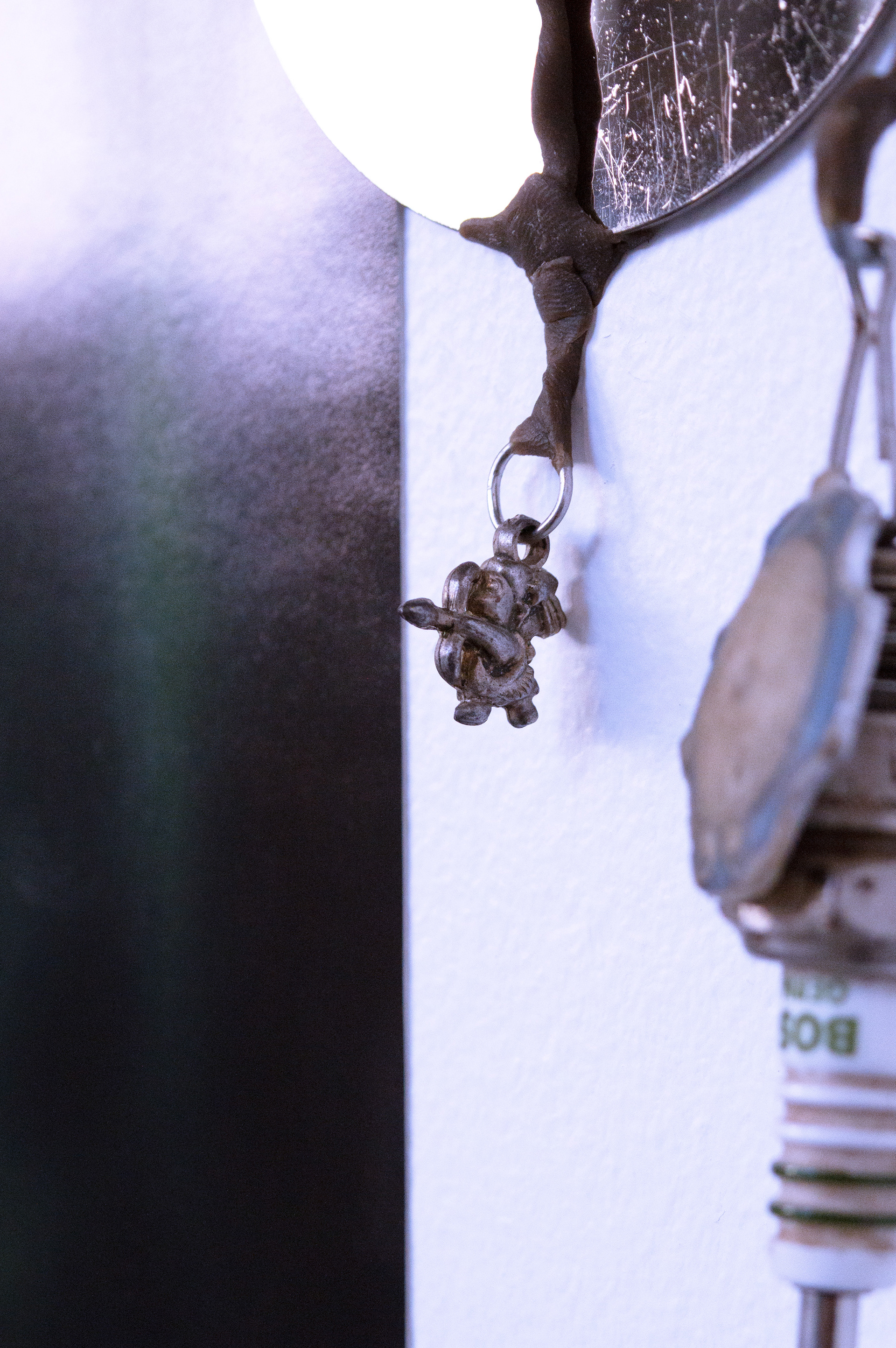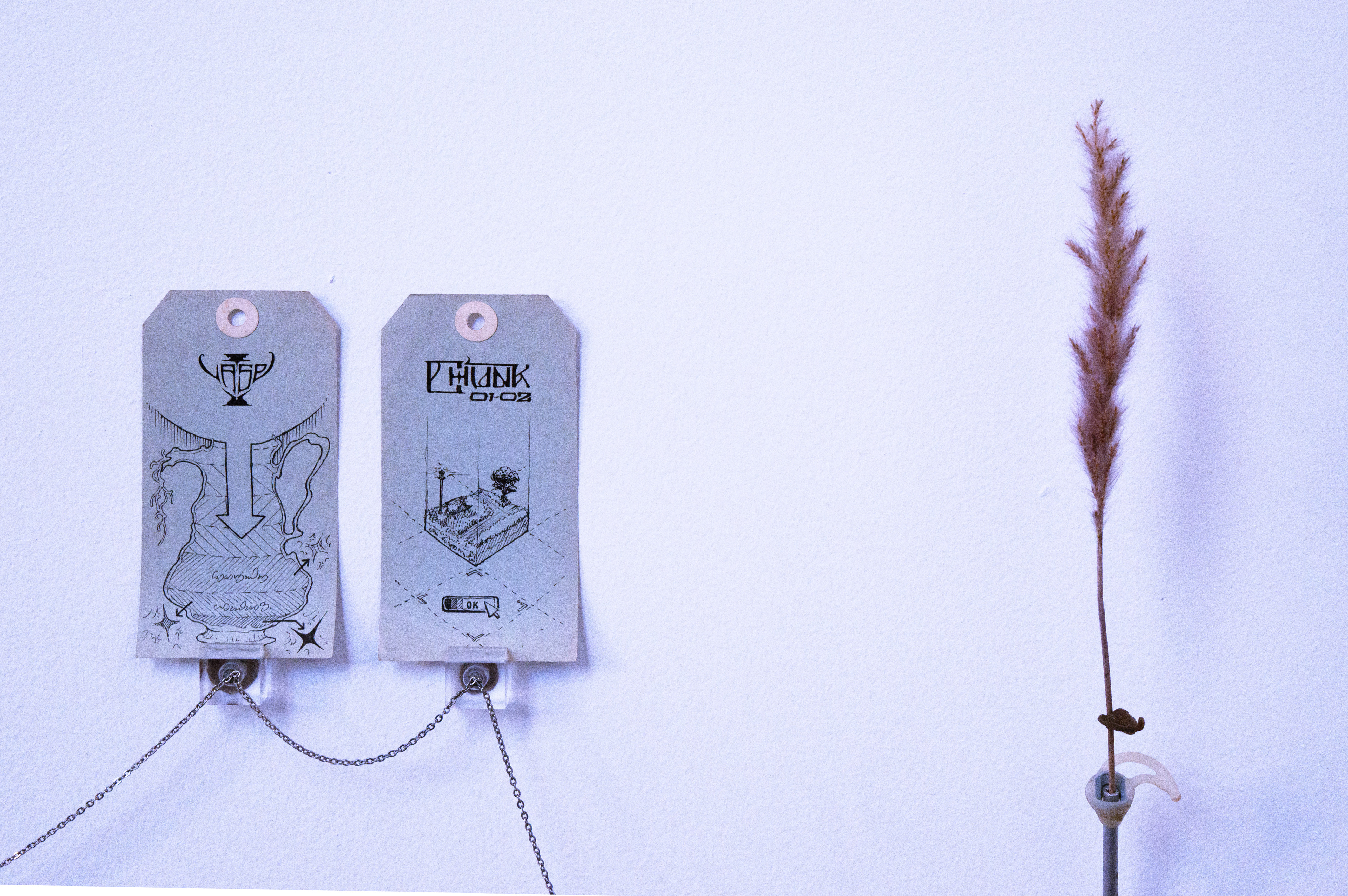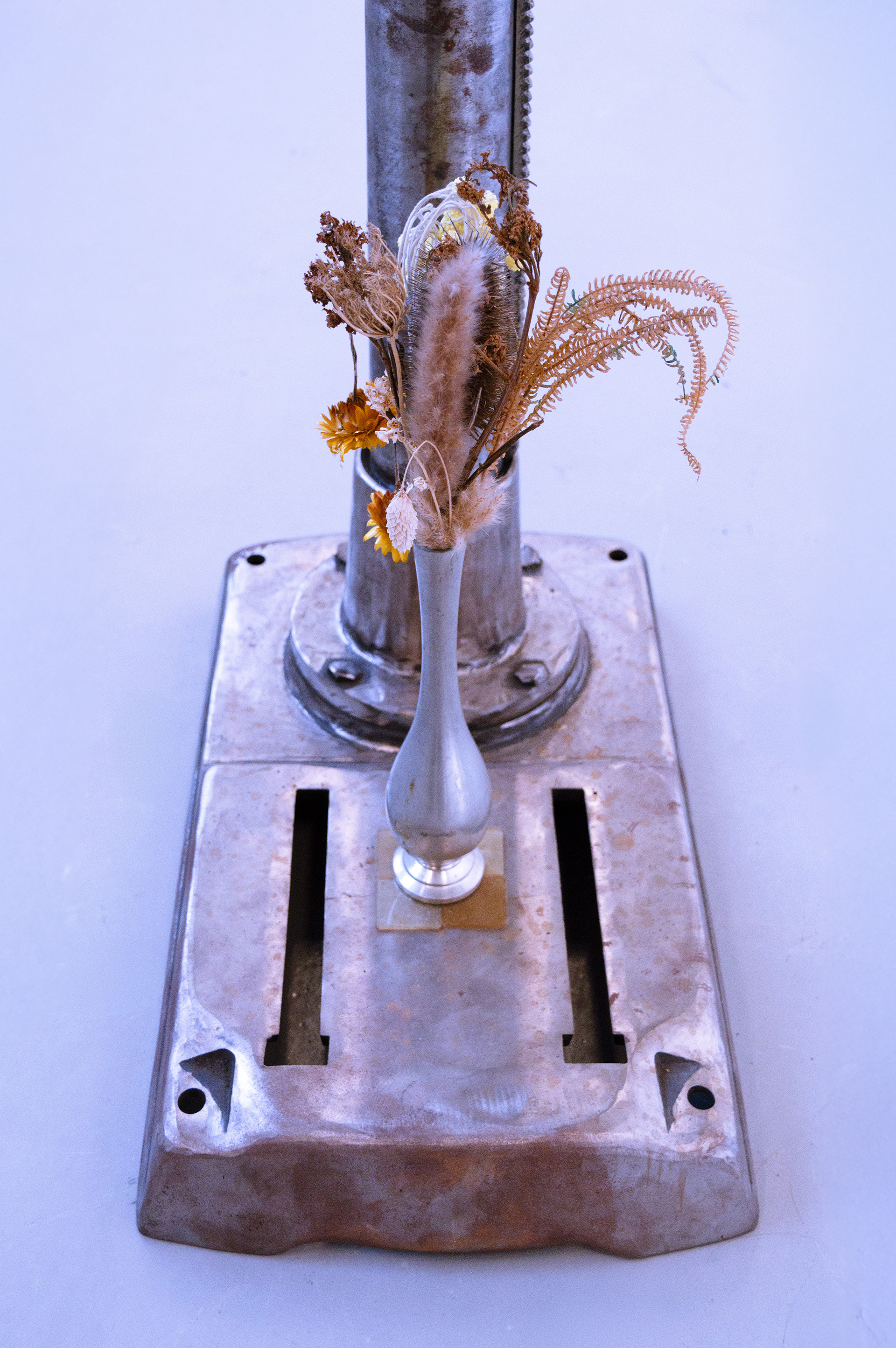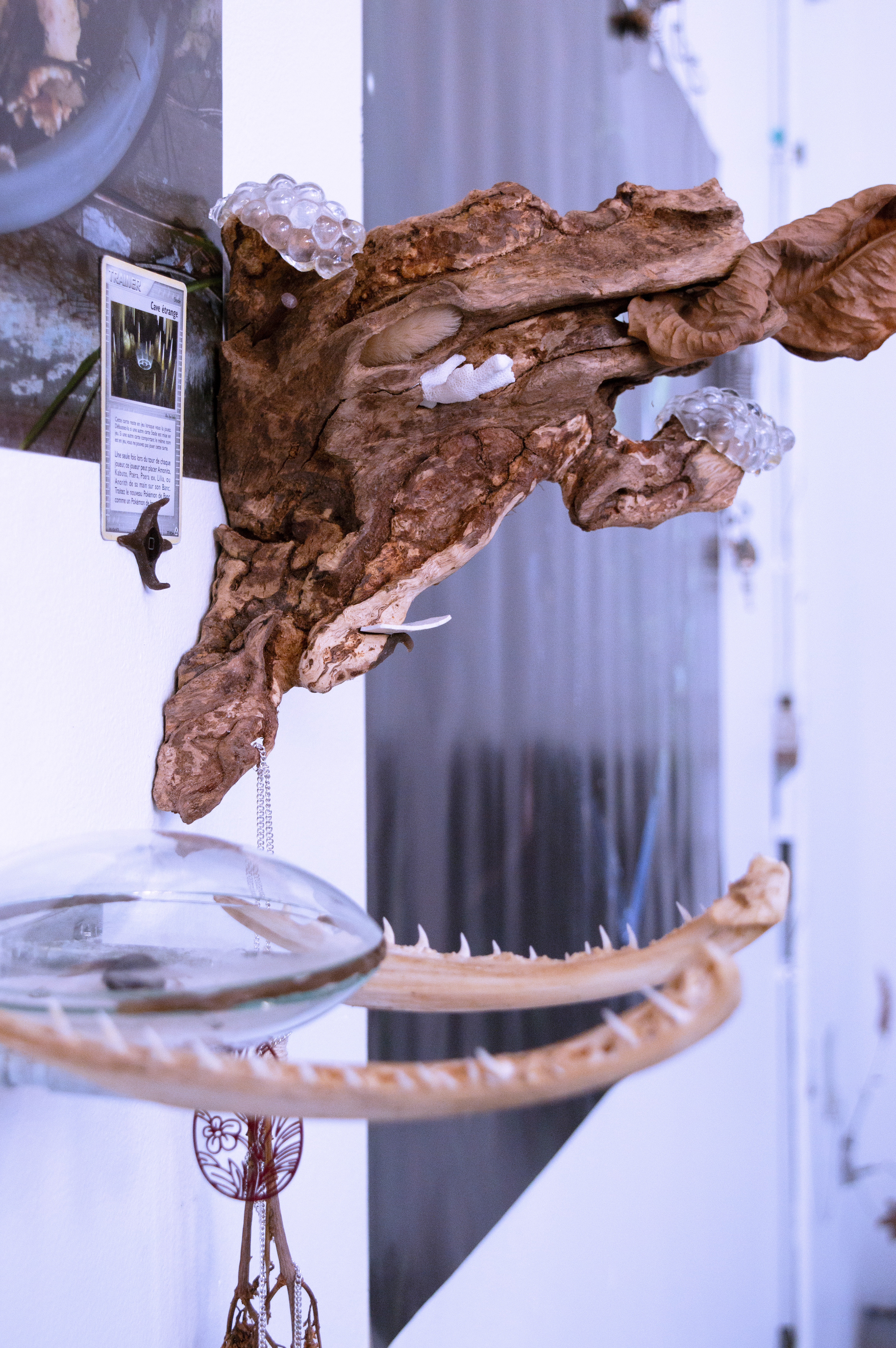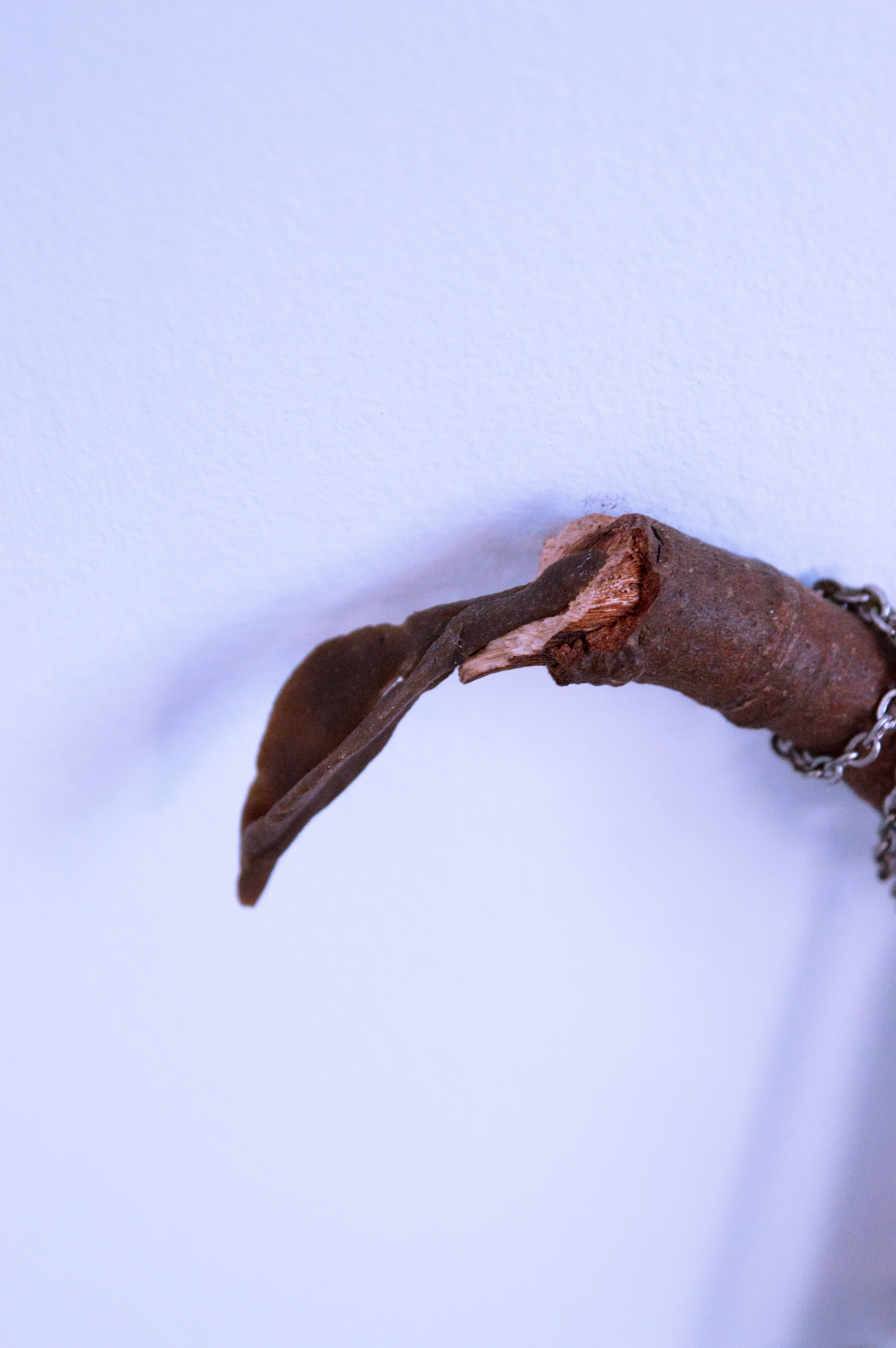 L’installation constitue une adaptation de mon projet de diplôme Bebas Maon après sa sélection par le jury et les curateur.ices de la manifestation Art Émergence. L’accrochage consiste en une multitude de compositions d’objets glanés ou issus de dons qui jaillissent des tirages extraits d’une série de 25 photographies. À leurs côtés, les sculptures de la série Fables se déploient dans l’espace transitoire qui mène du rez-de-chaussé à la mezzanine de la Chaufferie de la Fondation Fiminco. Le choix des photographies sélectionnées s’est fait d’un commun accord avec les curateur.ices Salomé Fau, Temitayo Olalekan et Alexis Hardy. Celles-ci ont ainsi déterminé la nature des fragments qui se retrouveraient dans l’installation. De cette façon, j’ai pu composer dans l’espace sur plusieurs jours et faire dialoguer les matériaux et leurs caractéristiques pour réactiver les contextes révolus des installations visibles dans les photographies. Ainsi une nouvelle lecture s’opère au travers de gestes adaptatifs, de recherches relationnelles dans les fragments, mais aussi des rencontres matériologiques propres à l’espace et son ambiance.