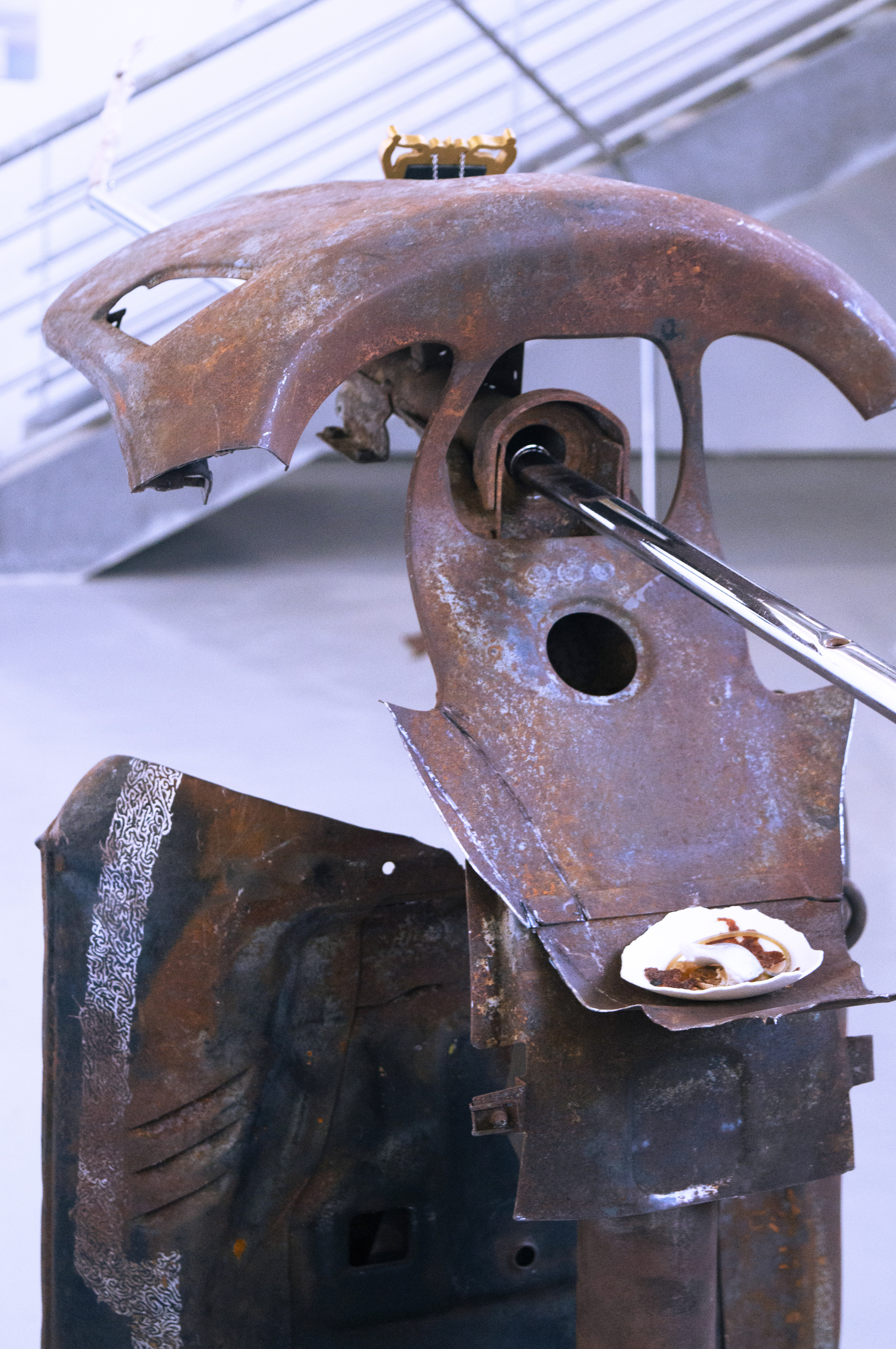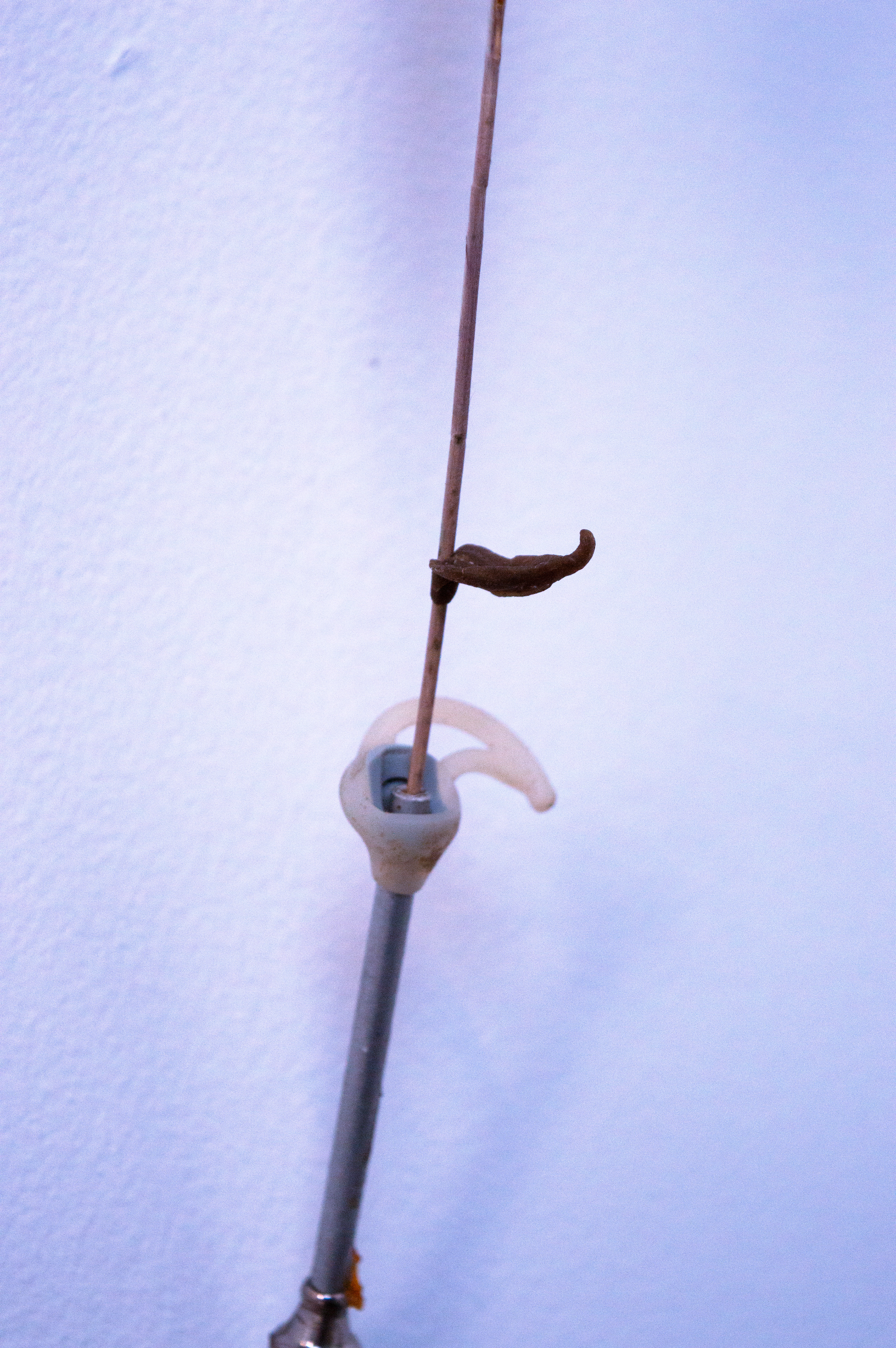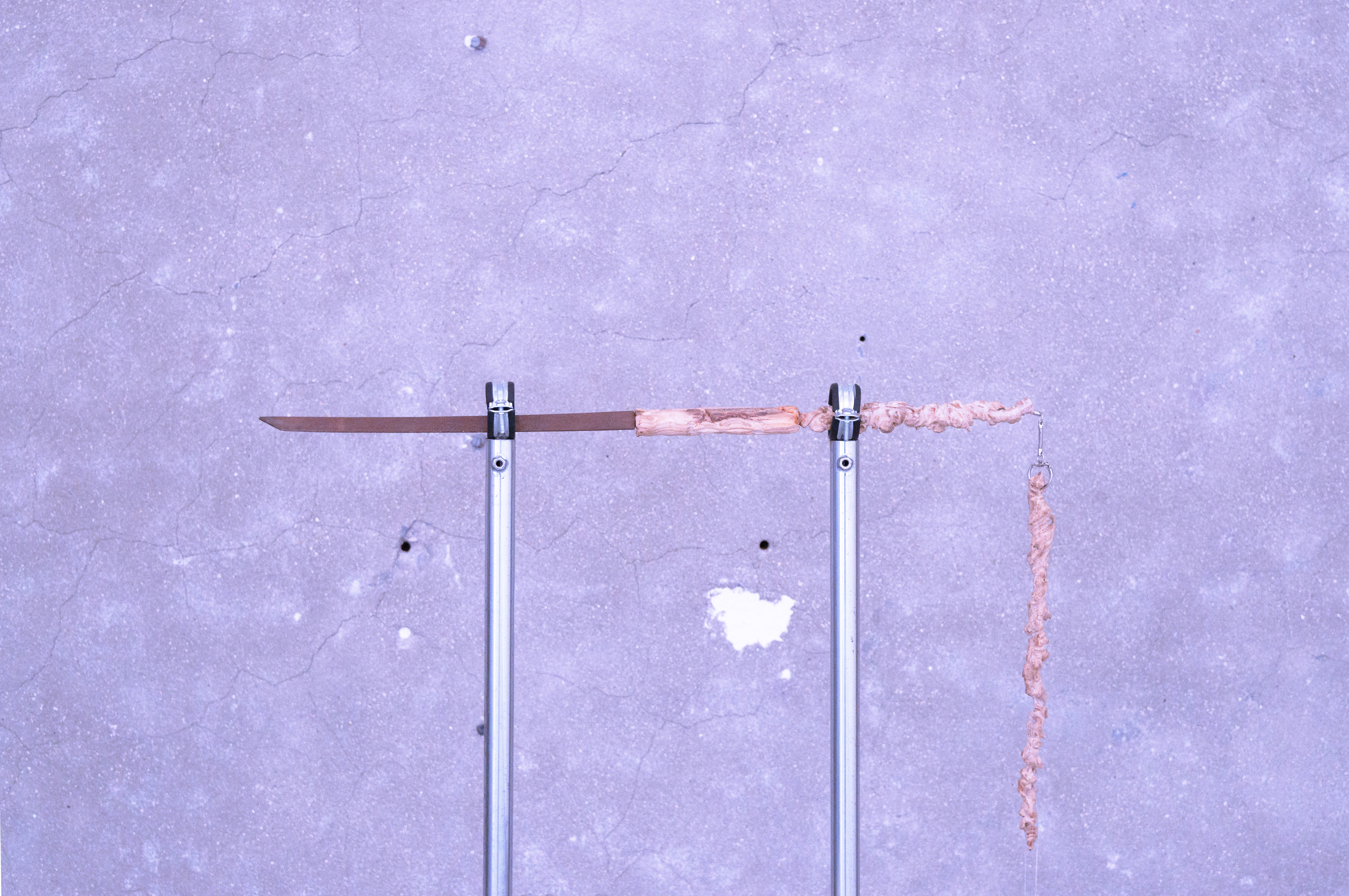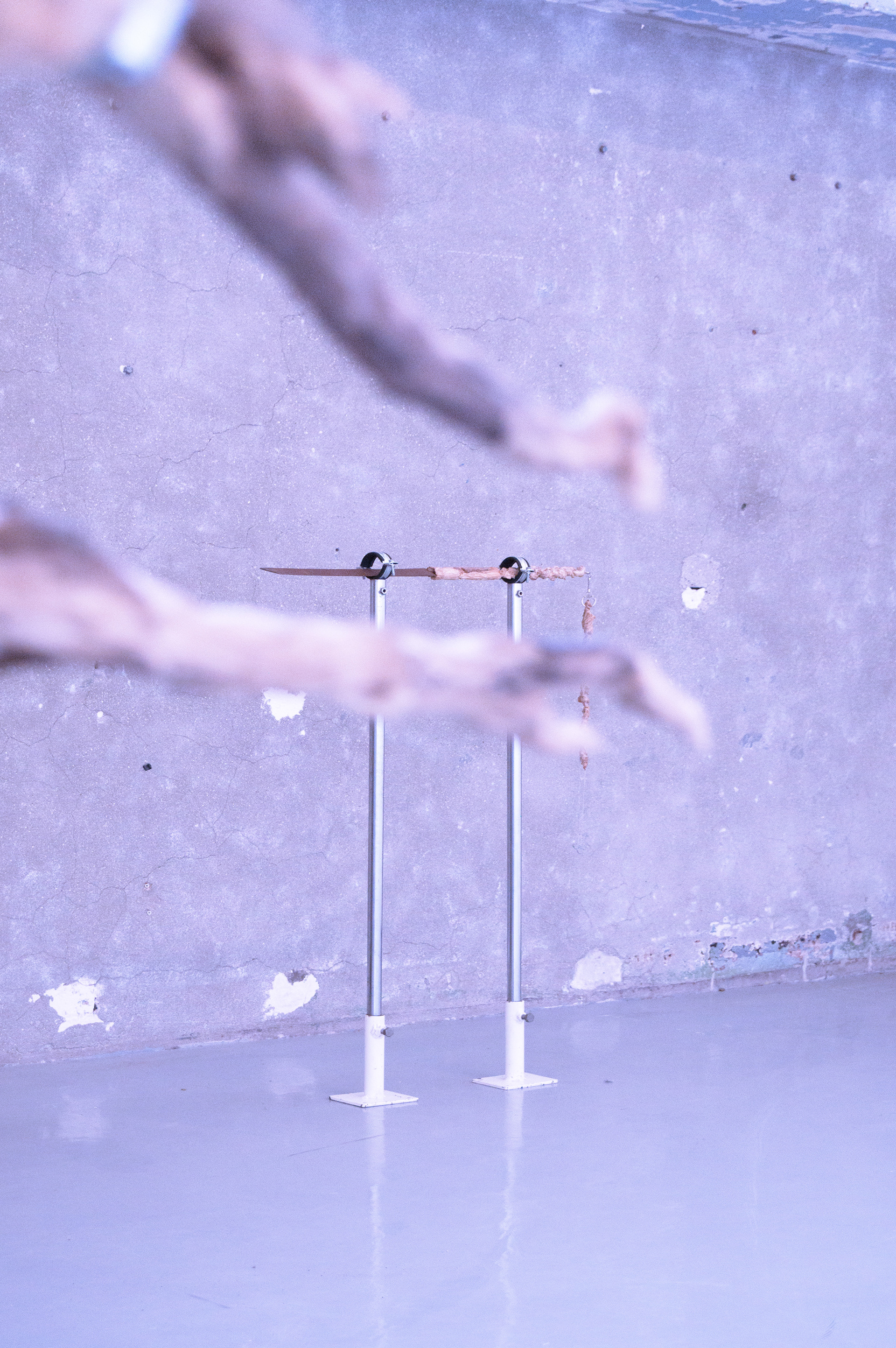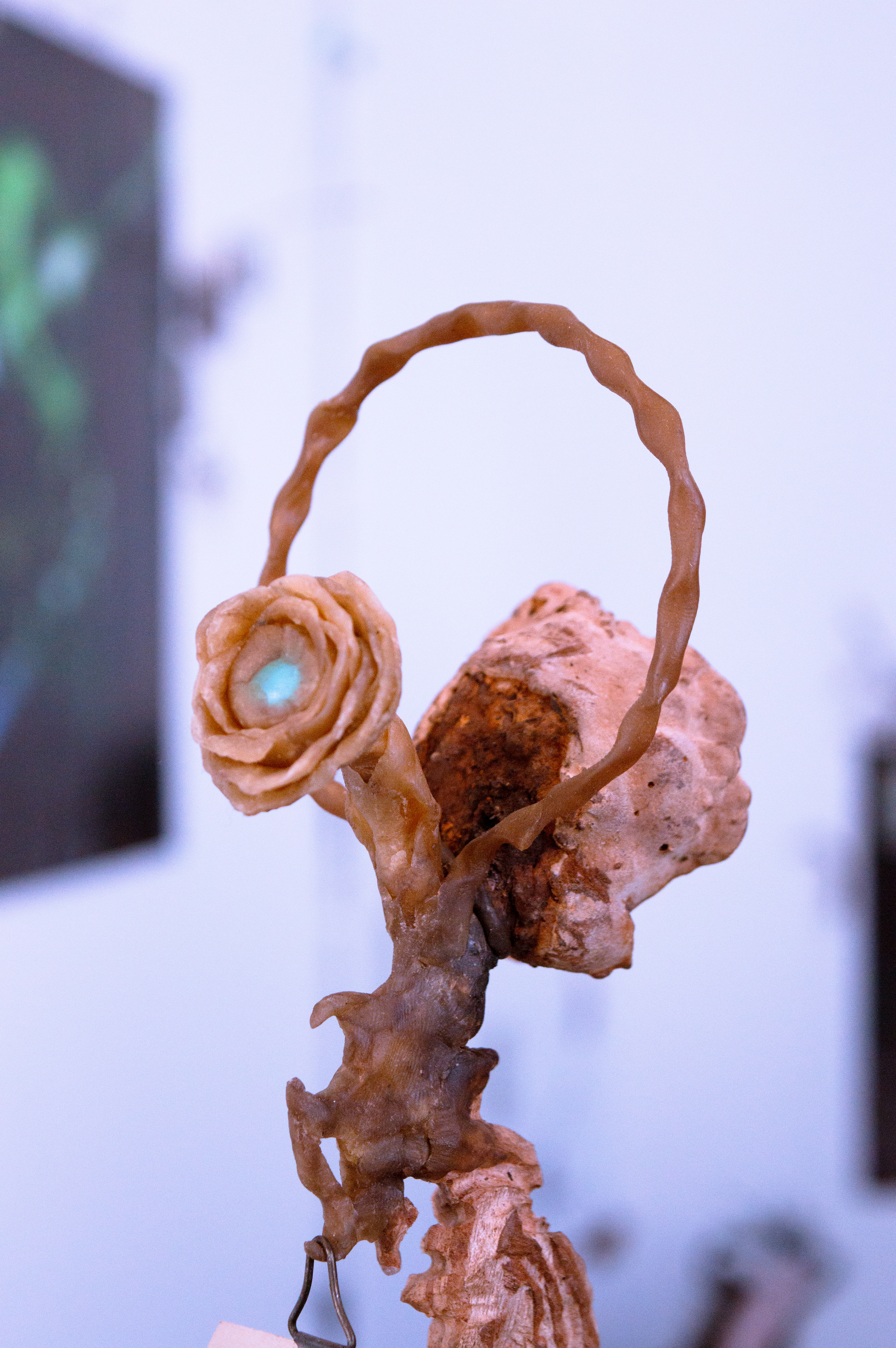 L’installation constitue une adaptation de mon projet de diplôme Bebas Maon après sa sélection par le jury et les curateur.ices de la manifestation Art Émergence. L’accrochage consiste en une multitude de compositions d’objets glanés ou issus de dons qui jaillissent des tirages extraits d’une série de 25 photographies. À leurs côtés, les sculptures de la série Fables se déploient dans l’espace transitoire qui mène du rez-de-chaussé à la mezzanine de la Chaufferie de la Fondation Fiminco. Le choix des photographies sélectionnées s’est fait d’un commun accord avec les curateur.ices Salomé Fau, Temitayo Olalekan et Alexis Hardy. Celles-ci ont ainsi déterminé la nature des fragments qui se retrouveraient dans l’installation. De cette façon, j’ai pu composer dans l’espace sur plusieurs jours et faire dialoguer les matériaux et leurs caractéristiques pour réactiver les contextes révolus des installations visibles dans les photographies. Ainsi une nouvelle lecture s’opère au travers de gestes adaptatifs, de recherches relationnelles dans les fragments, mais aussi des rencontres matériologiques propres à l’espace et son ambiance.