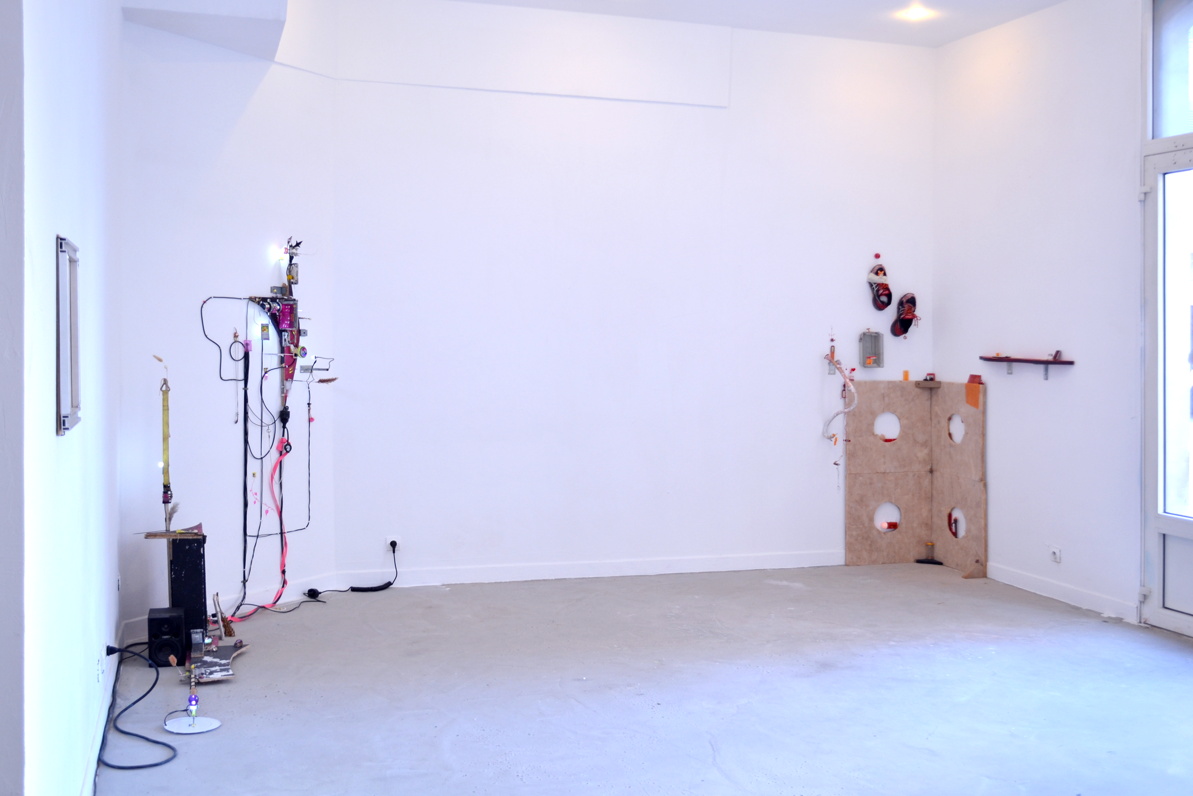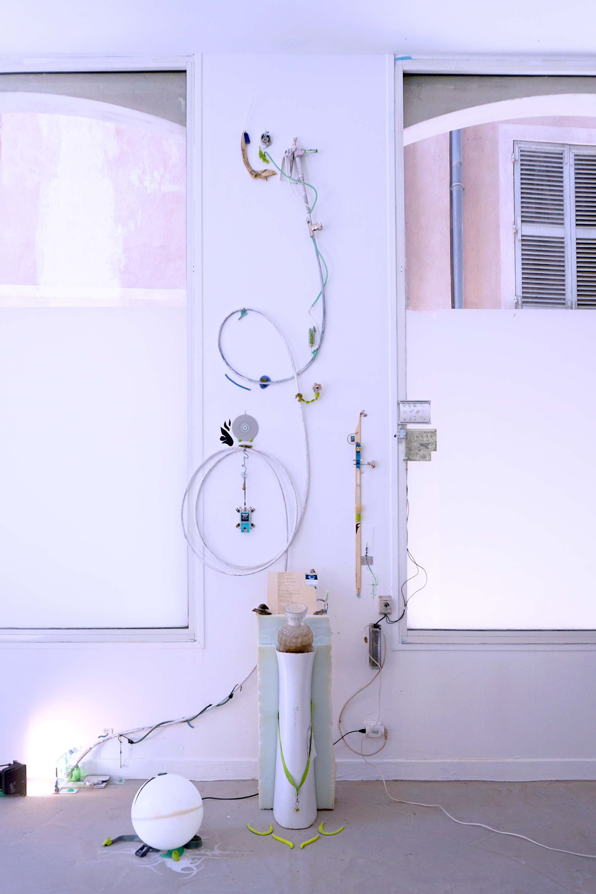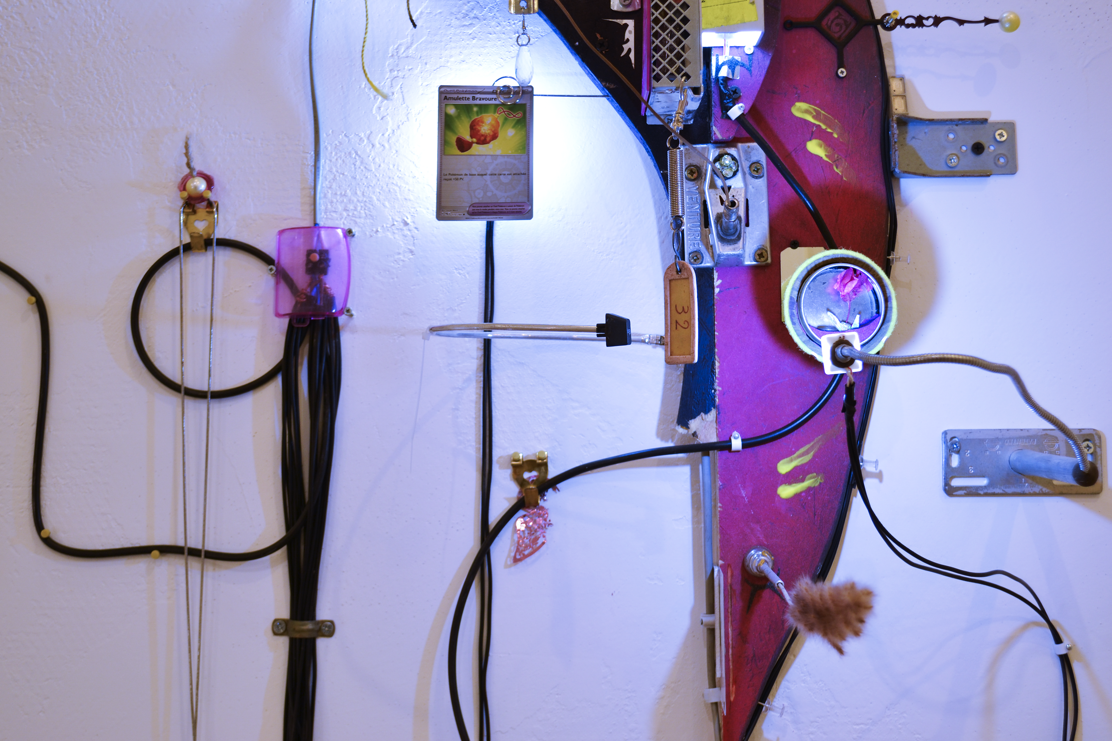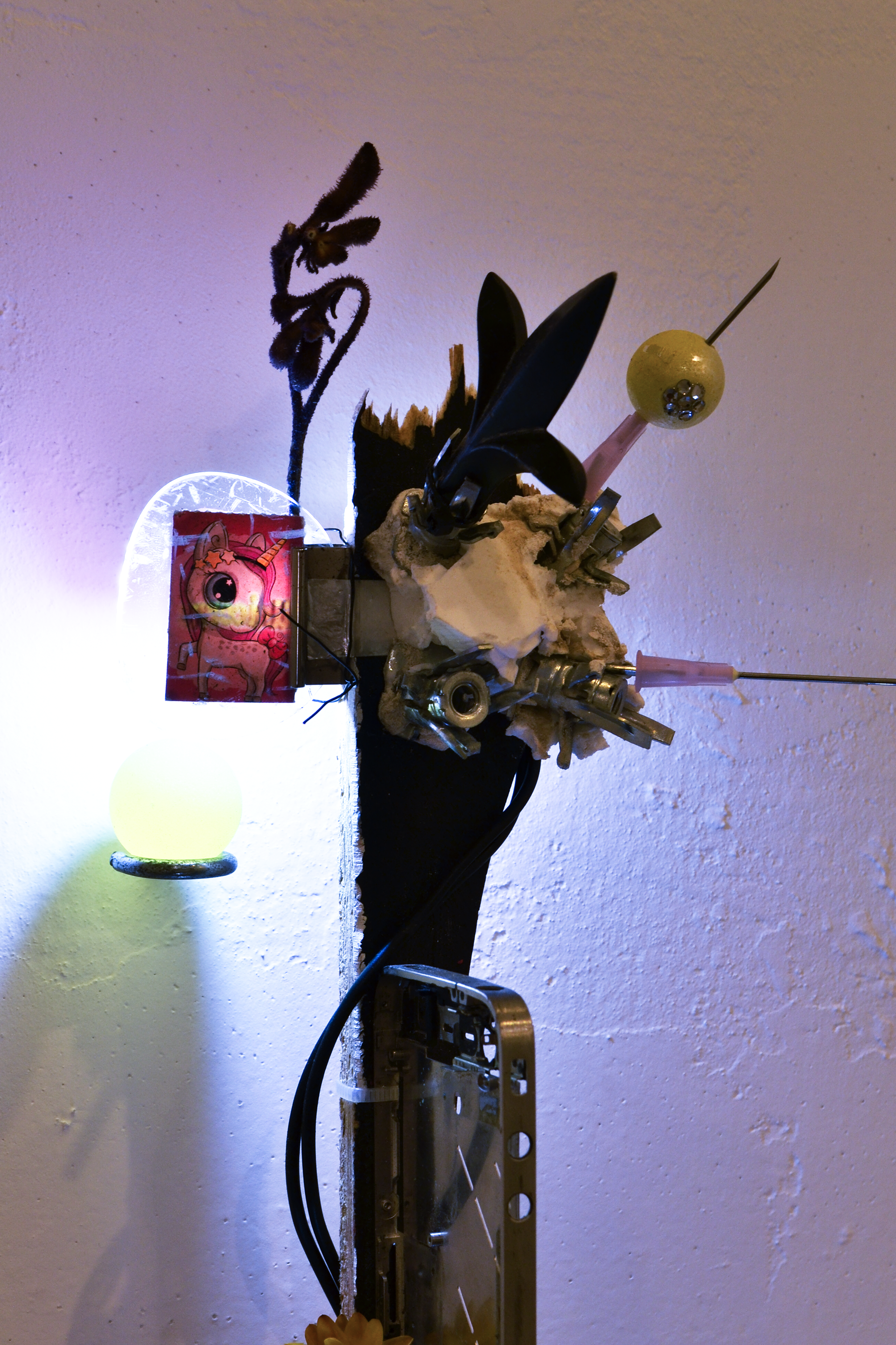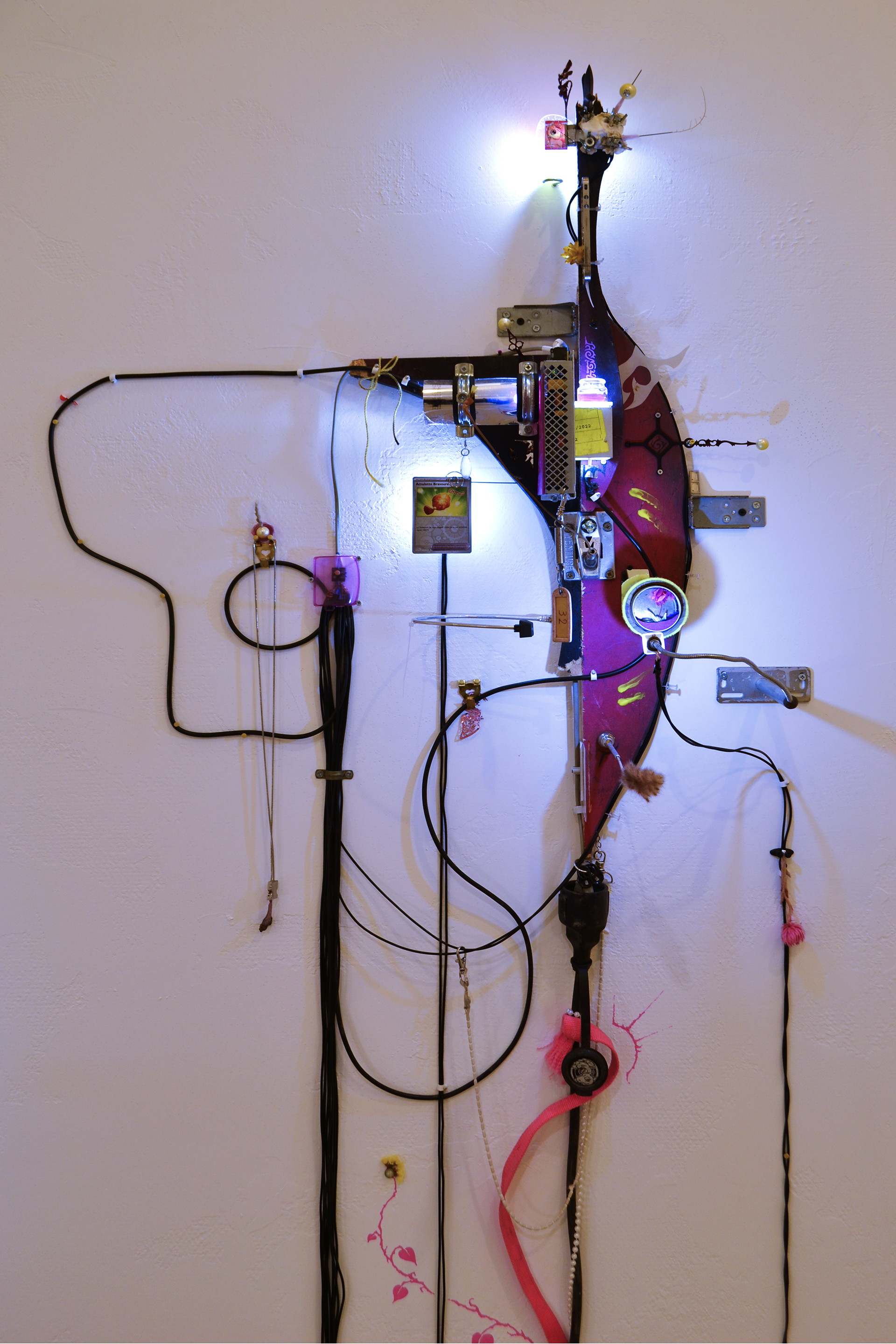 assemblage sculptural, dimensions variables, objets glanés, matériel électronique récupéré, peinture acrylique, dessins