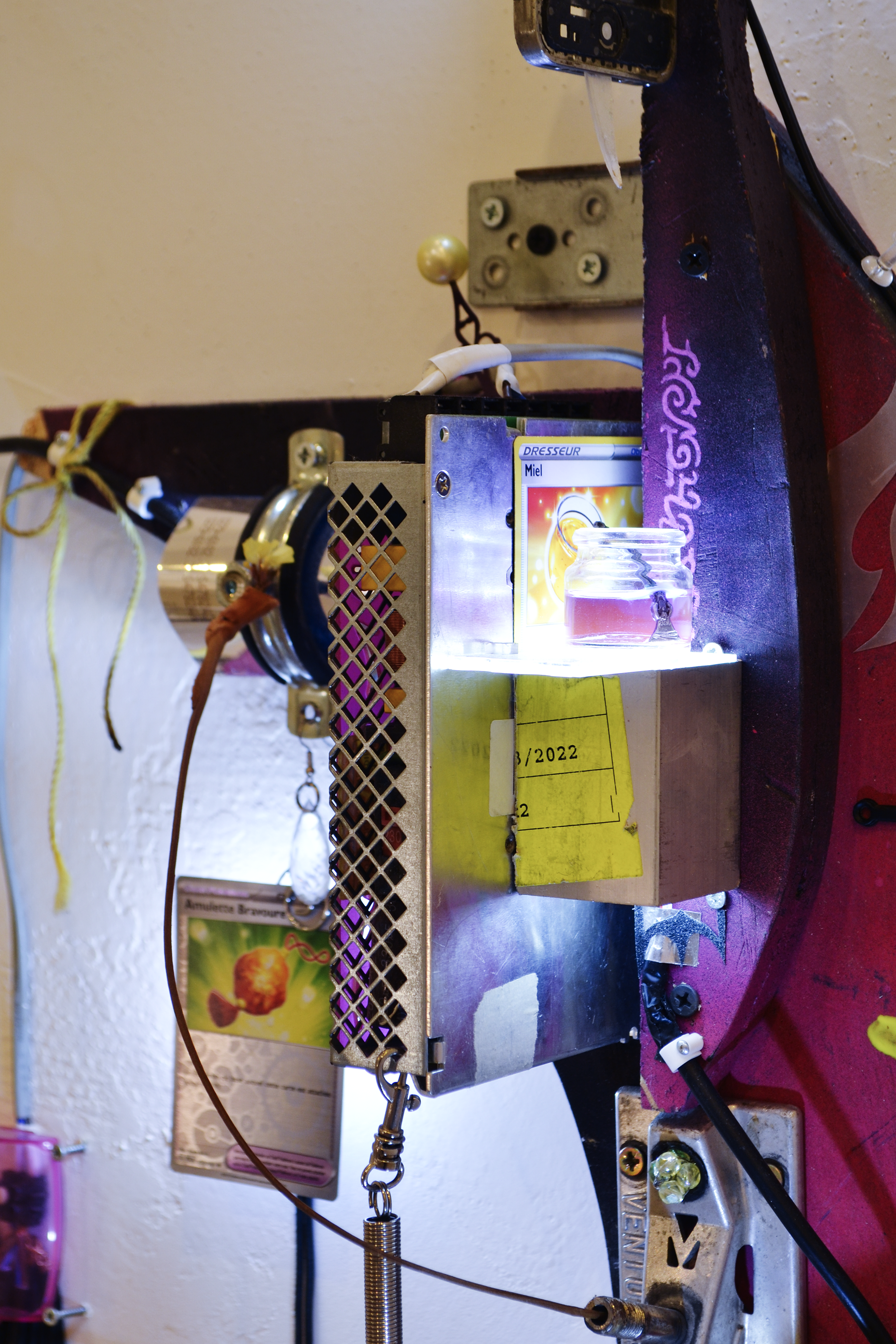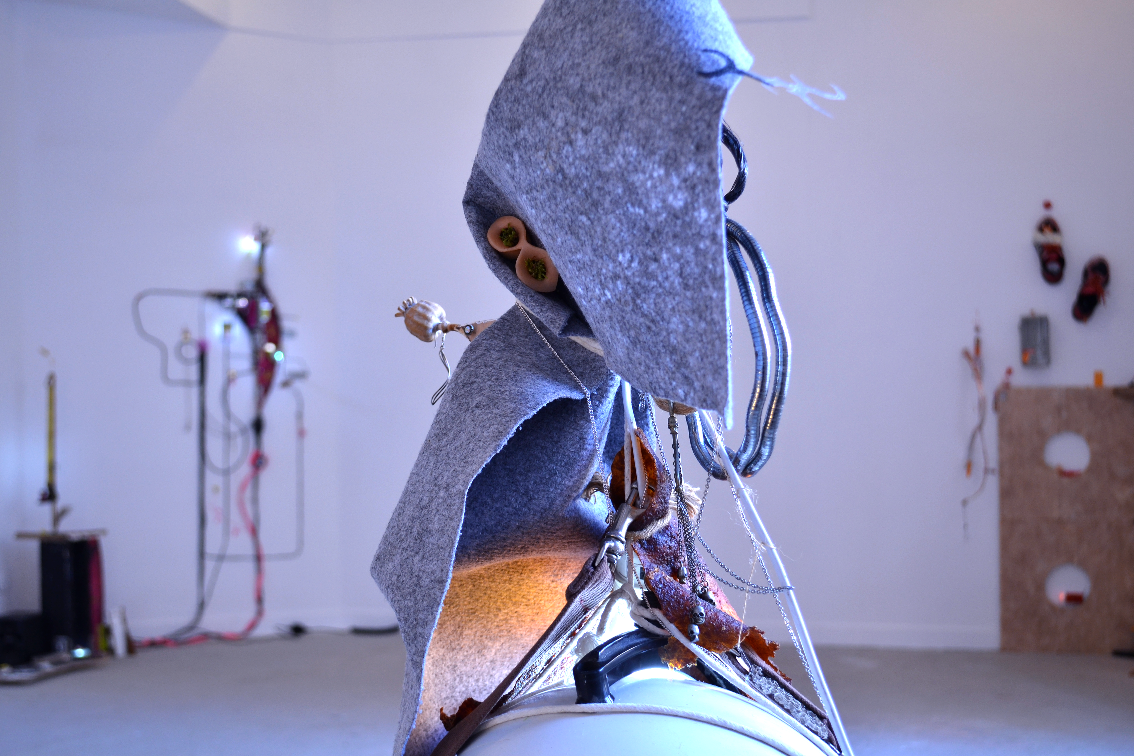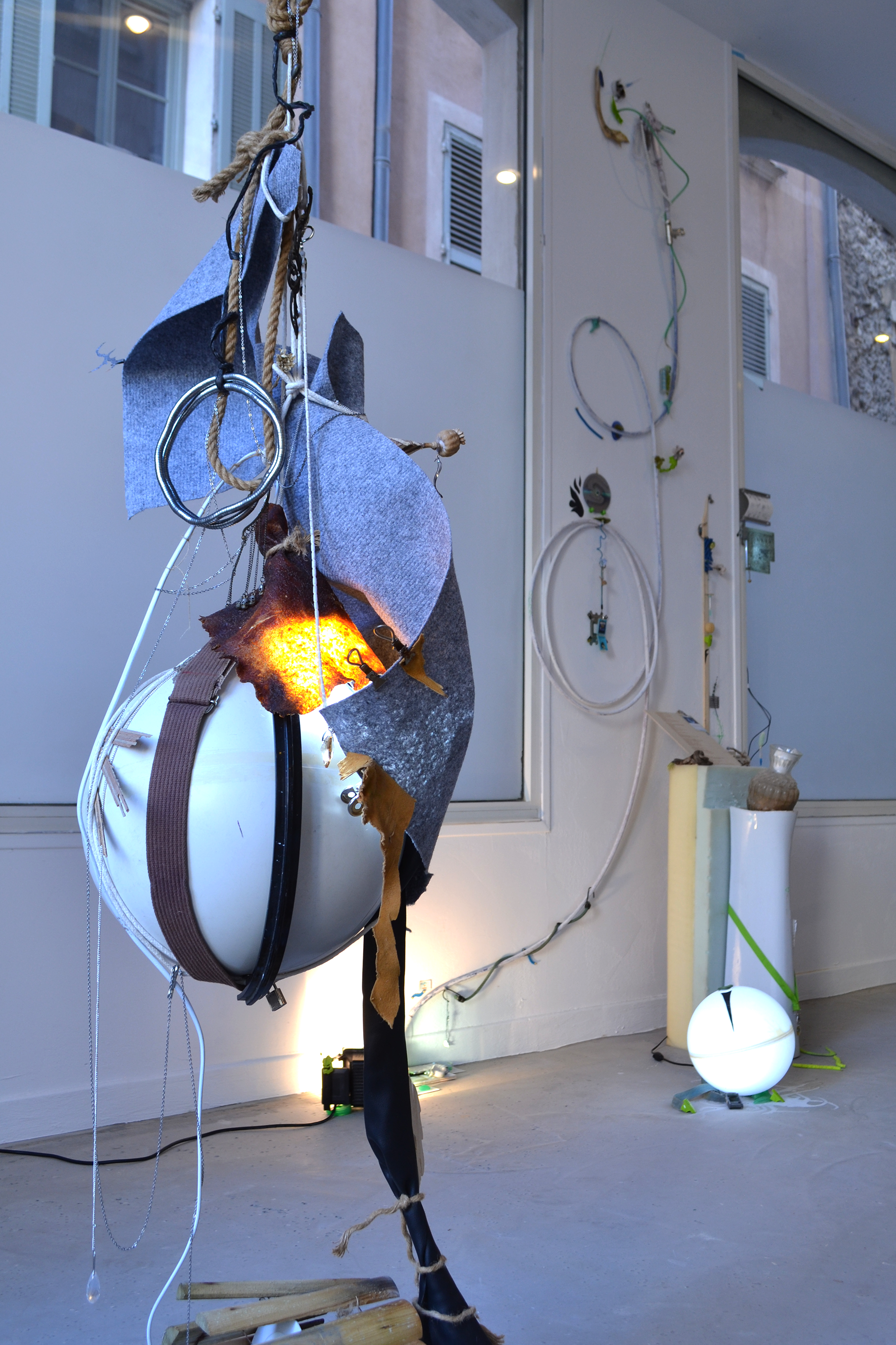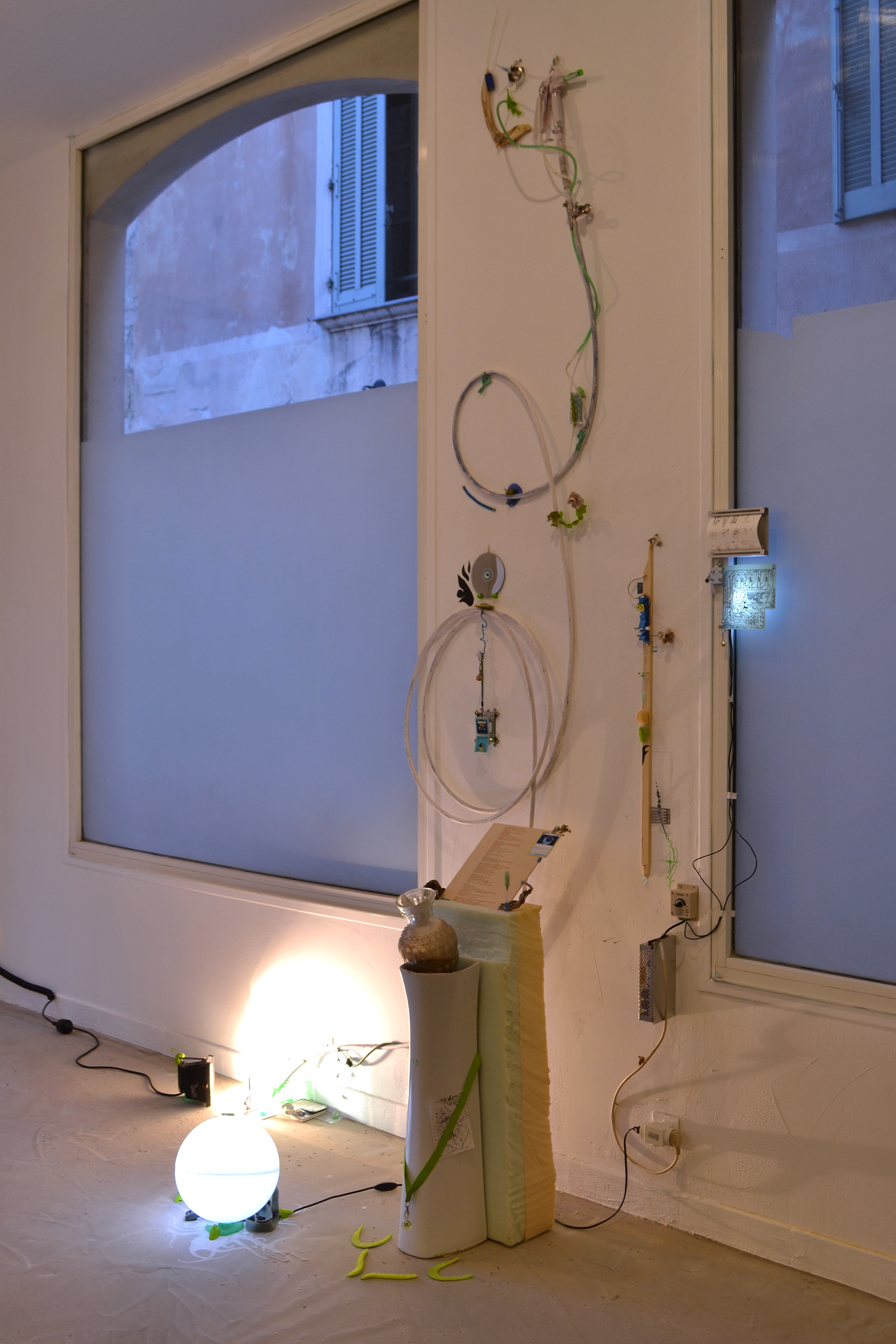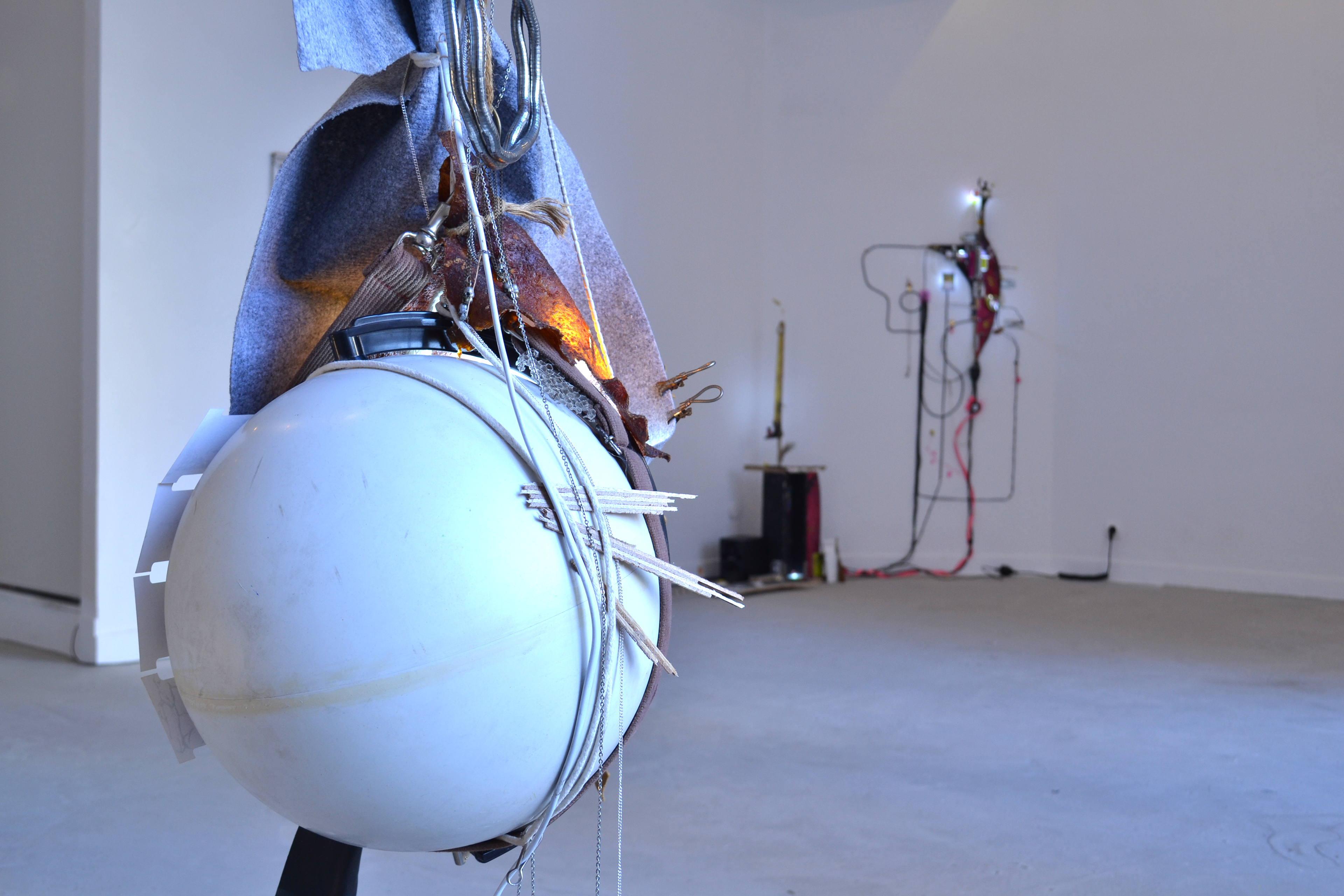 assemblage sculptural, dimensions variables, objets glanés, matériel électronique récupéré, peinture acrylique, dessins