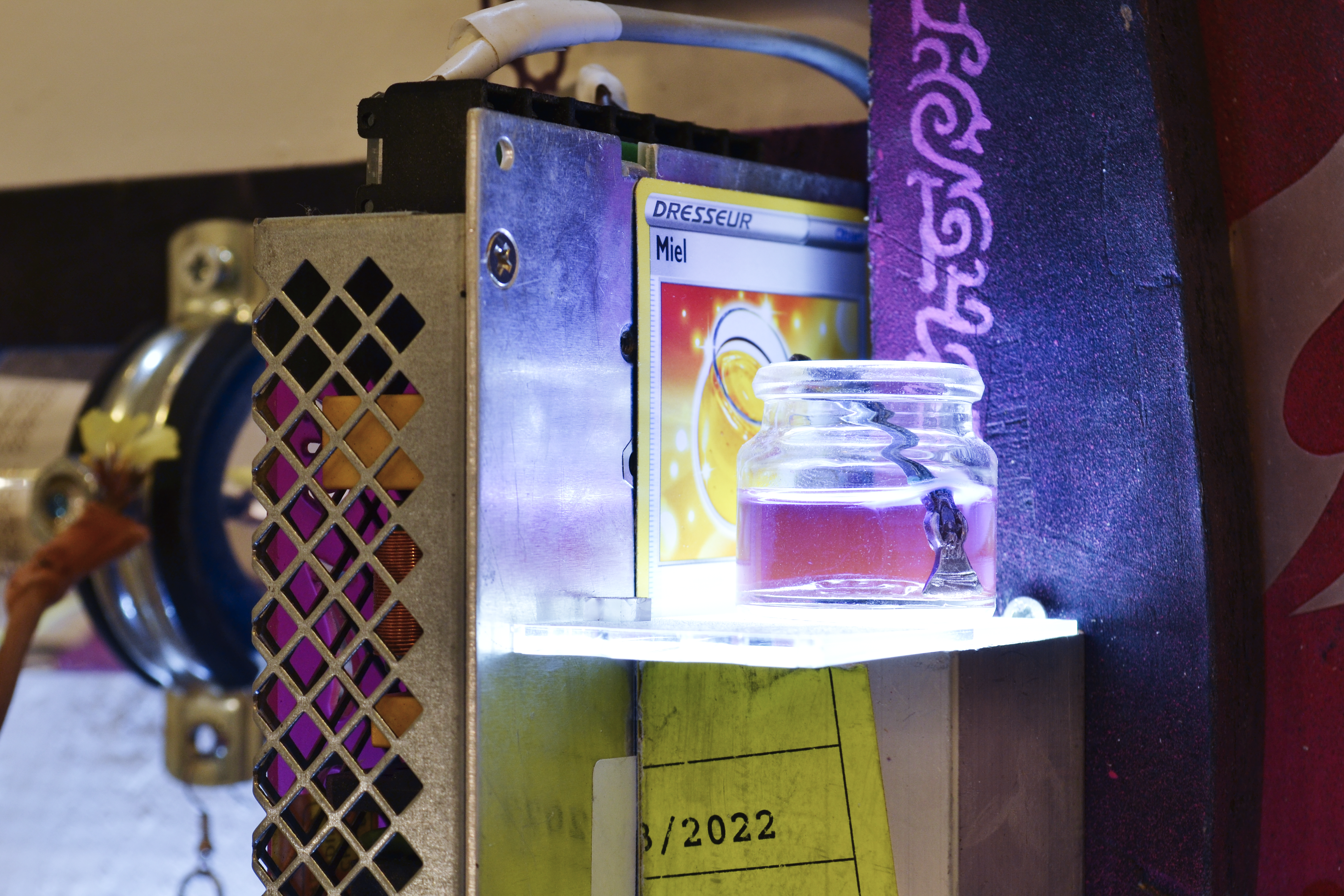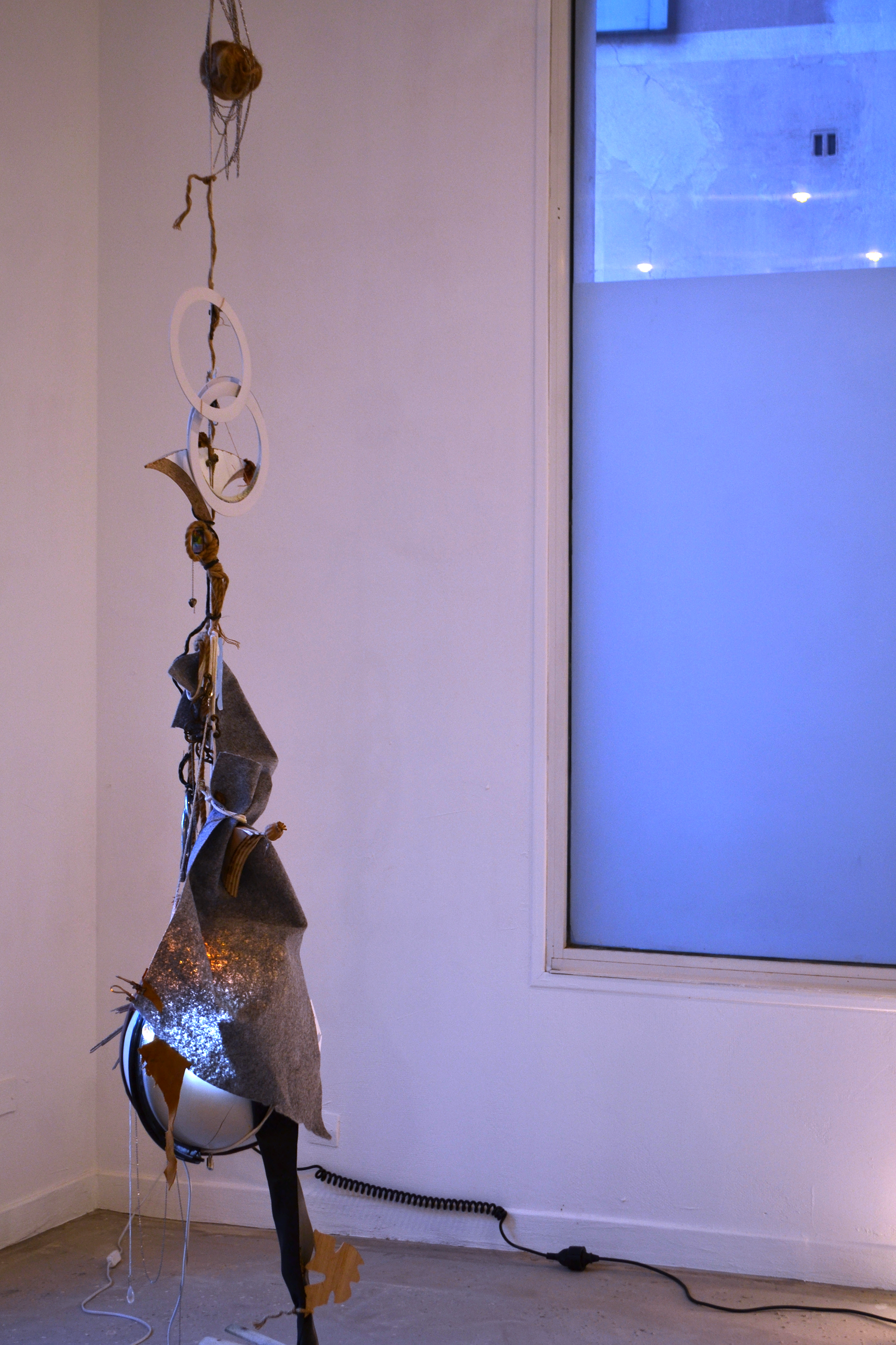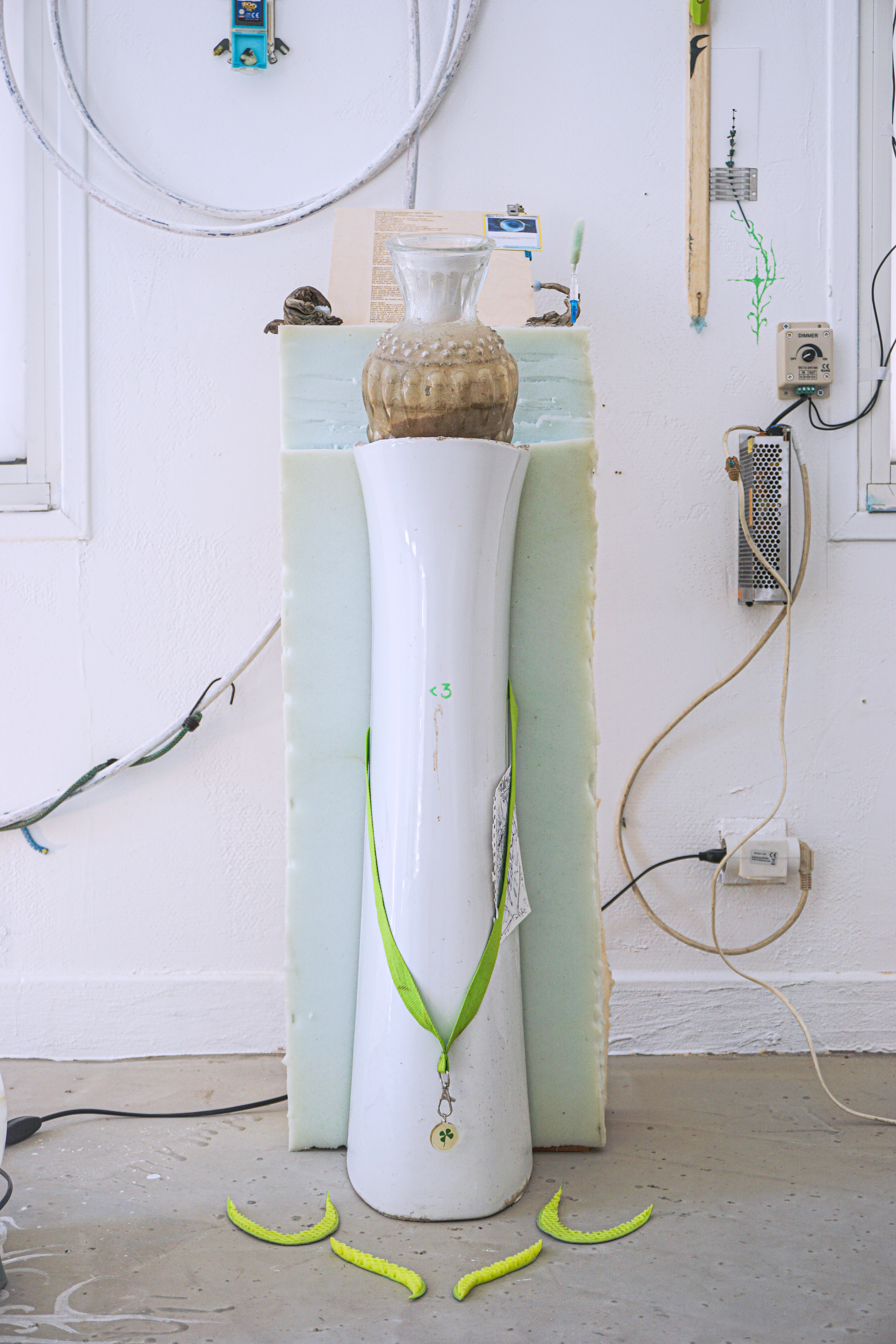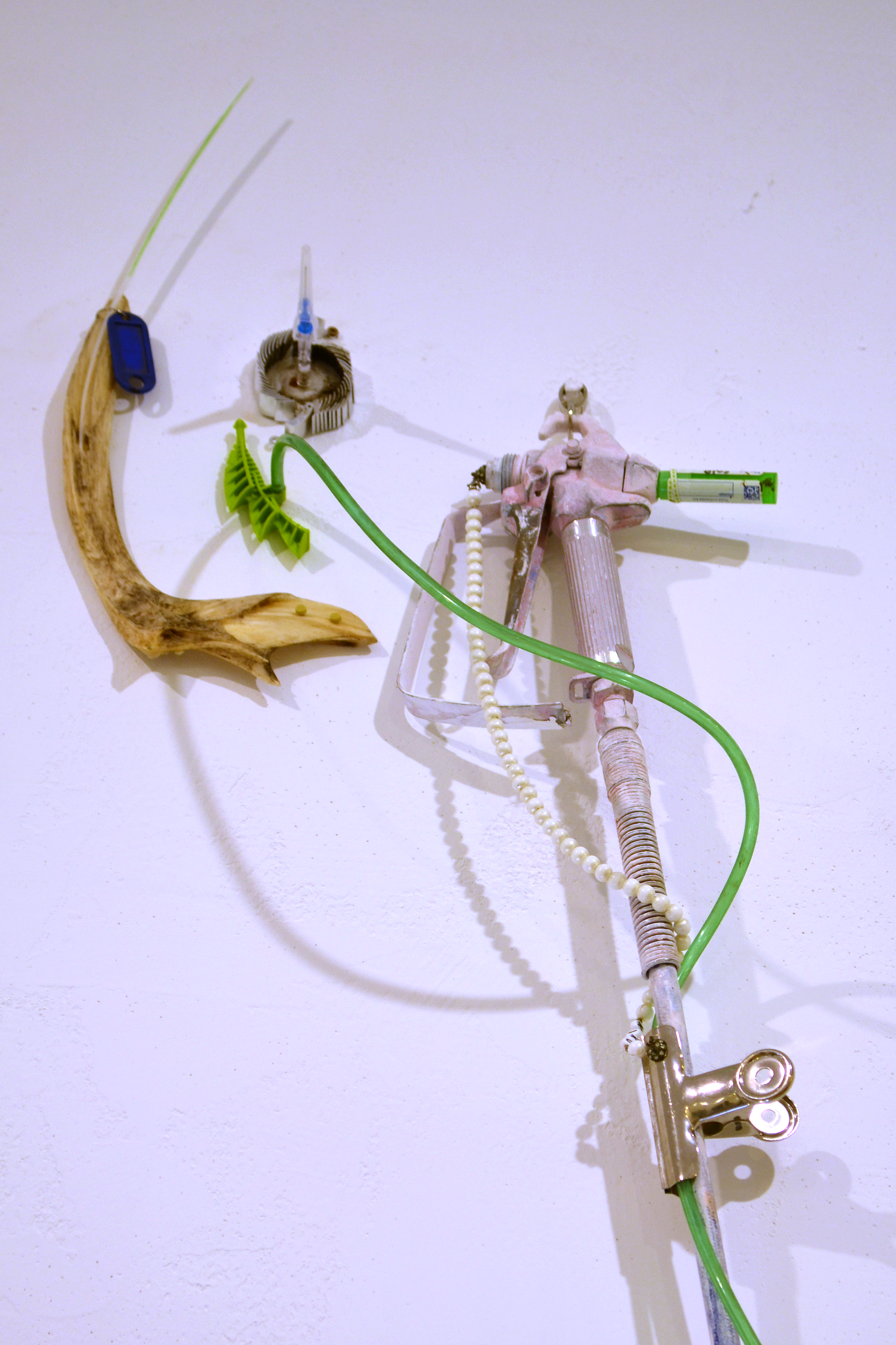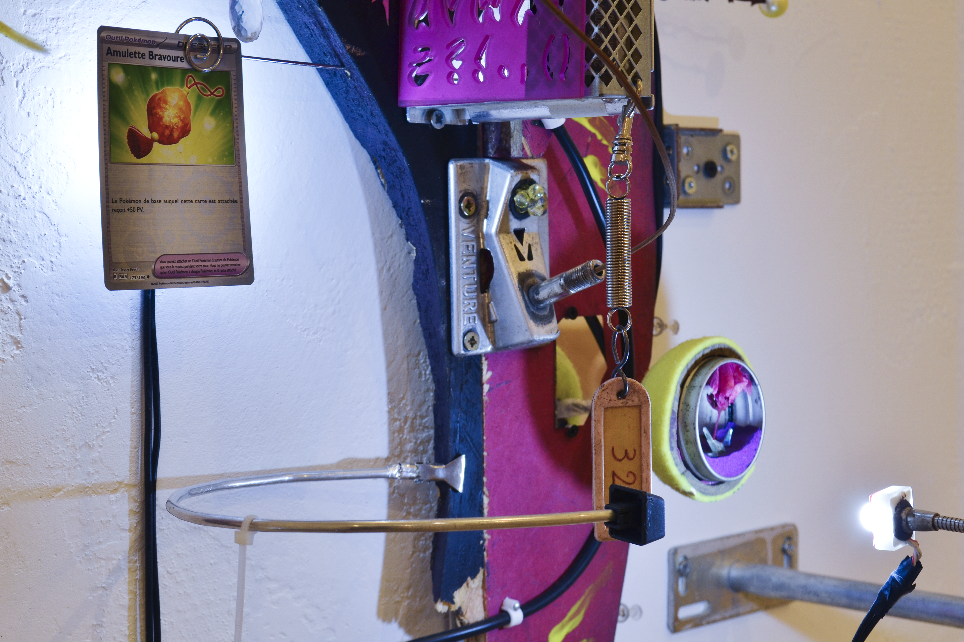 assemblage sculptural, dimensions variables, objets glanés, matériel électronique récupéré, peinture acrylique, dessins