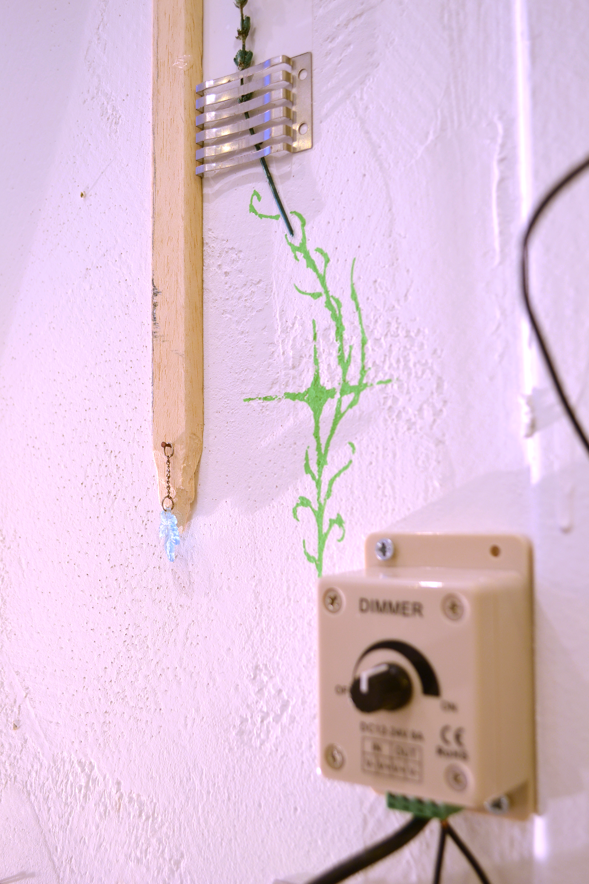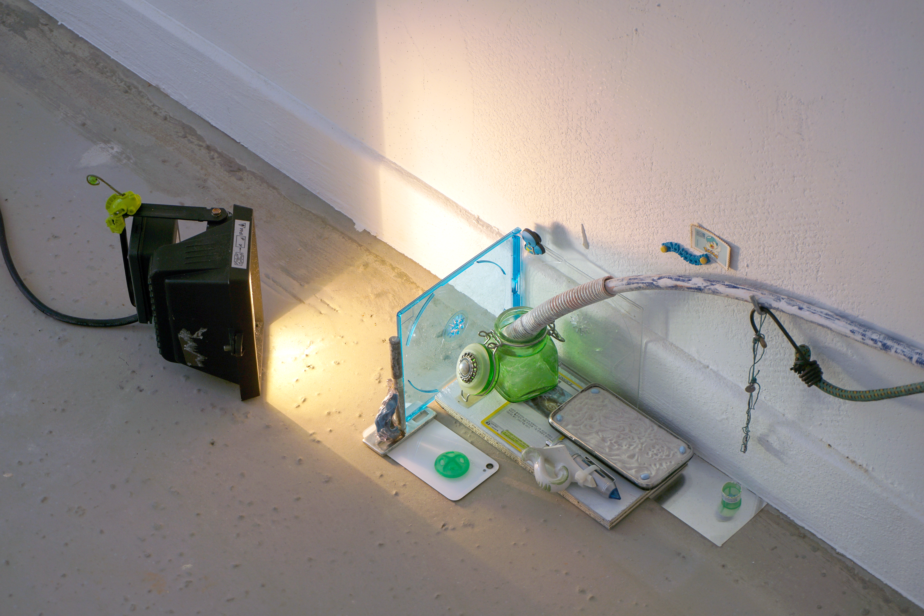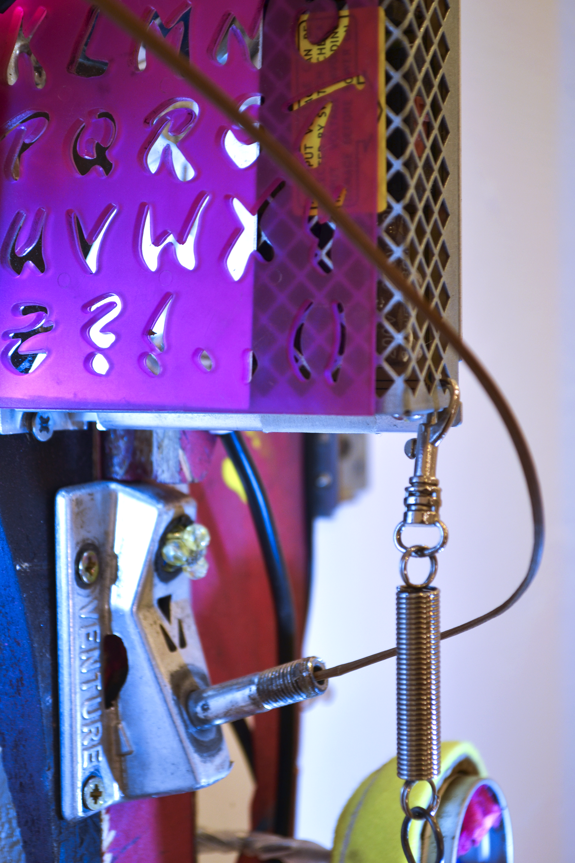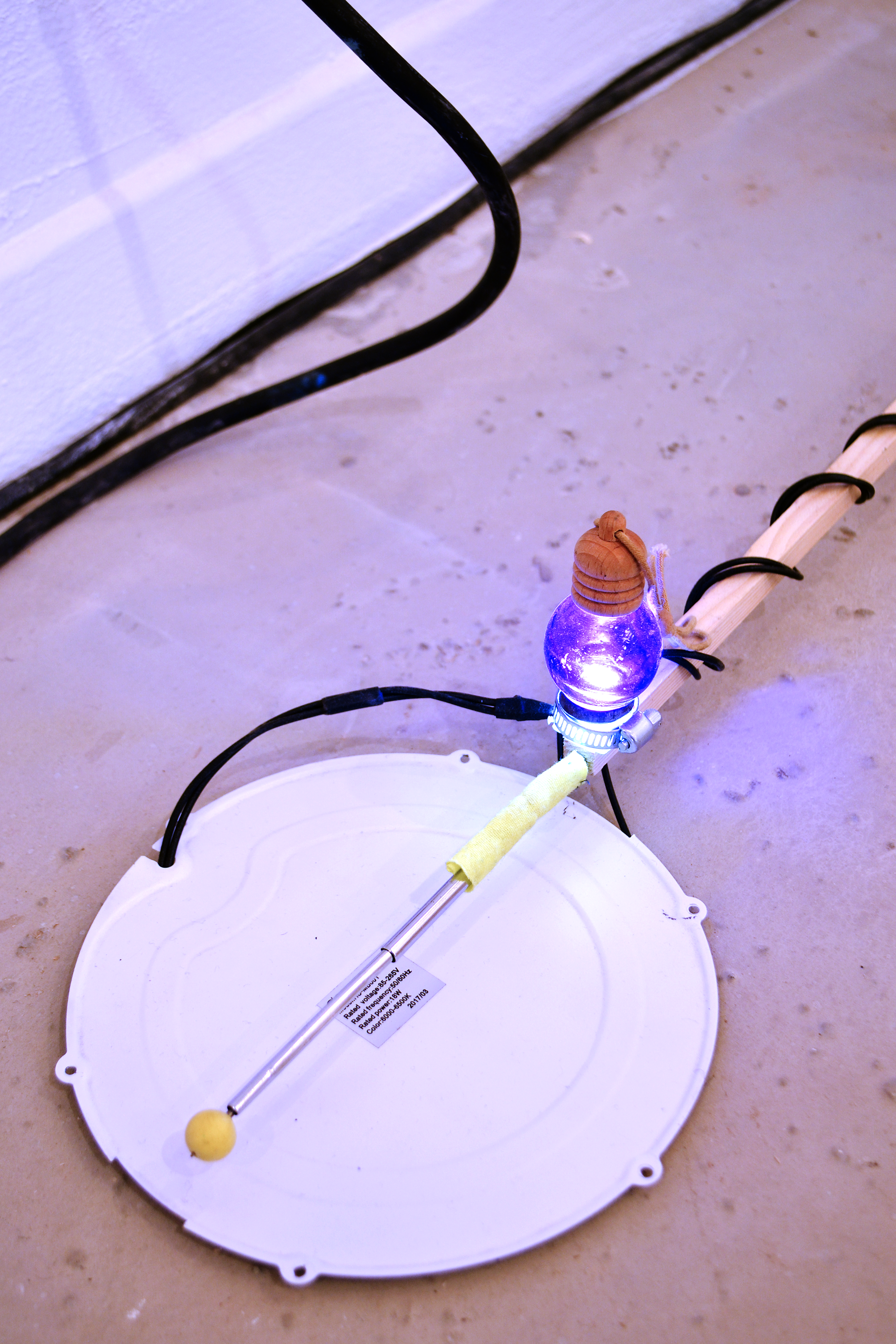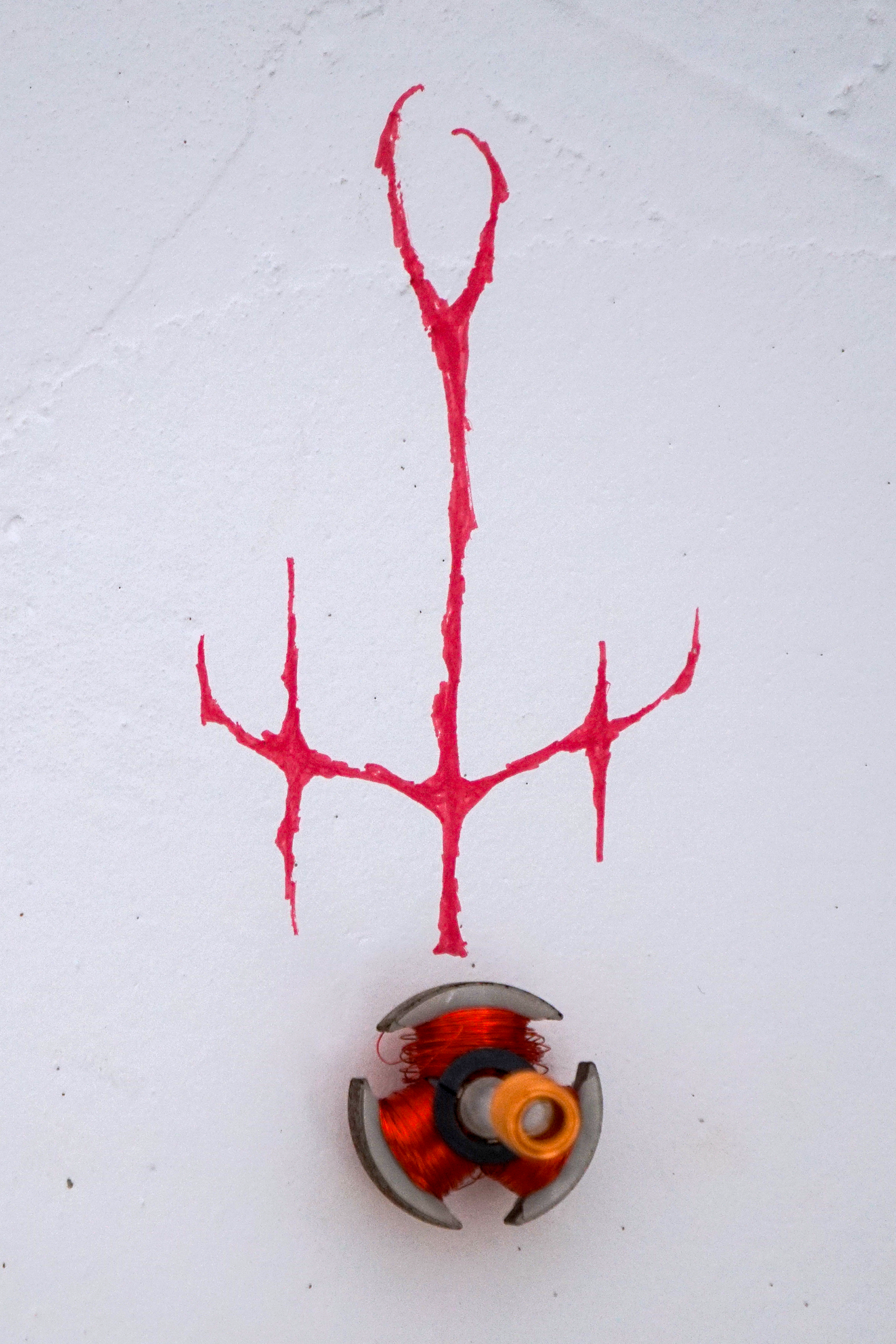 assemblage sculptural, dimensions variables, objets glanés, matériel électronique récupéré, peinture acrylique, dessins