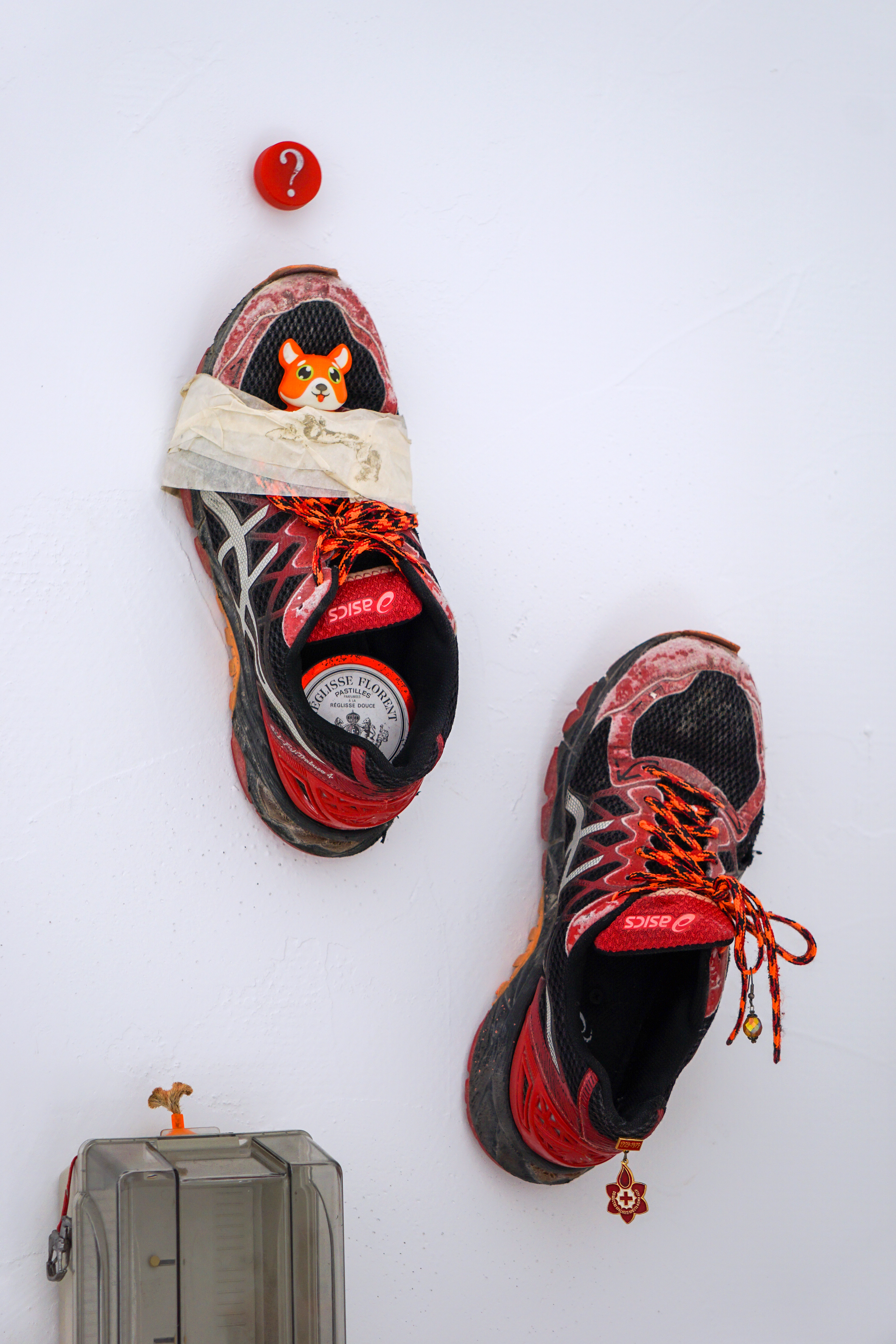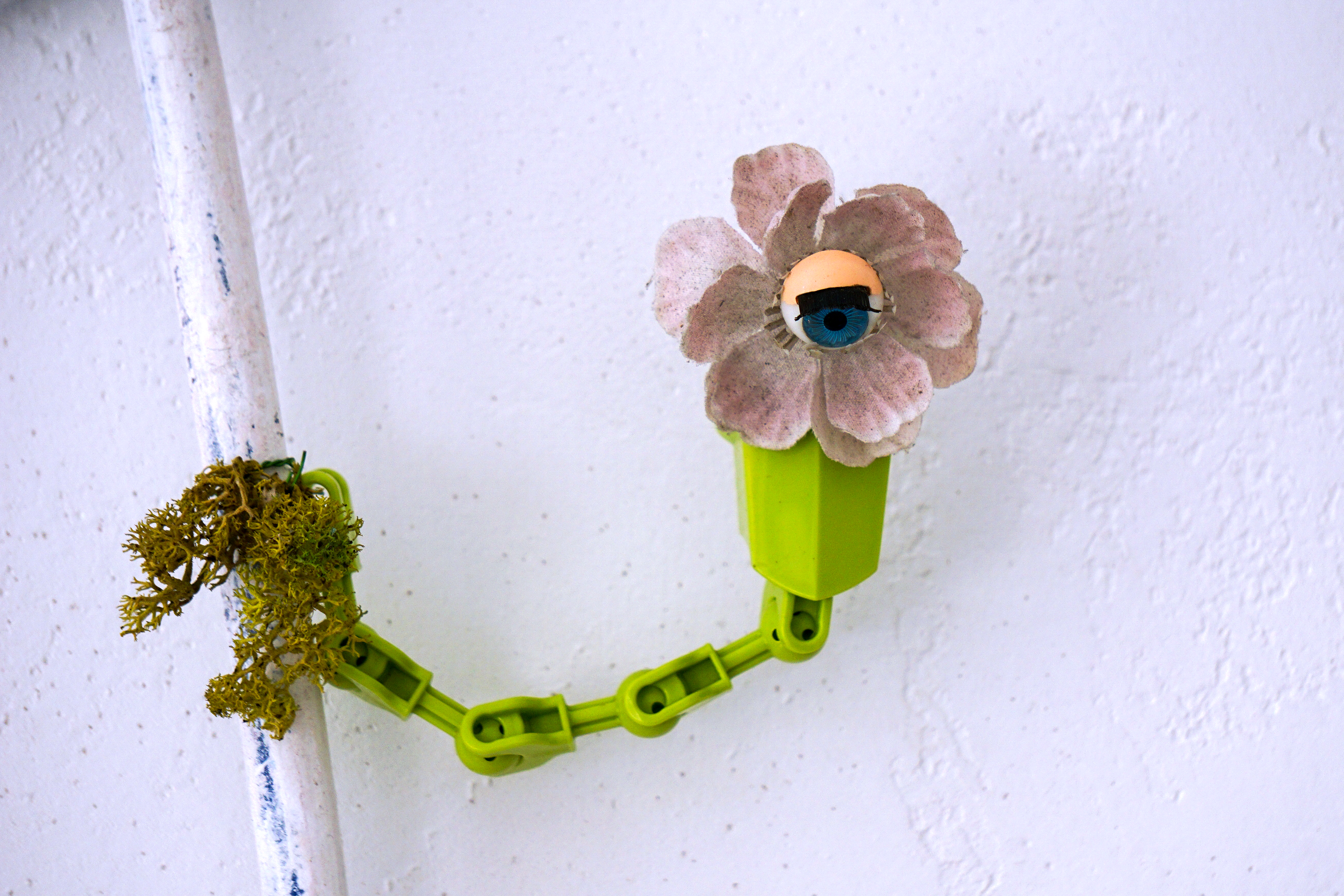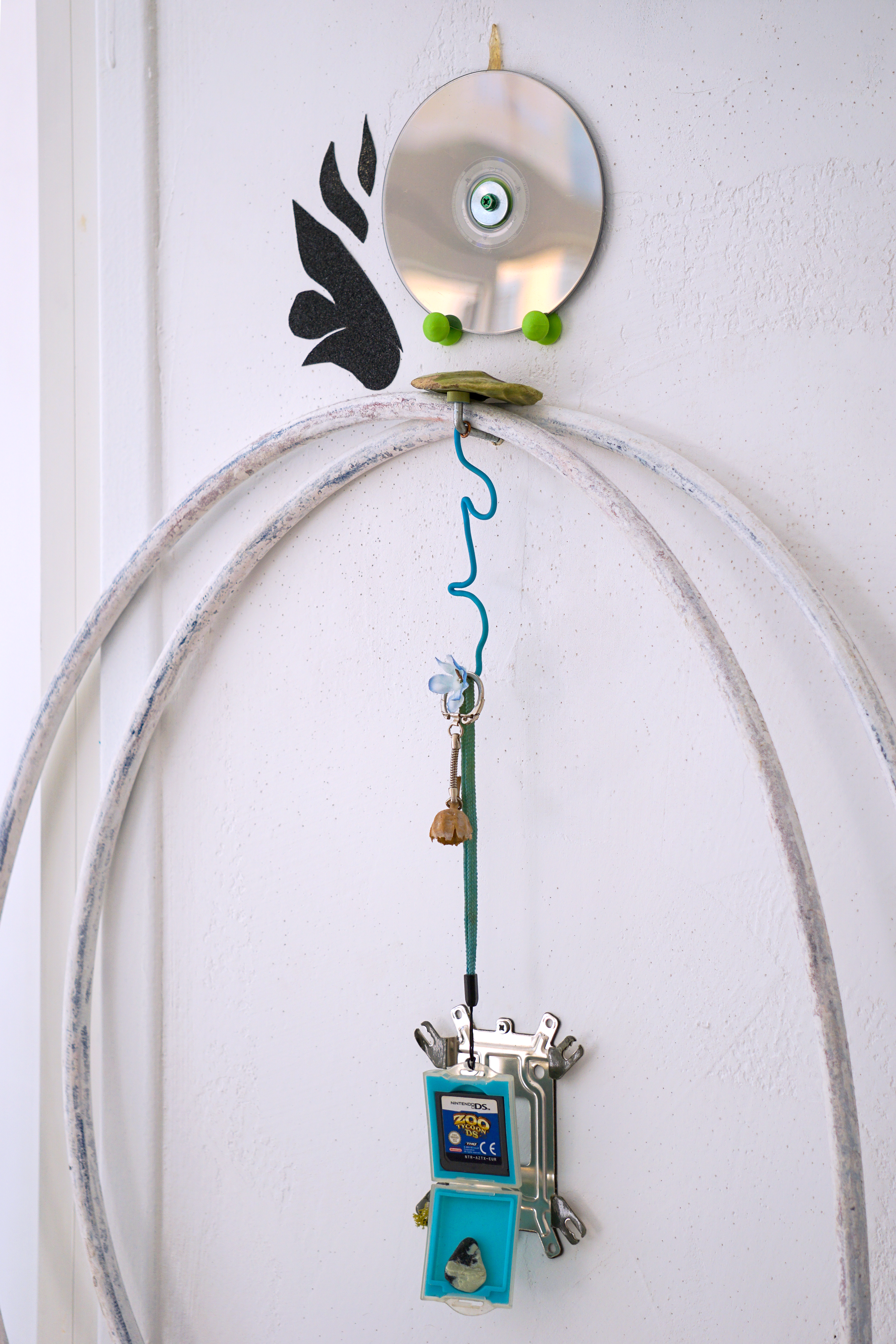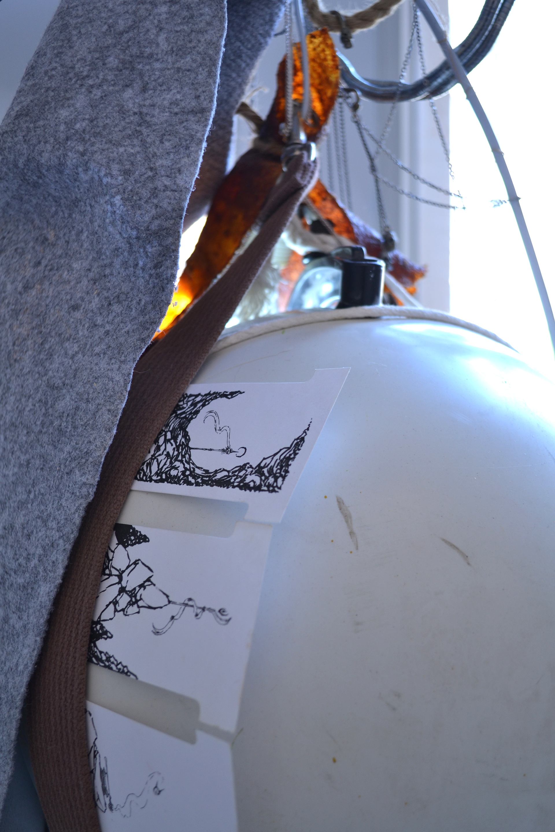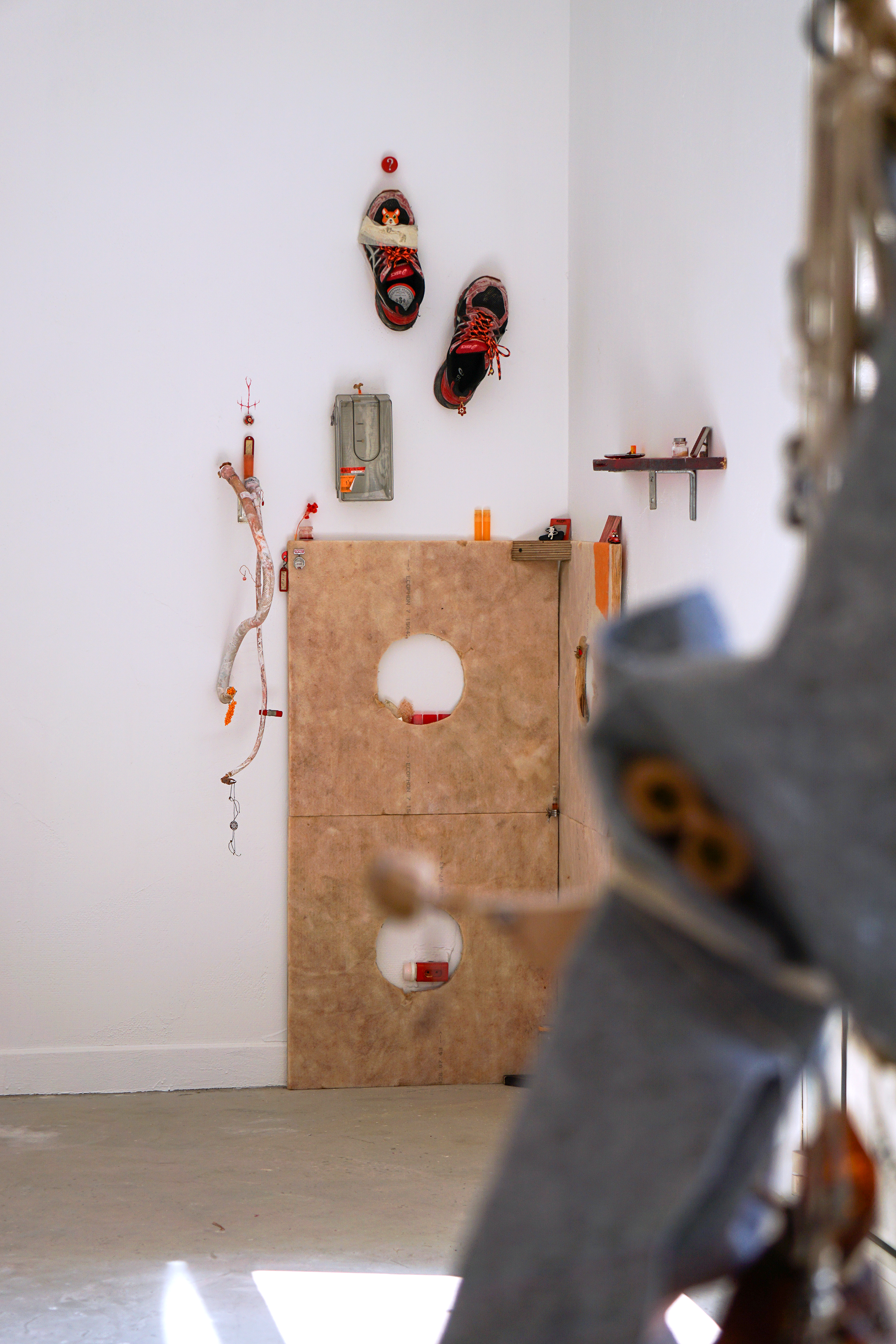 assemblage sculptural, dimensions variables, objets glanés, matériel électronique récupéré, peinture acrylique, dessins