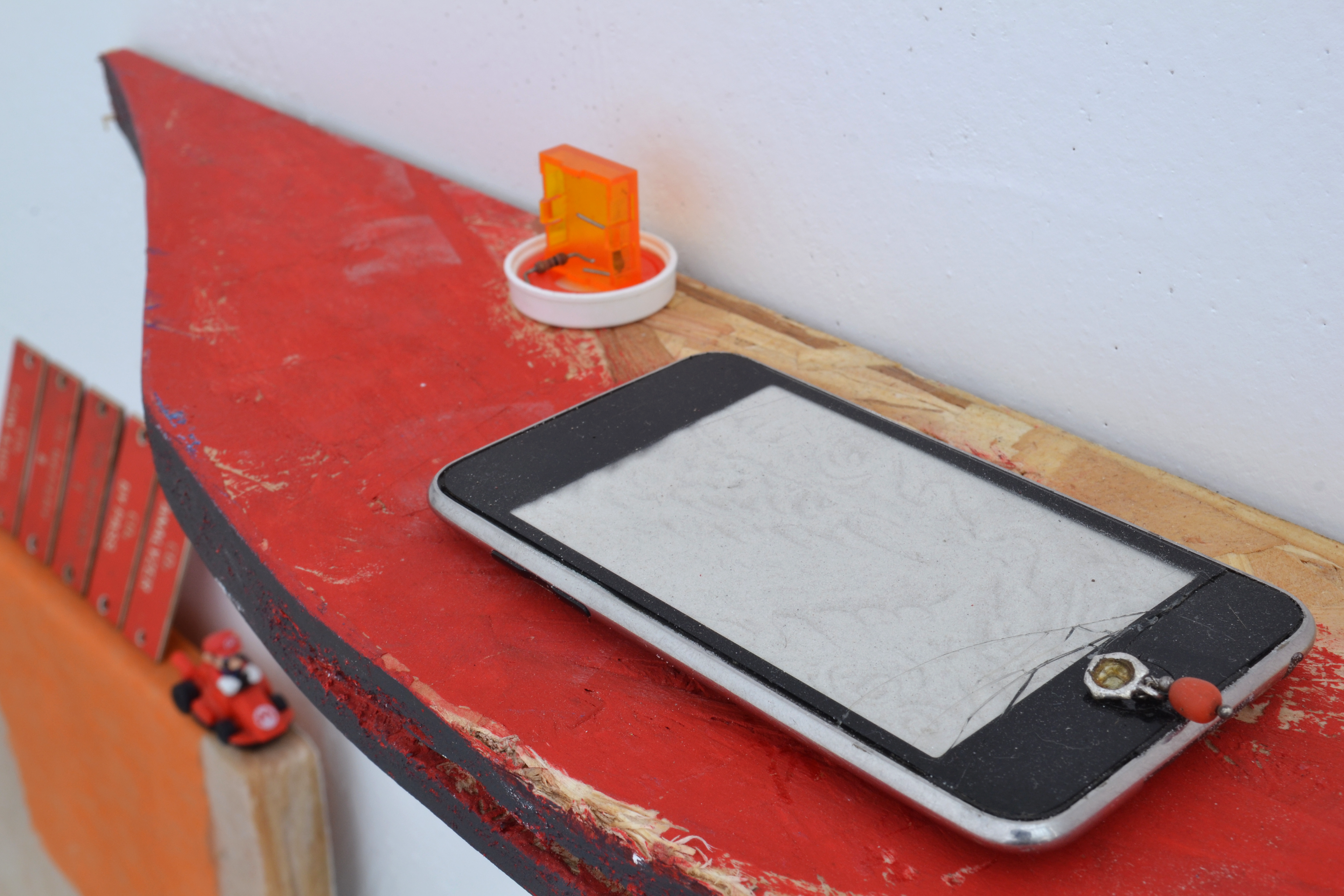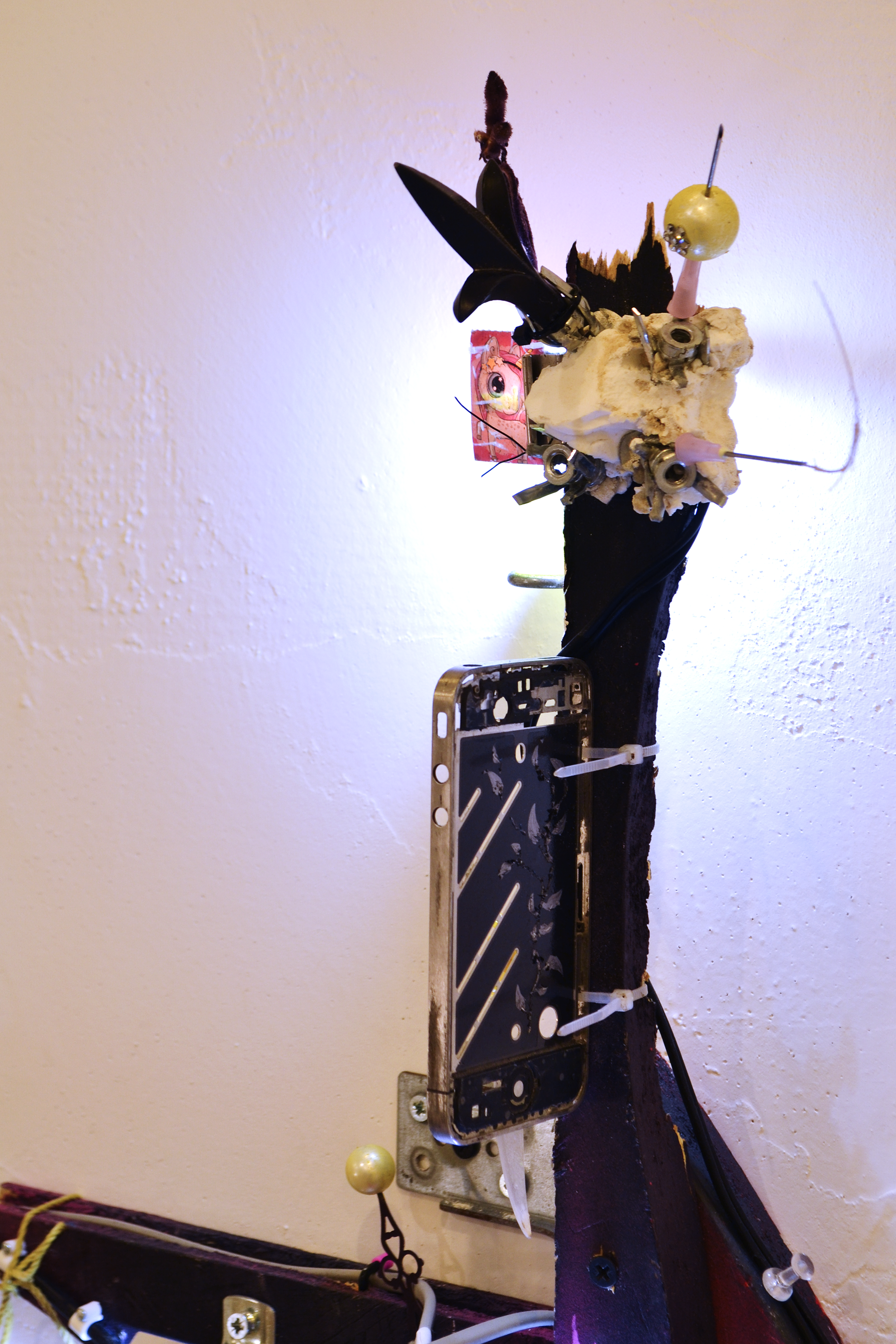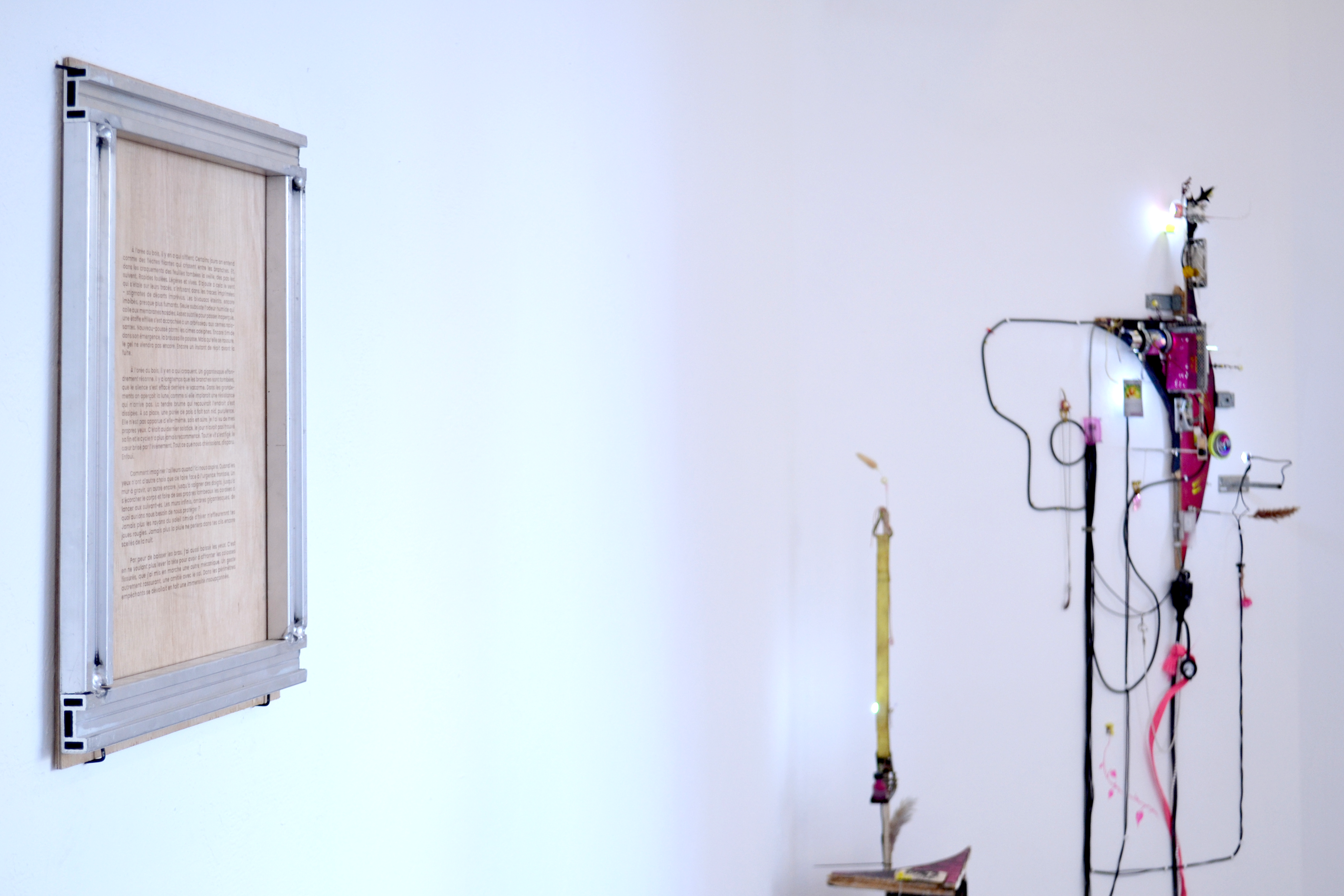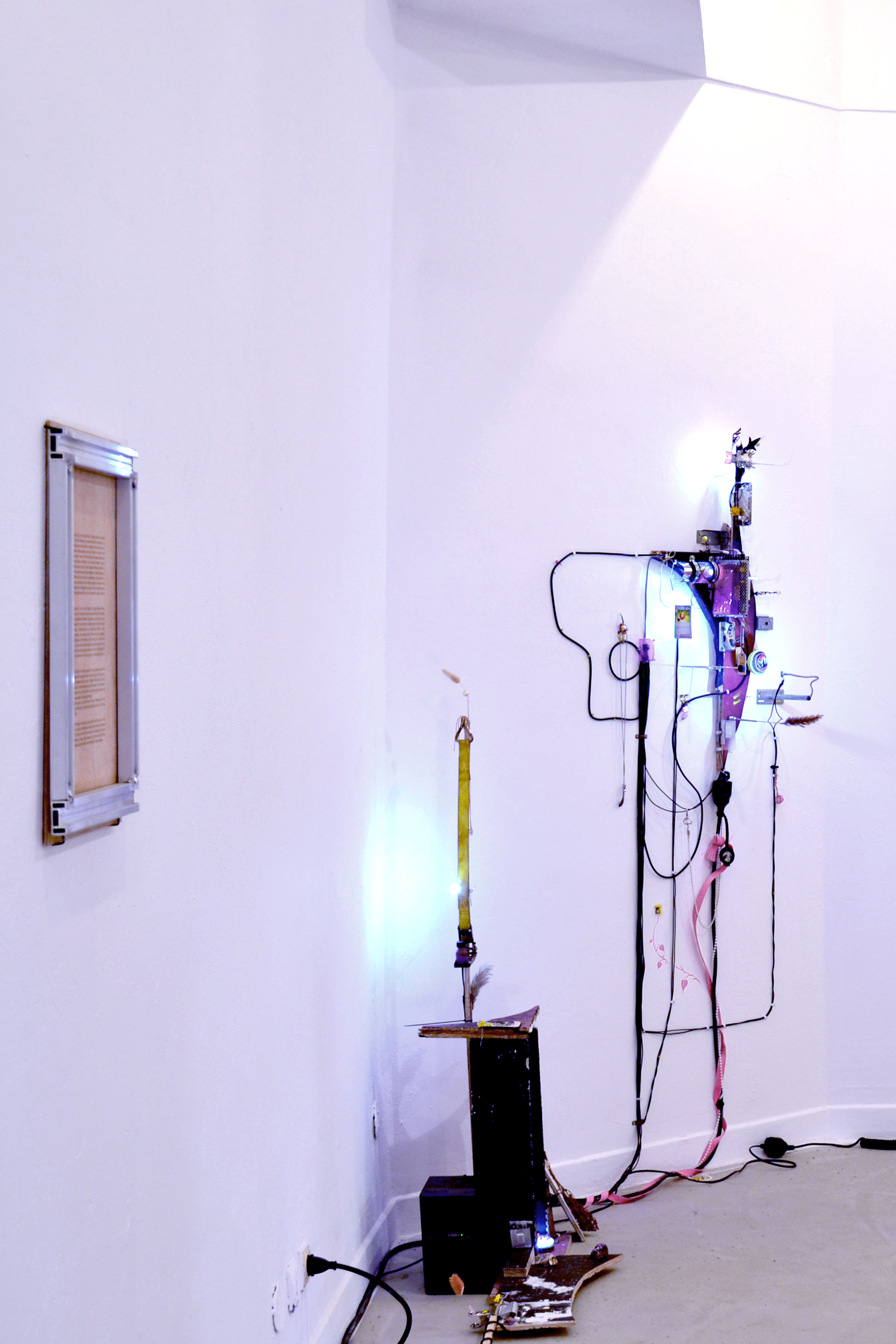 assemblage sculptural, dimensions variables, objets glanés, matériel électronique récupéré, peinture acrylique, dessins, texte gravé sur bois