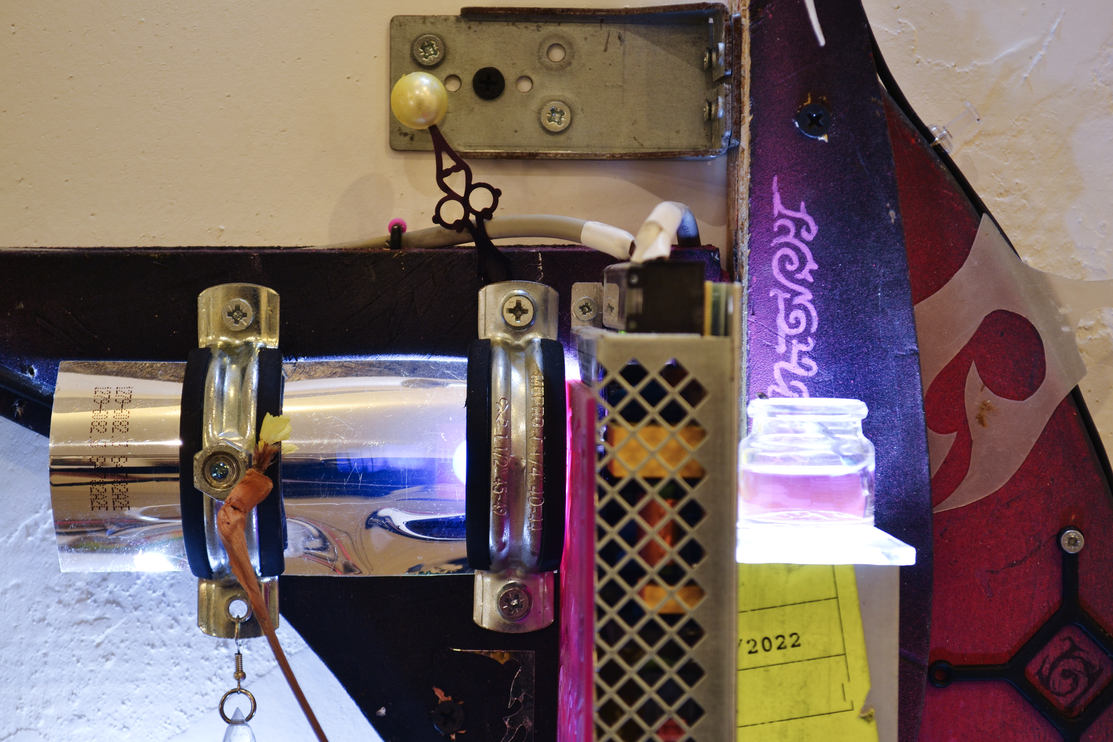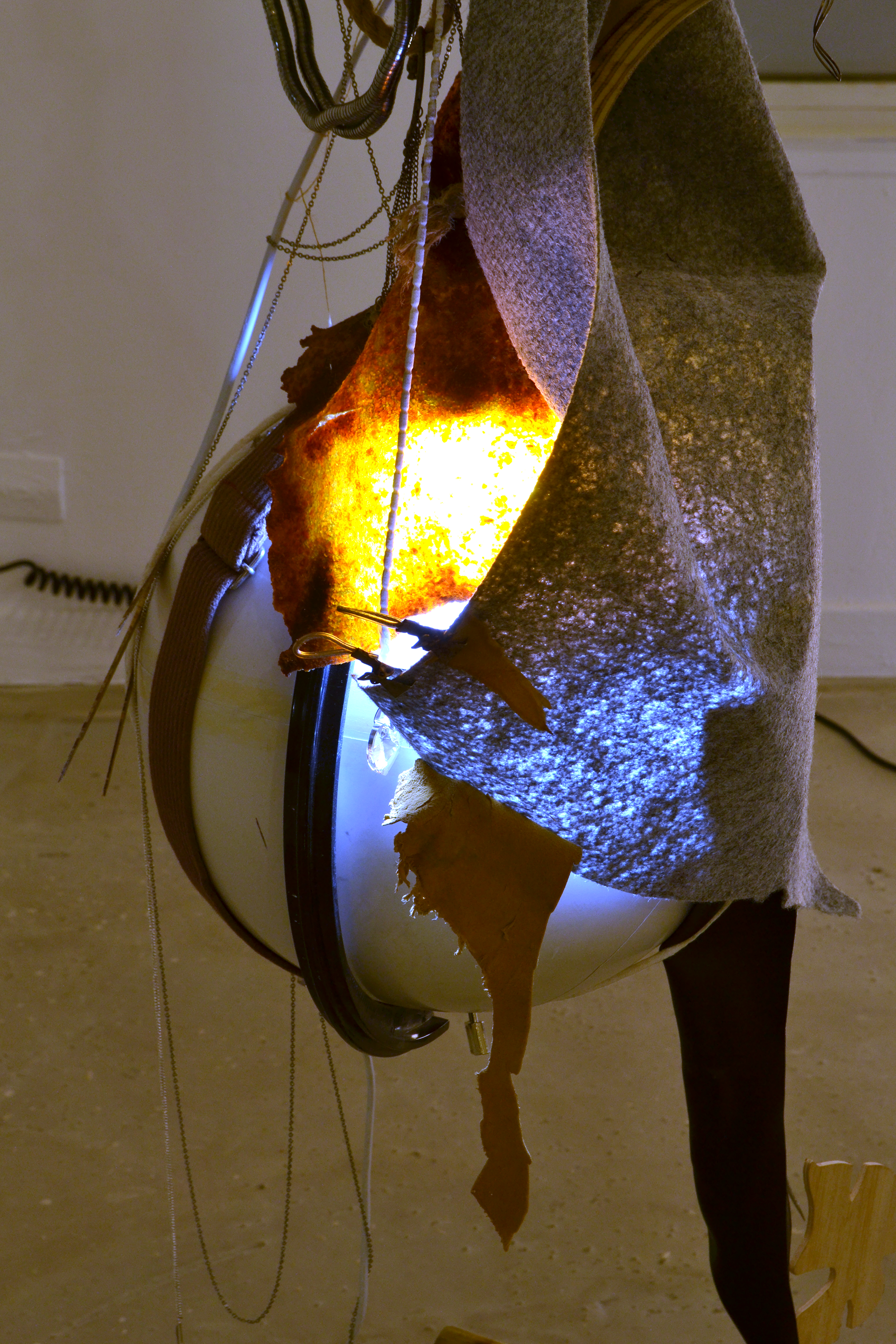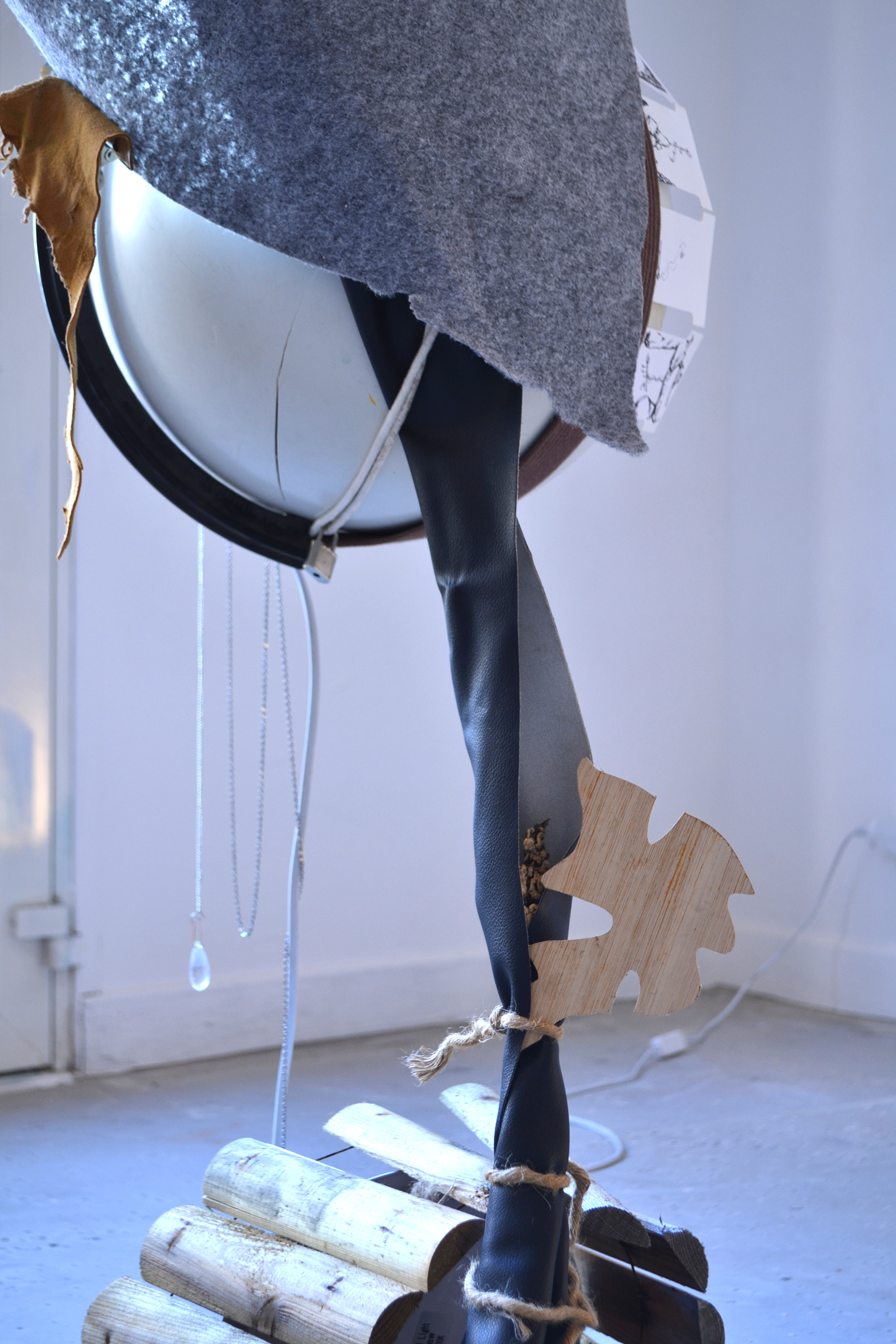 assemblage sculptural, dimensions variables, objets glanés, matériel électronique récupéré, peinture acrylique, dessins, texte gravé sur bois