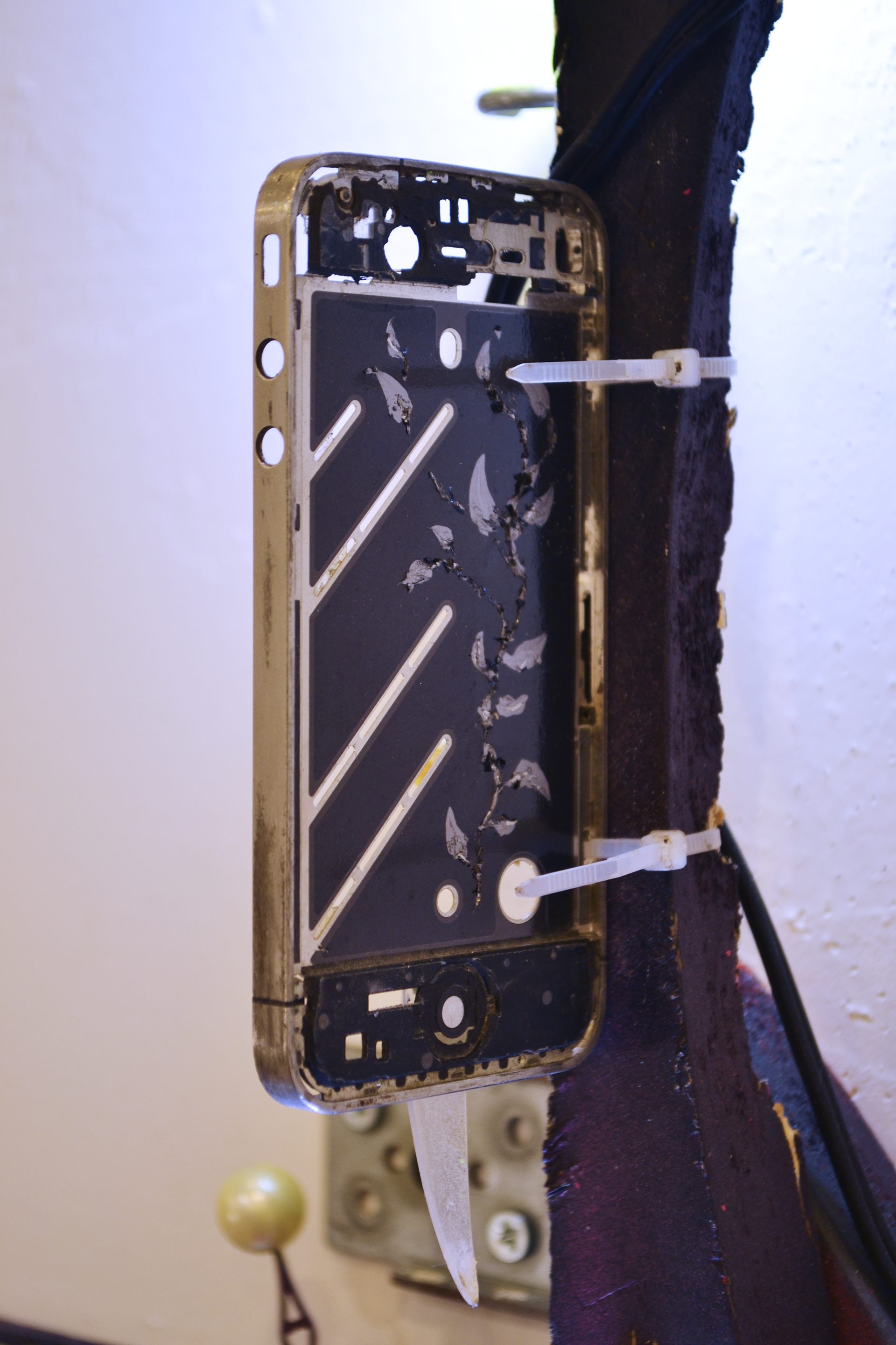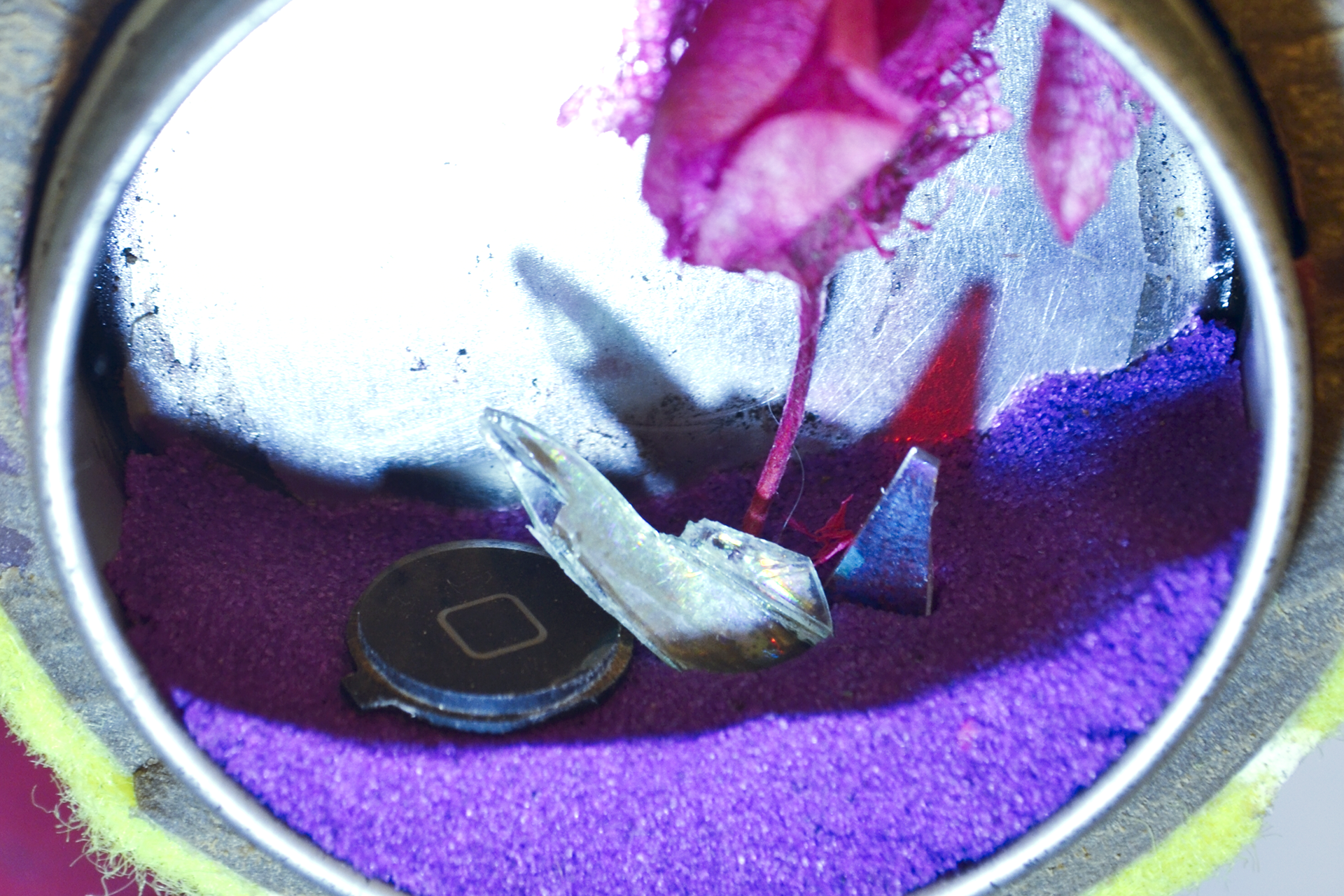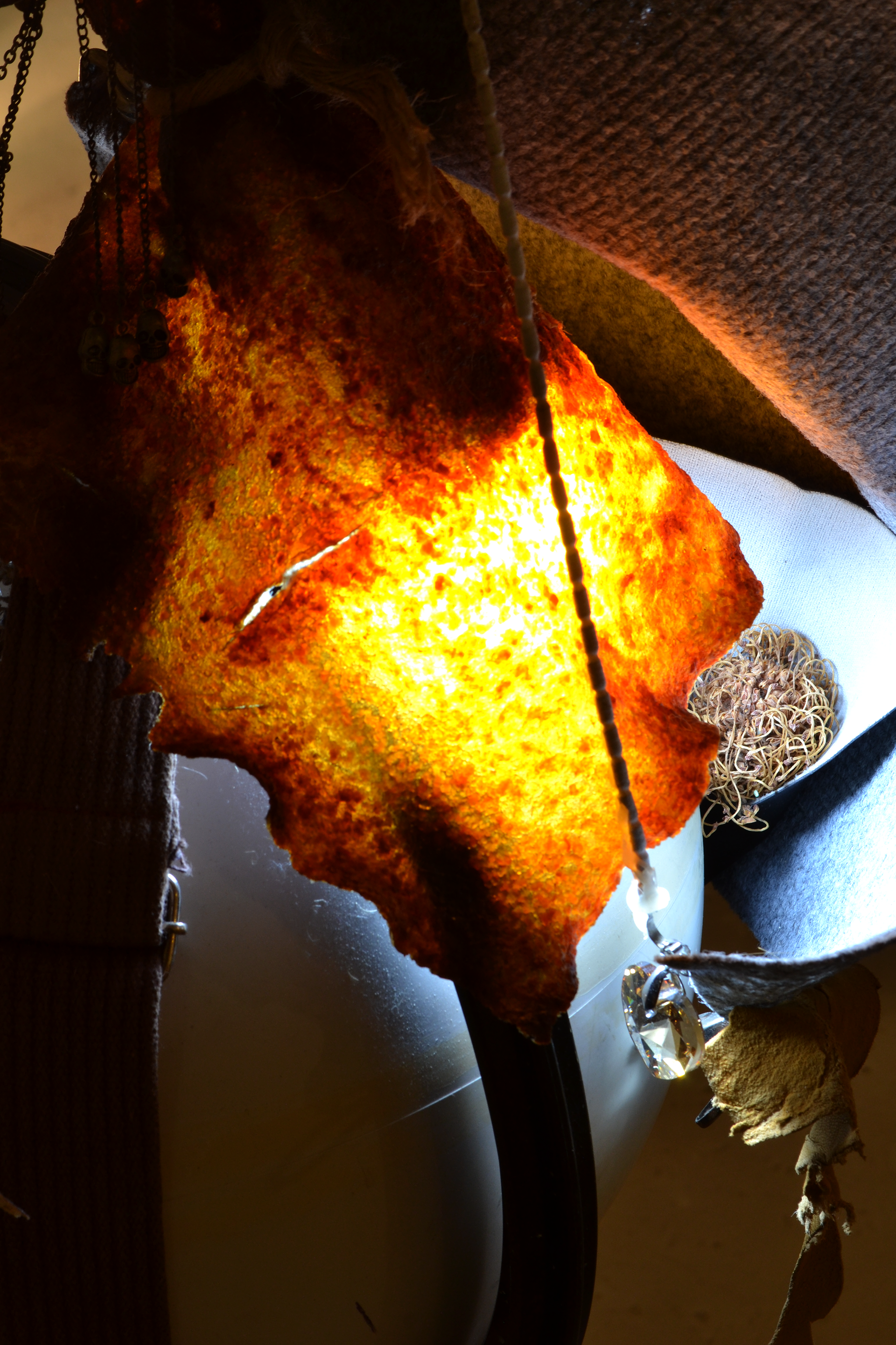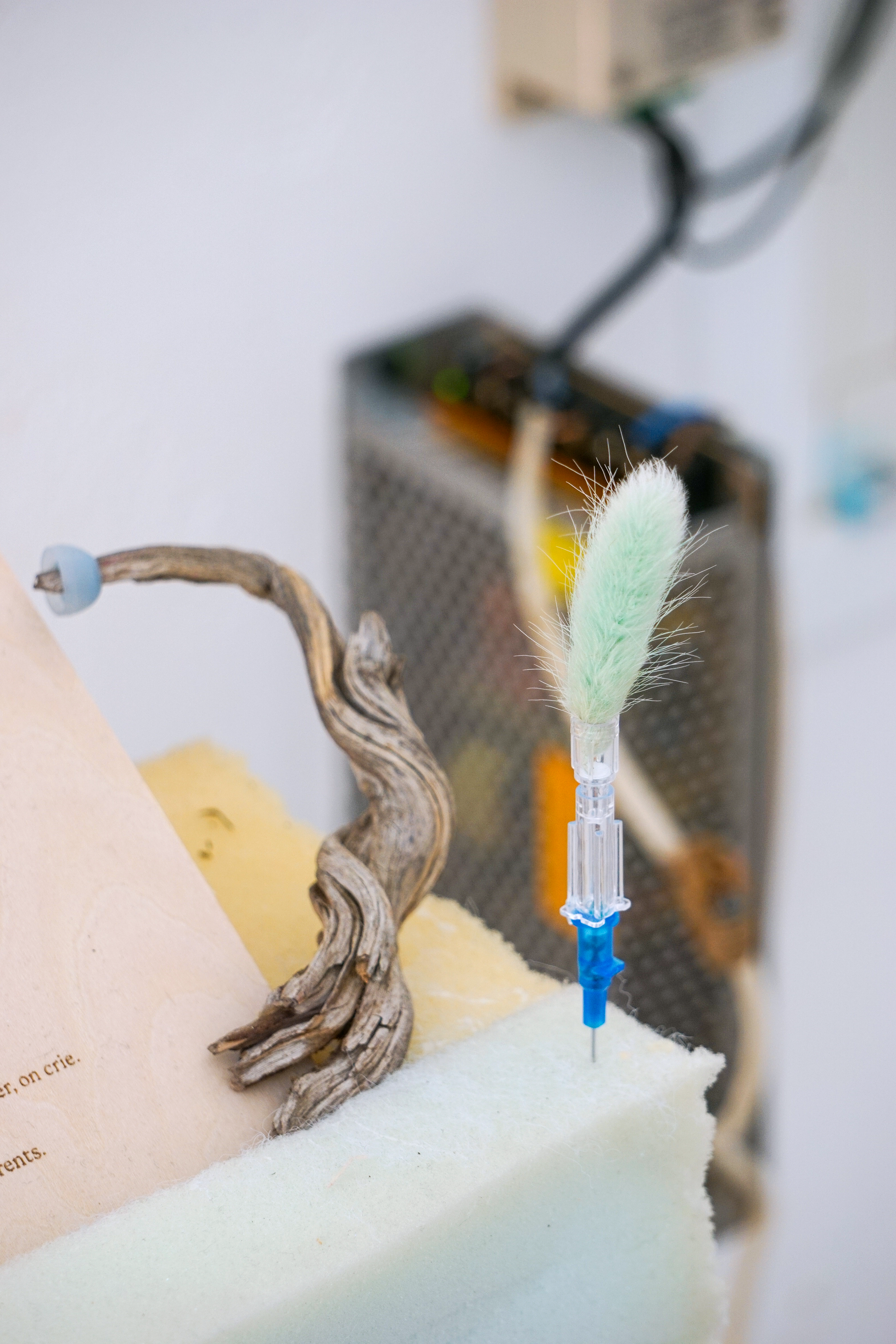 assemblage sculptural, dimensions variables, objets glanés, matériel électronique récupéré, peinture acrylique, dessins, texte gravé sur bois