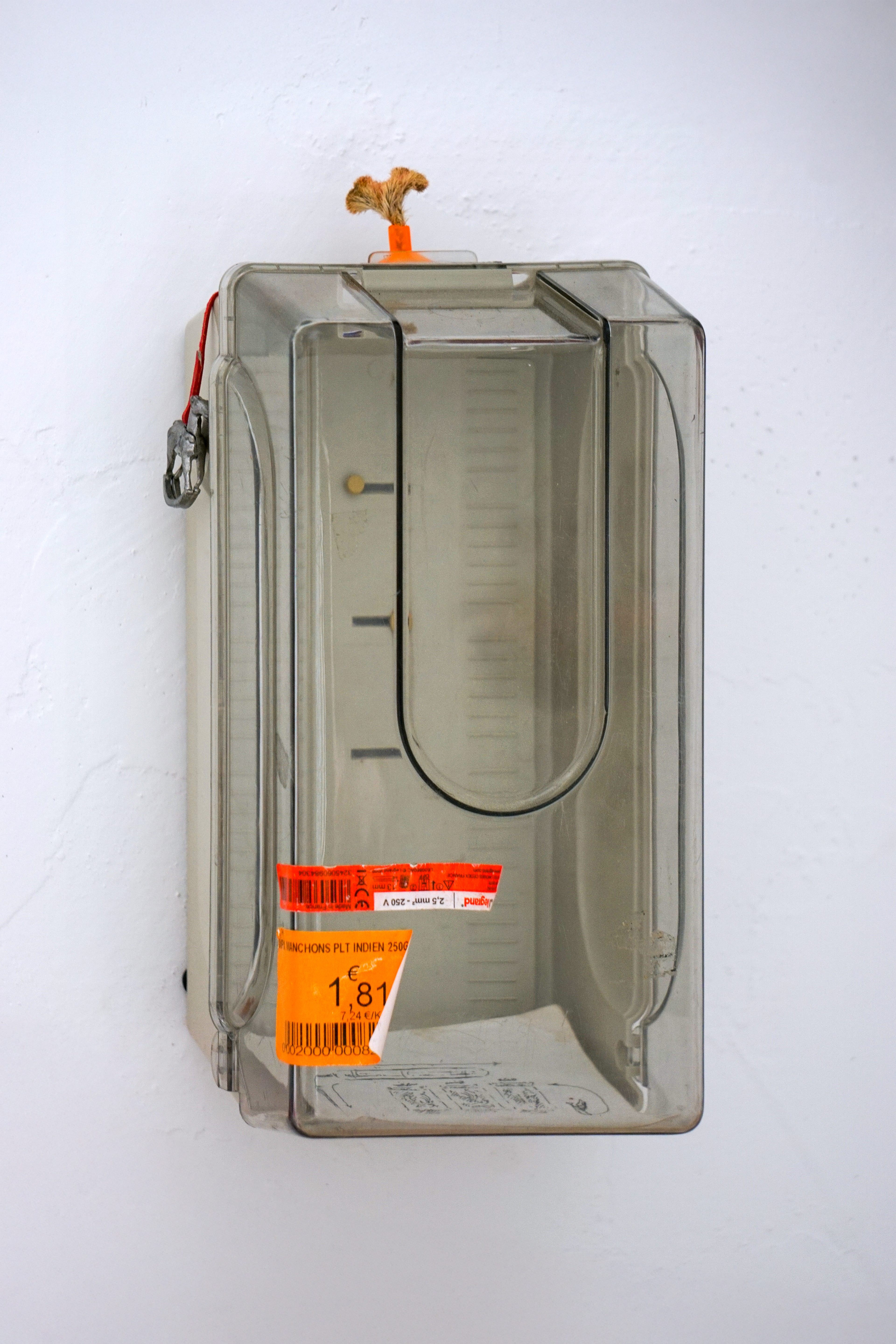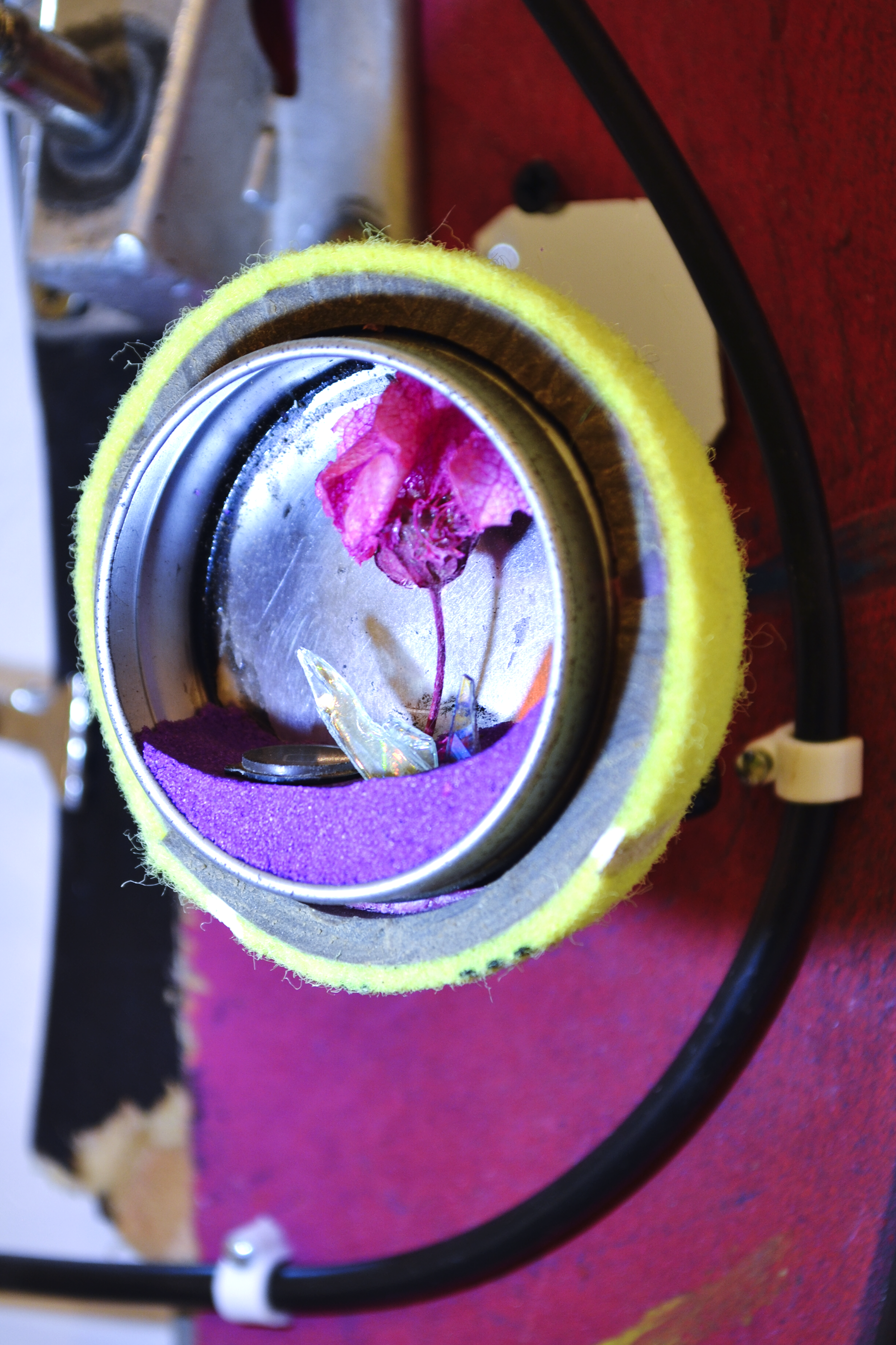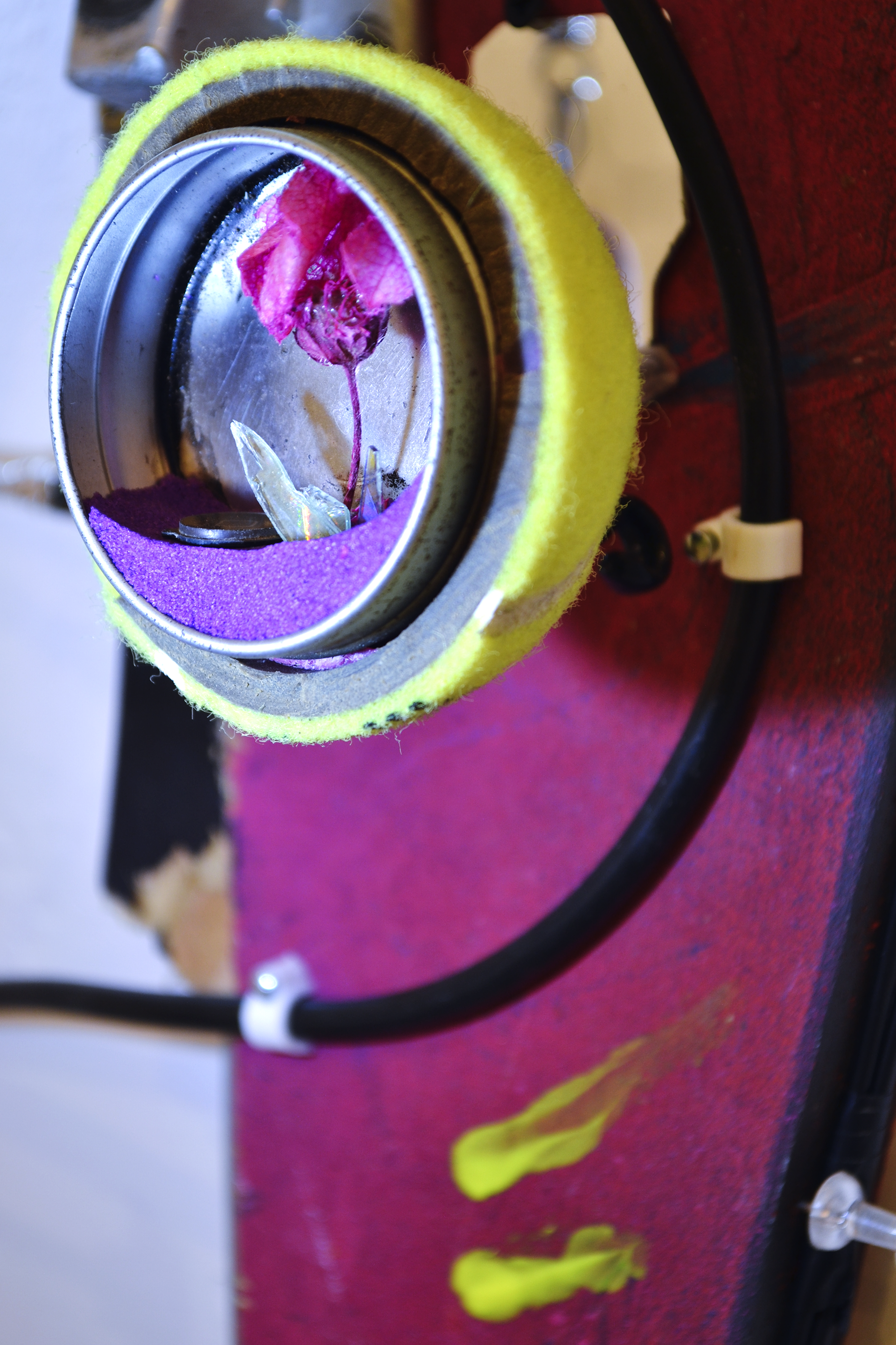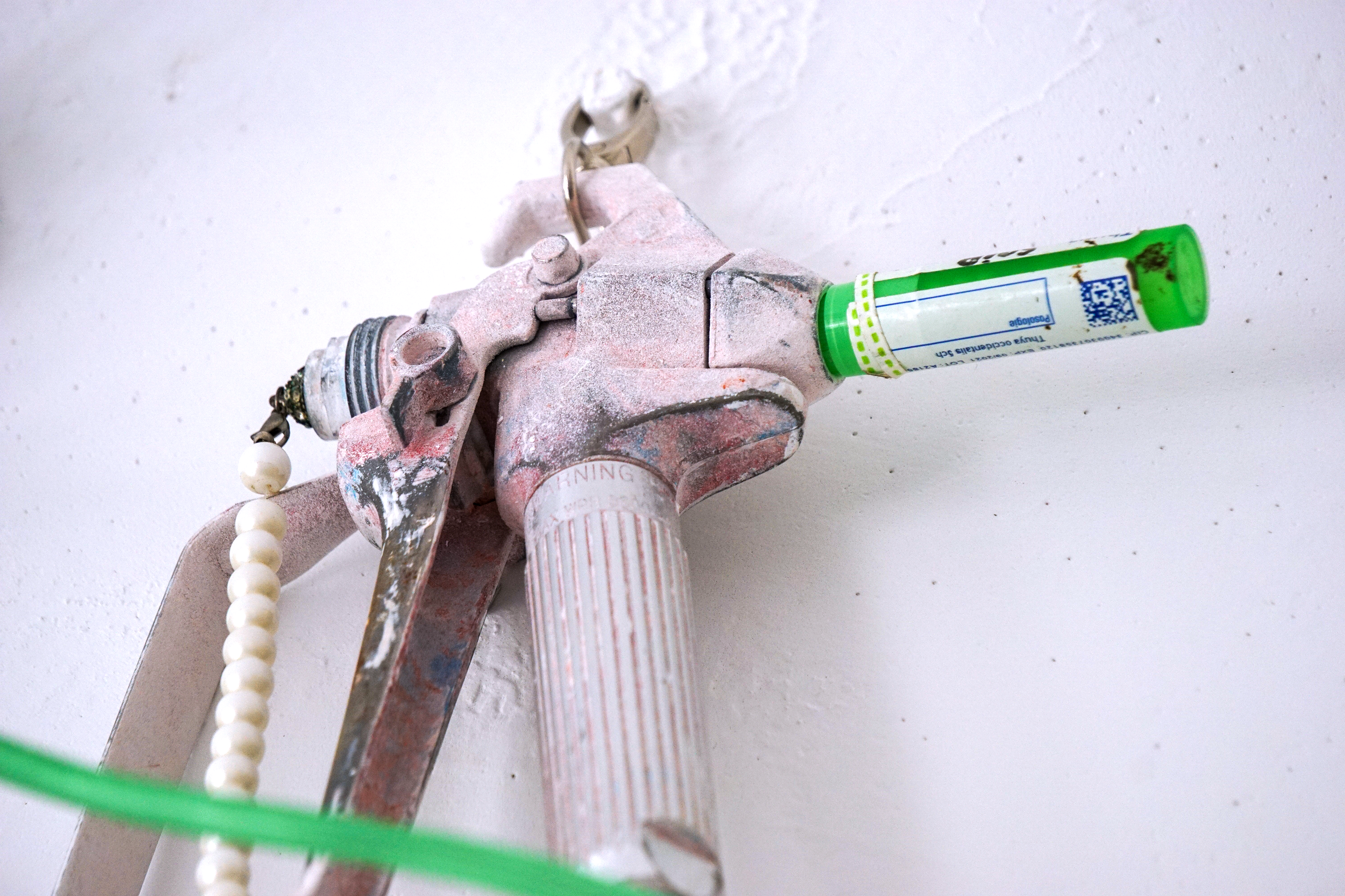 assemblage sculptural, dimensions variables, objets glanés, matériel électronique récupéré, peinture acrylique