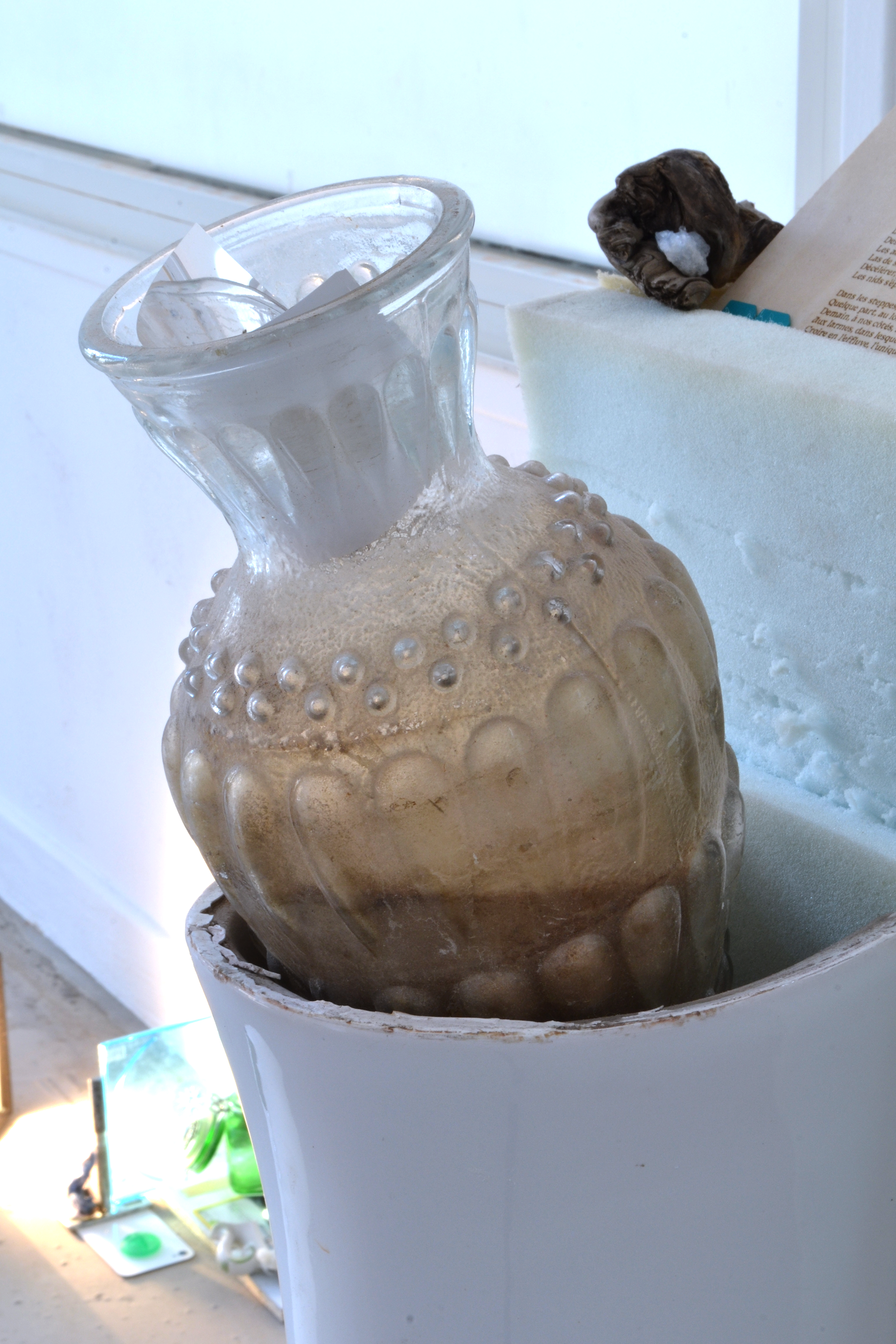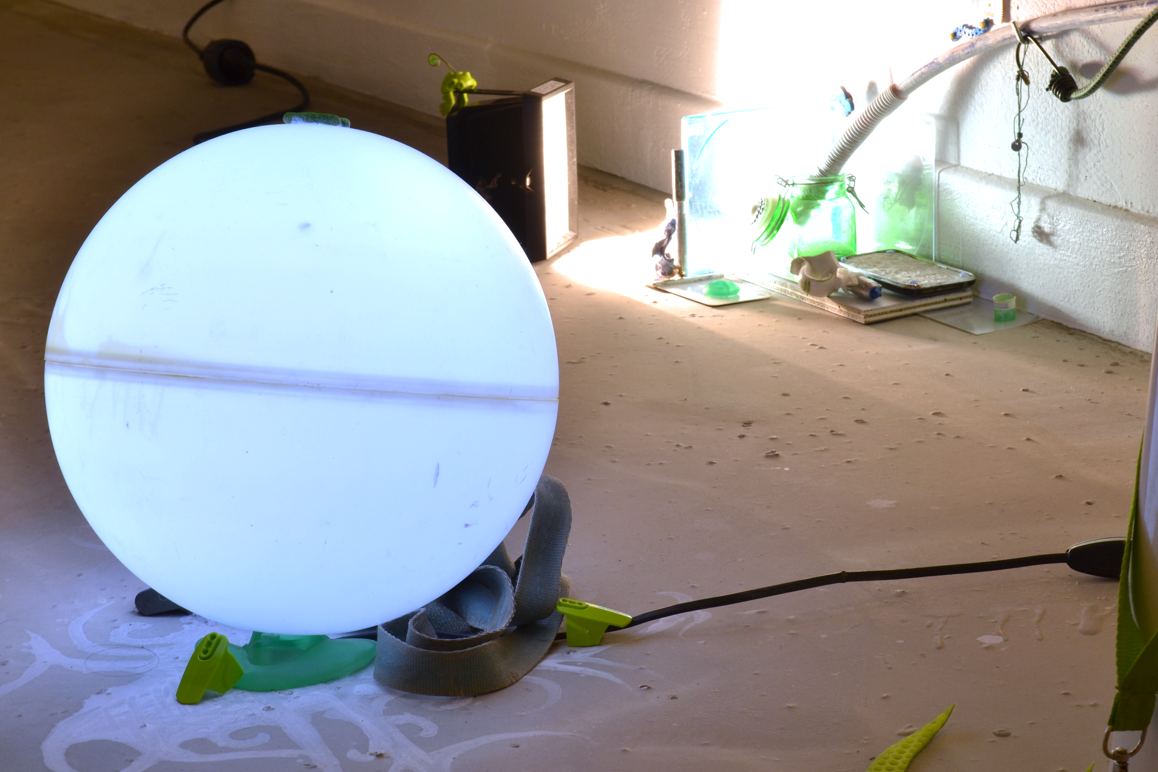 assemblage sculptural, dimensions variables, objets glanés, rétroprojecteur, vidéo 17:20 min, prises de notes quotidiennes