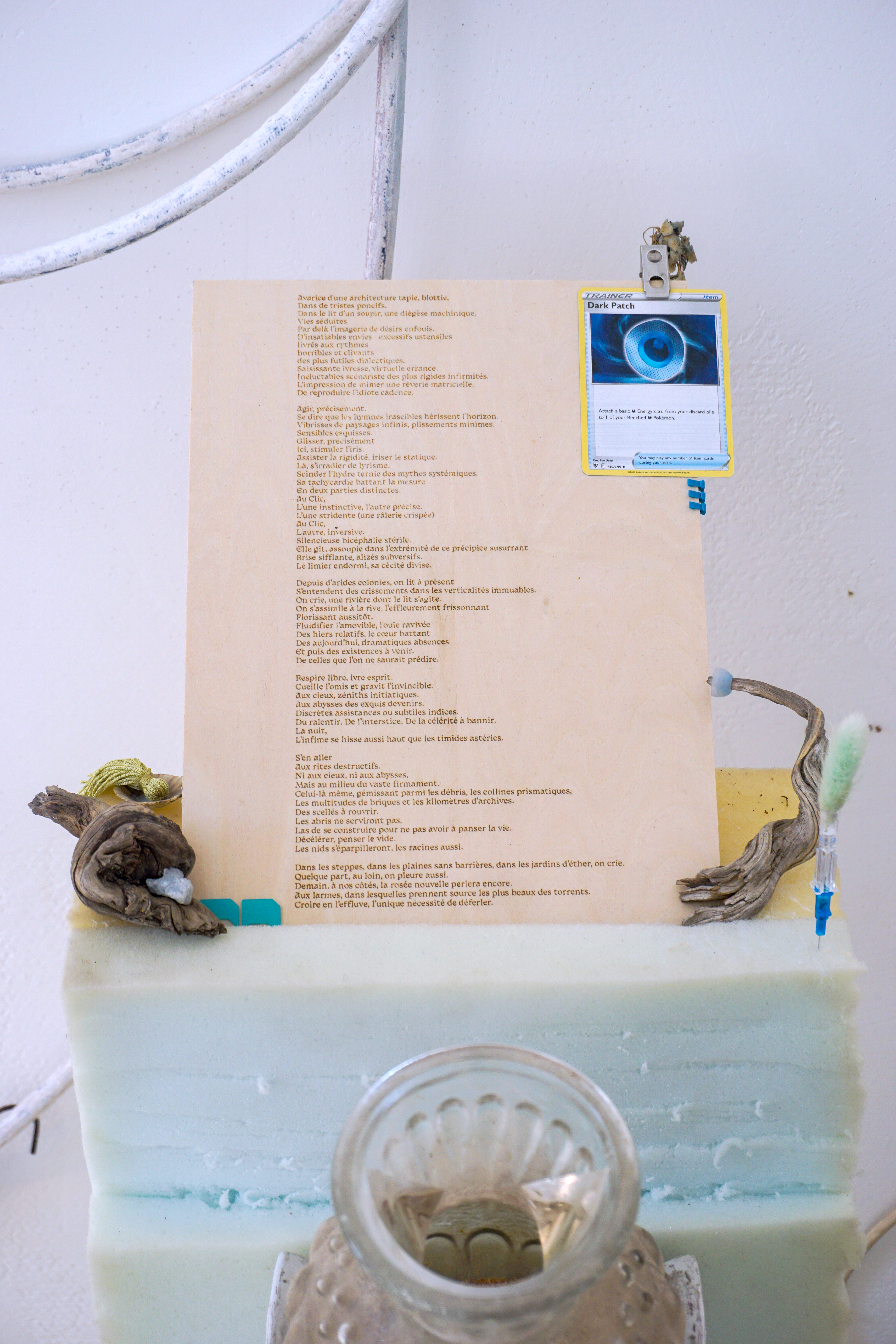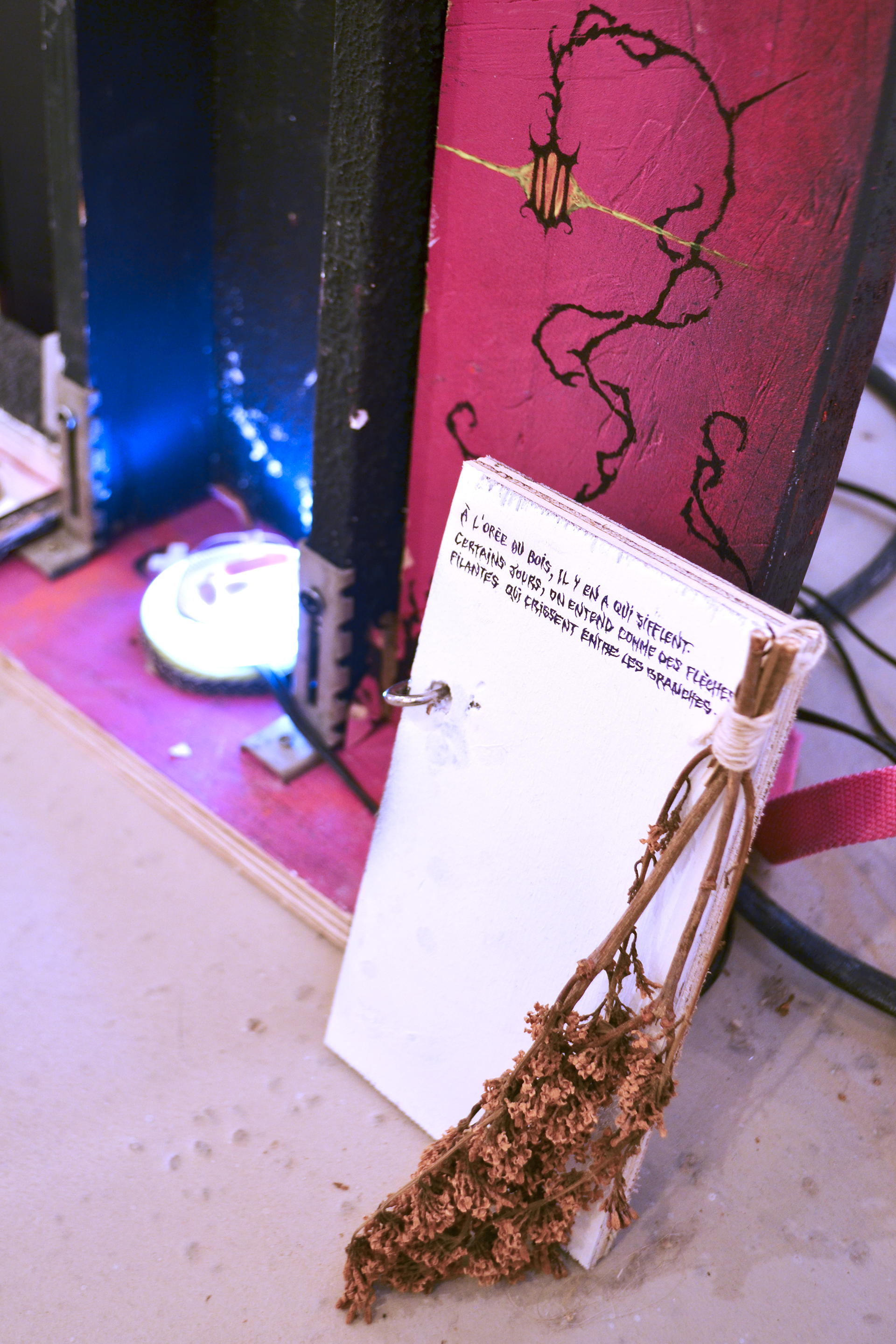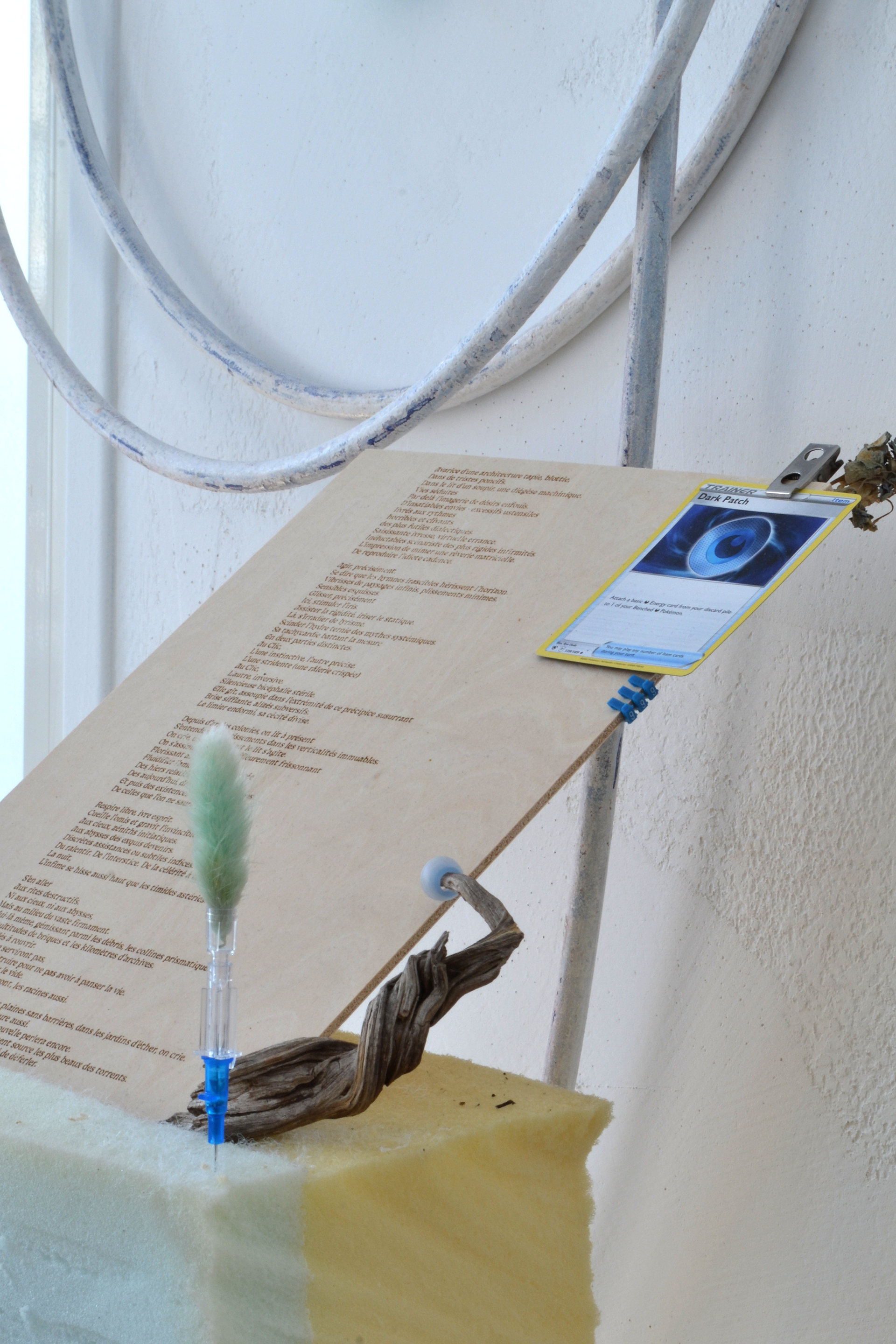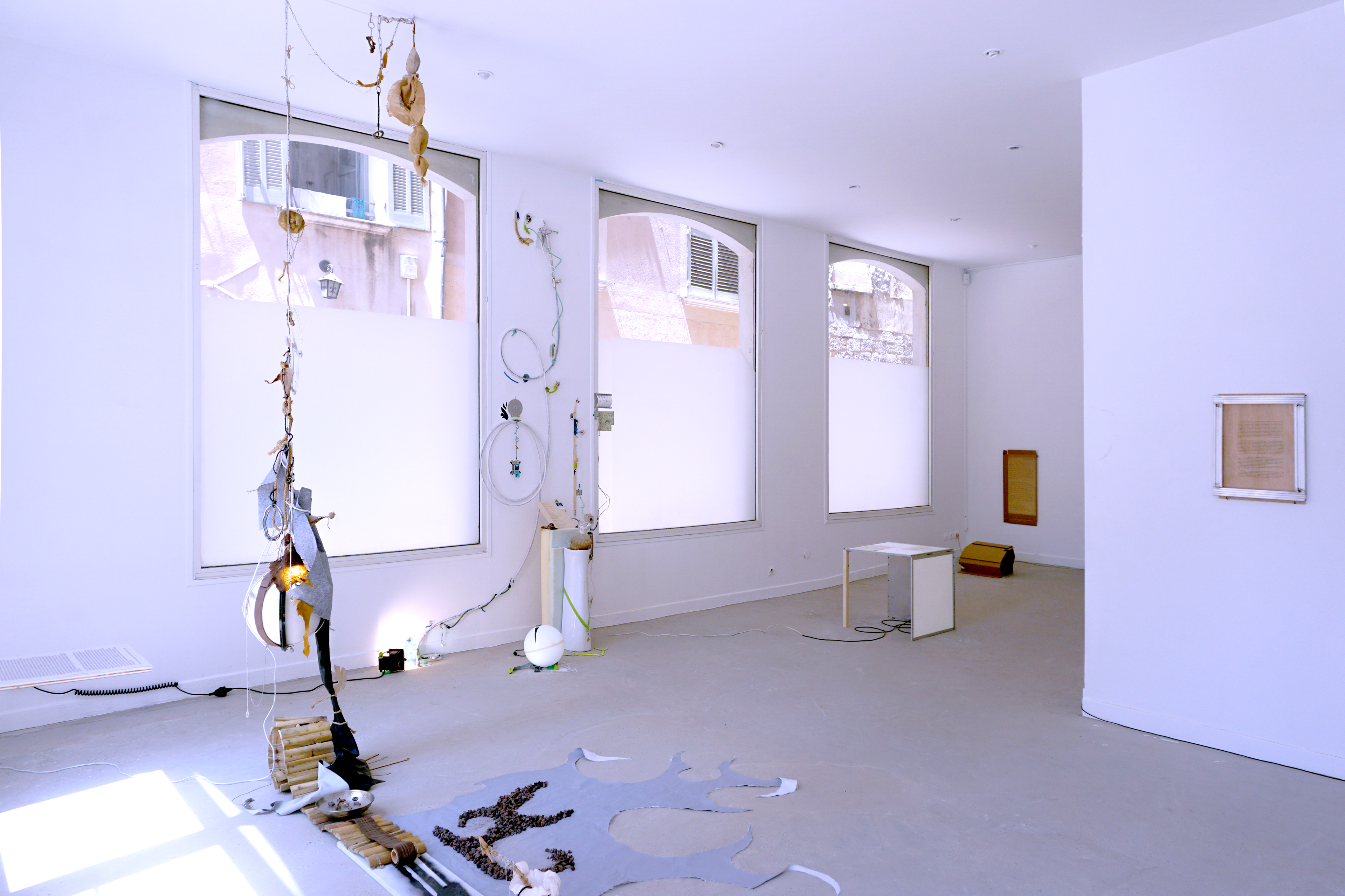 Durant ma période de résidence au sein du metaxu, j’ai opéré des sélections de matériaux que j’ai utilisé comme les colonnes vertébrales des compositions qui en bourgeonnent. Sur ces squelettes s’amoncelle une multitude de récoltes et de souvenirs issus en quasi totalité de mes années d’études à Toulon. De cette façon, les fragments nouvellement décelés activent une dynamique particulière au contexte de la résidence. Des chutes de contreplaqués ayant servi à d’anciens événements organisés par le metaxu, des rebuts que j’ai trouvé durant la rénovation de l’espace d’ateliers, des comportements observés chez les gens qui gravitent autour de la place Raimu. Tout cela constitue un archivage intriqué qui surligne une quantité de gestes infimes, de documentations délicates et de dialogues avec l’autour. Cette installation a pour vocation d’apporter une lecture intime, comme des témoignages subjectifs donnant une voix aux oublié.es. Dans ces archipels hétéroclites, le regard passe de rapport d’échelles en rapports d’échelles. Parfois, ce sera la lecture d’ensemble qui provoque quelque chose en nous, d’autres fois, ce sera le détail. Dans ce périmètre à l’allure d’un liquide sémiotique, se confrontent et dialoguent des points de vus, des ressentis, des humeurs, des observations, des récoltes, des gestes d'agencements, des parenthèses mémorielles, des cristaux nostalgiques, des curieuses balises et des sillons du sensible.