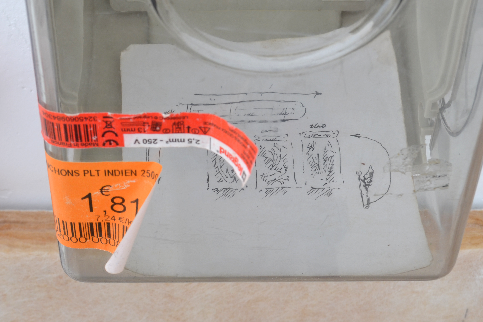 assemblage sculptural, 80x80x80 cm, objets glanés, matériel électronique récupéré, croquis de projets d'installations révolues