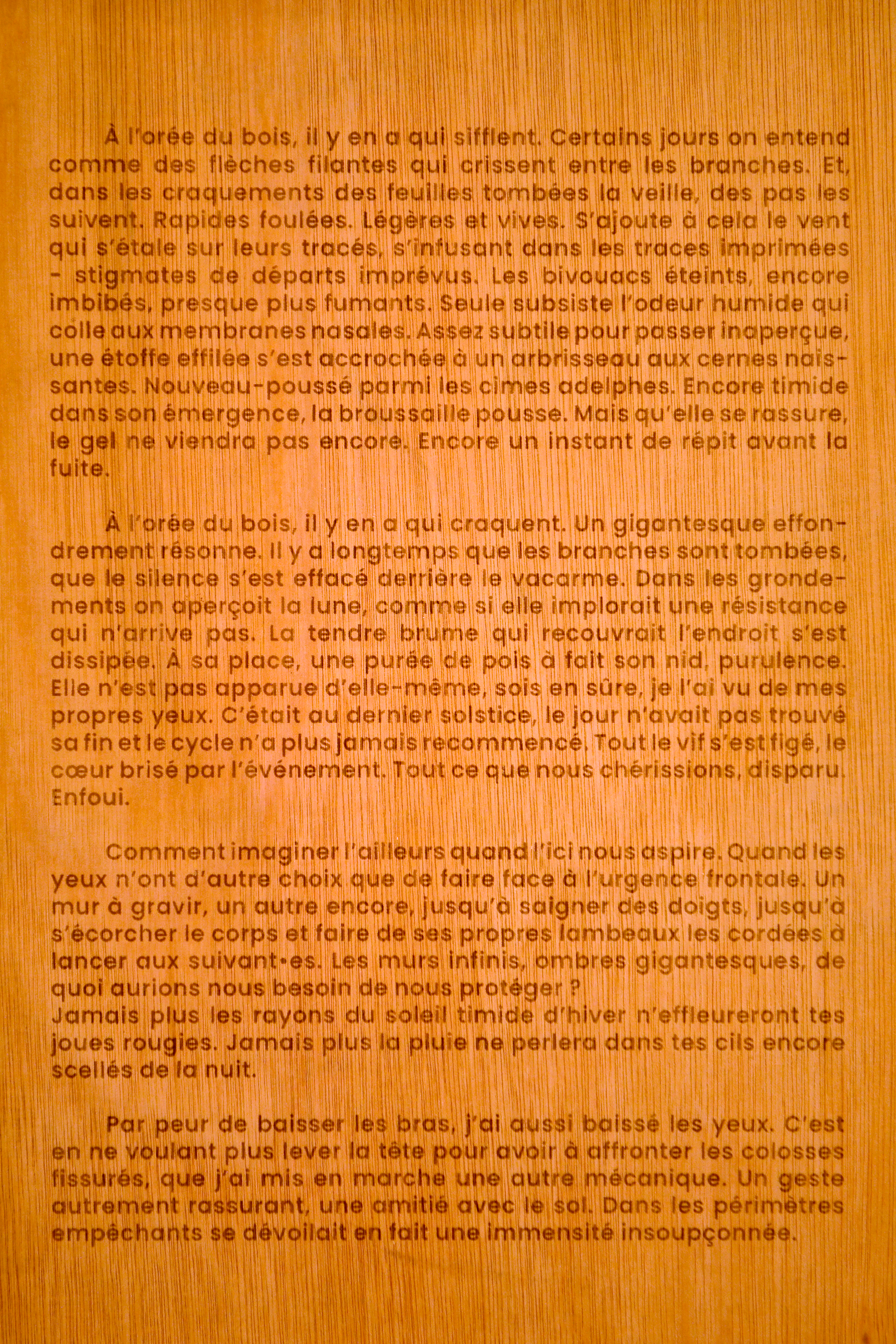 " À l’orée du bois, il y en a qui sifflent. Certains jours on entend comme des flèches filantes qui crissent entre les branches. Et dans les craquements des feuilles tombées la veille, des pas les suivent. Rapides foulées. Légères et vives.S’ajoute à cela le vent qui s'étale sur leurs tracés, s’infusant dans les traces imprimées - stigmates de départs imprévus. Les bivouacs éteints, encore imbibés, presque plus fumants. Seule subsiste l’odeur humide qui colle aux membranes nasales. Assez subtile pour passer inaperçue, une étoffe effilée s’est accrochée à un arbrisseau aux cernes naissantes. Nouveau-poussé parmi les cimes adelphes. Encore timide dans son émergence, la broussaille pousse. Mais qu’elle se rassure, le gel ne viendra pas encore. Encore un instant de répit avant la fuite.